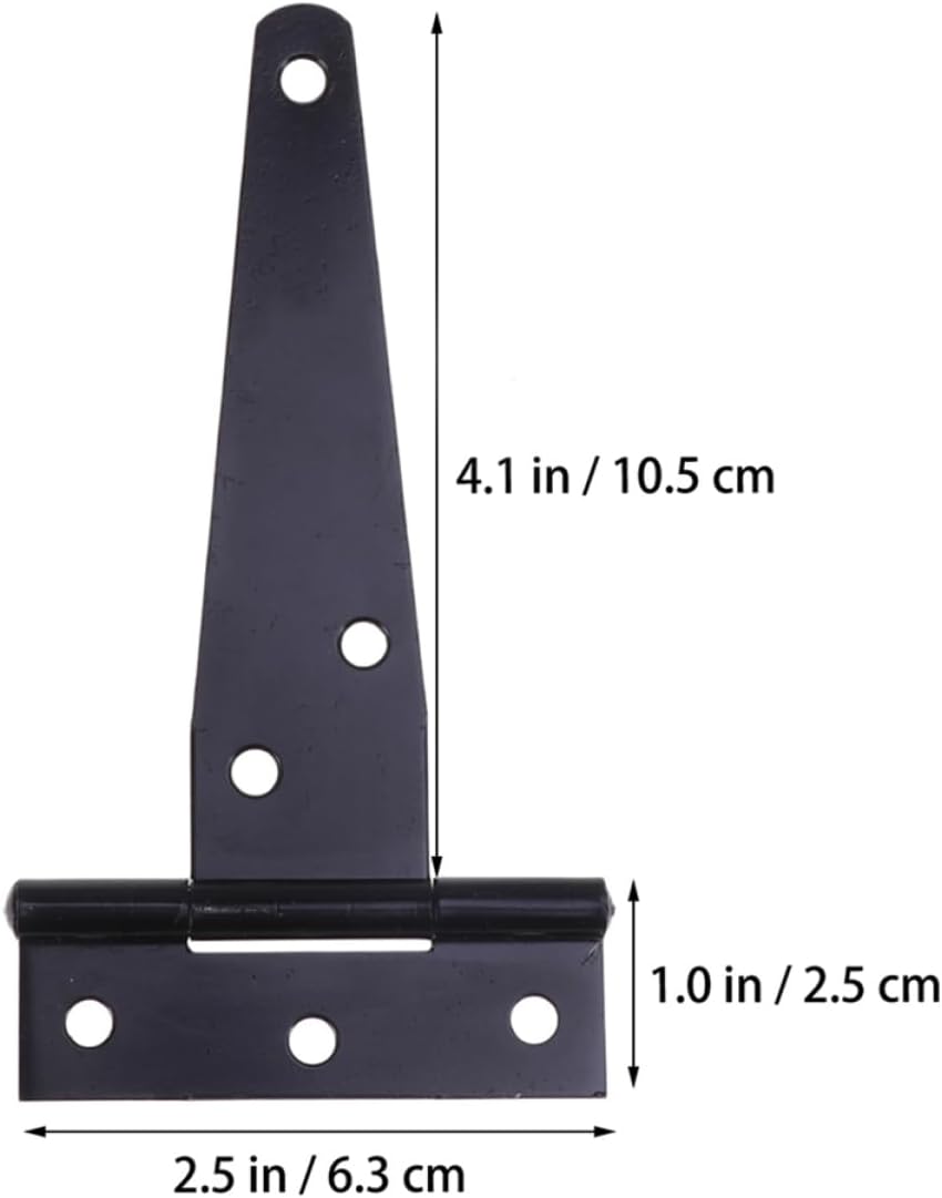 Package Include x Hinges Features - Size: About 10x6.5x0.5cm/3.94x2.56x0.197inch gate Hinge. - Material: Iron. - Color: Black. - Rugged, , resistant, flexible and silent Furniture Hinges. - Made of iron material, with galvanized process, it have more longer service life than your imagination T shape hinges. - 6 Positioned screw holes for stabler fixation use 4 inches door hinges. - Widely used in hotels, clubs, upscale clubs, wooden doors, background wall, counter doors, lightweight worktop or table and many DIY projects heavy duty hinges. - Easy to install and fast . Fit for gate/door open and close use .Goods InformationFurniture Hinges It can be used in the cabinet door, room door or barn door.gate Hinge With 6 positioned screw holes for stabler fixation, easy to install, durable in use.T shape hinges Made of iron material for durable and practical use.heavy duty hinges It have more longer service life than your imagination