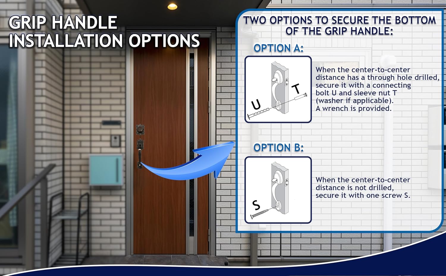 | Additional Features | This model allows two options of your choice to secure the bottom of the grip handle: Option A: When the center-to-center distance has a through hole drilled, secure it with a connecting bolt and sleeve nut (washer if applicable). A wrench is provided. Option B: When the center-to-center distance is not drilled, secure it with one screw. Use 2X22mm cap stickers to cover previous holes if required. |