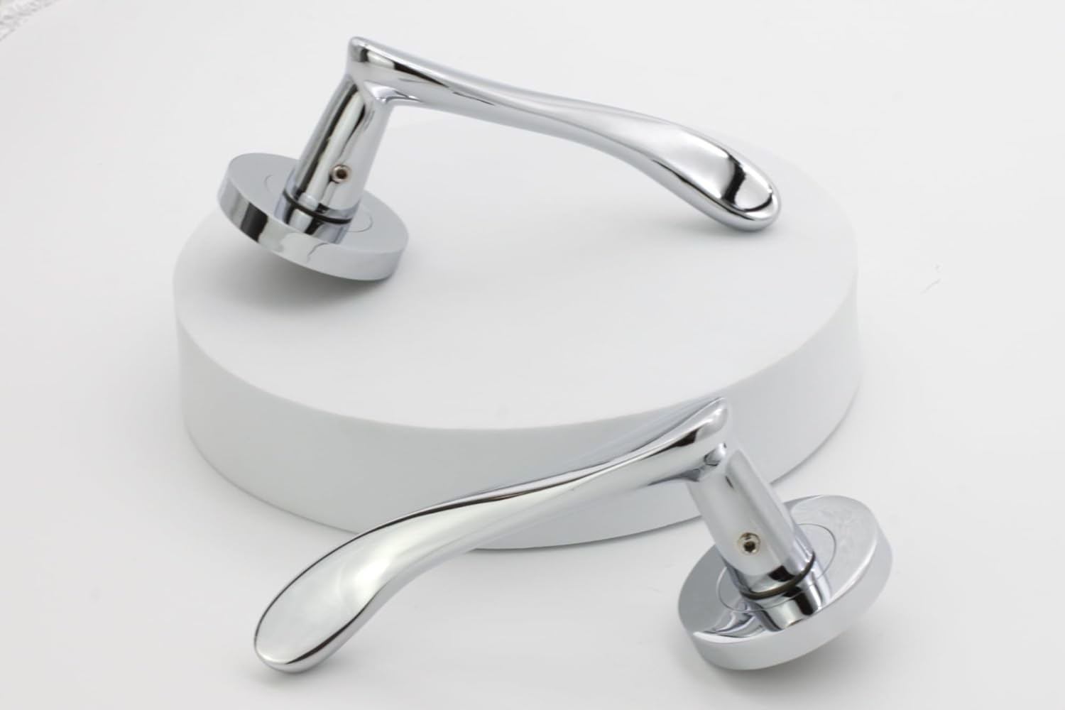 Rosemarie Polished Chrome Interior Solid Brass Lever on Rose Door Handles Set This modern lever door handles on a concealed sprung rose with curved lever and threaded ring based on solid brass material makes an impressive addition to any interior door. They are so comfortable and easy to use as they can be used on their own, for regular passage doors, or can be combined with locking or bathroom escutcheons if security/privacy is required. This lever door handle with its unified look and modern design is perfect for any style of door. Manufactured from high quality solid brass material using traditional casting methods which ensures strength and durability for a long-life use. You can feel the quality with the brass weight once you grasp them. It comes with heavy duty spring that enables a smooth movement, allows the handle returns to the horizontal position after use. The lever design provides a comfortable grip and easy operation, making these door handles ideal for use in high traffic areas. They can be used with a standard tubular latch for a normal door opening and closing, with a mortice lock or euro profile sash lock. Designed to suit variety of door types including wood, metal, and uPVC. They can be used in both residential and commercial settings and also on both left and right-handed doors. Attractive polished chrome finish with smooth surface adds a decorative feature to it and enhances the overall look and feel of your space. It comes with protective coating that prevents rust and corrosion hence they are suitable for both interior and exterior use. Supplied in pairs for both sides of the door with complete fixings for easy hassle free assembly. Pack Includes: 1 x Pair of door handles Bolt through screws Allen key 7mm Spindle Screws Specifications: Material: Solid Brass Finish: Polished Chrome Lever Length: 123mm Projection: 58mm Rose Thickness: 10mm Rose Diameter: 52mm Spindle Size: 100mm x 7mm