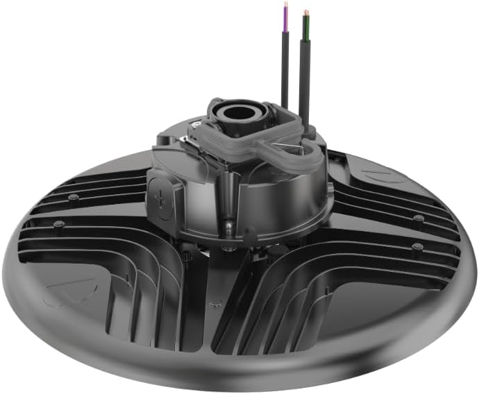The Lithonia Lighting REBL Round High Bay LED Light is designed for versatile and efficient illumination in industrial and commercial spaces. With 24,000/27,000/30,000 adjustable lumen output and switchable white color temperatures (3500K/4000K/5000K), this high bay light offers 9 potential configurations within a single fixture, making it perfect for various lighting needs. Equipped with high-efficiency LEDs that provide up to 187 LPW, this LED shop light is ideal for work environments. The 0-10V dimming driver allows you to adjust brightness levels down to 10% for precise control of your lighting needs. The micro-prism optics deliver uniform and comfortable illumination, ensuring that every corner of your space is brightly lit without glare. Built to last, this fixture is UL/C-UL listed, Wet location rated, IP66, NEMA 4X, and NSF Splash Zone 2 certified, providing the durability and safety required for harsh environments. With an impressive 100,000-hour lifespan and greater than 70% LED lumen maintenance (L70>100,000), this light is engineered for long-term performance. Installation is easy and secure with the patented flip hook and safety latch, allowing for quick mounting with a ¾" threaded pendant mount. Compact and rugged, the REBL Round High Bay LED Light measures 14.6" x 14.6" x 7.7" and is backed by a 5-year limited warranty, making it a reliable and efficient choice for lighting warehouses, factories, and large commercial spaces.