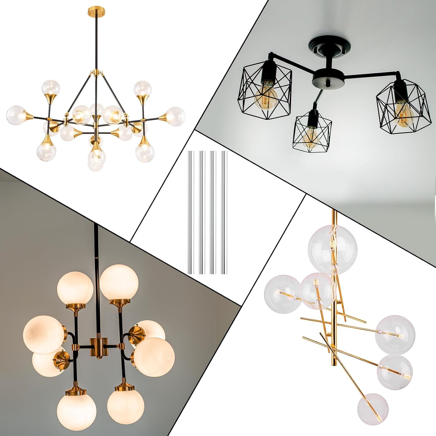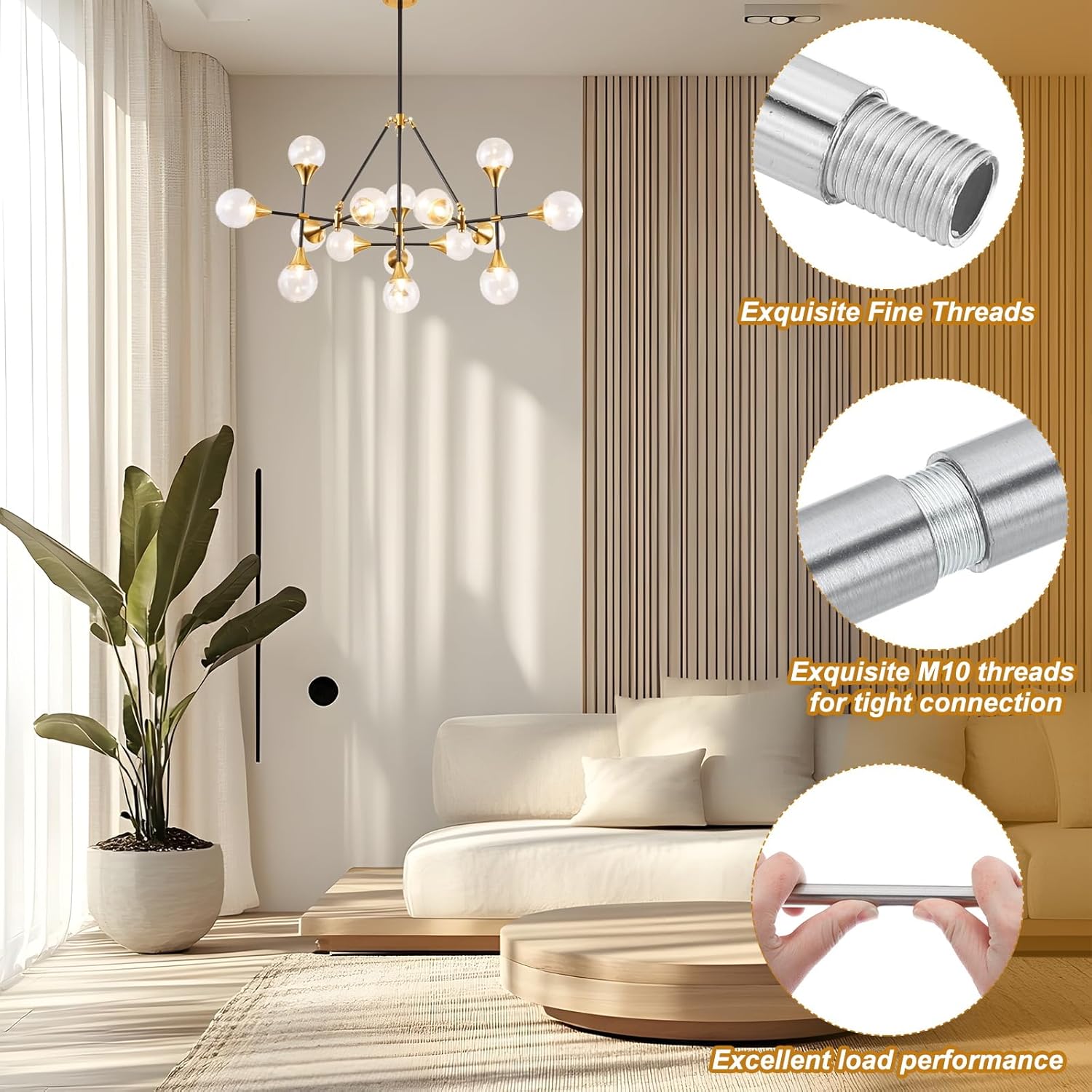 These lamp extension rods and lamp pipe nipple kits are common light fixture accessories for repairing, extending, and DIY-making ceiling lamps, chandeliers, pendant lights, wall lamps, mirror lamps, island lighting fixtures, etc.SpecificationMaterial: MetalColor: Silver ToneFine Thread Size: M10 x 1mmLamp Extension Rod Size: 100 x 11 mm/3.9 x 0.4 Inch(L*OD)Lamp Pipe Nipple Length: 25mm / 1 InchPackage List: 4 Pcs x Lamp Extension Rods; 4 Pcs x Lamp Pipe NipplesAdvantageDurable Material: Constructed from durable metal material, this lamp extension rod is sturdy, robust, and has a great weight-bearing capacity to support various light fixtures sturdily without deformation or damage.Long Lifespan: The surface has been treated with high-temperature baking paint to resist oxidation, moisture, and rust to ensure that it will not rust after long-term use.Exquisite Workmanship: With a smooth surface and simple stylish appearance, these lamp extension rods can match various types of lamps.InstructionThe M10 fine thread can fit with most lamps. Easy to install, no other tools needed. Each lamp extension rod can connect two threaded pipes on both ends.Note: Please check the thread size before purchasing.