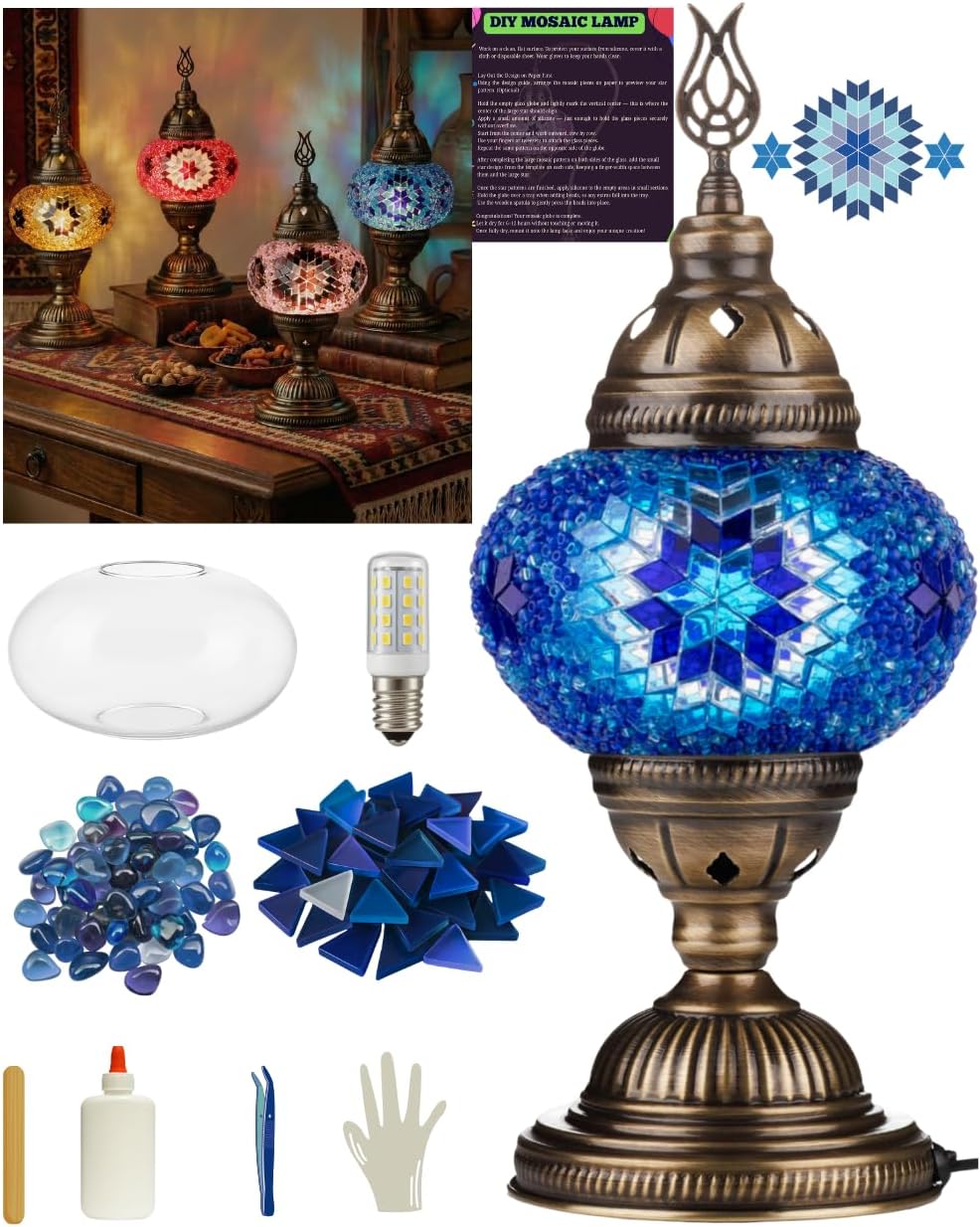 Transform your space with this DIY Turkish mosaic table lamp kit that lets you create a stunning, personalized lighting masterpiece. The kit comes complete with everything needed: an elegant metal lamp body featuring an antique brass finish, a glass lampshade ready for your artistic touch, colorful mosaic glass pieces, decorative glass beads, and all the essential tools including silicone adhesive, tweezers, a spatula, and protective gloves. A design template is included to guide your creative process, making this project accessible for crafters of all skill levels. The lamp is compatible with any standard candelabra LED bulb, giving you the freedom to choose the brightness and color temperature that best suits your space. Perfect for adding a touch of Mediterranean charm to any room, each lamp becomes a unique piece of functional art. This engaging DIY project offers a wonderful way to express your creativity while creating a beautiful accent piece for your home.