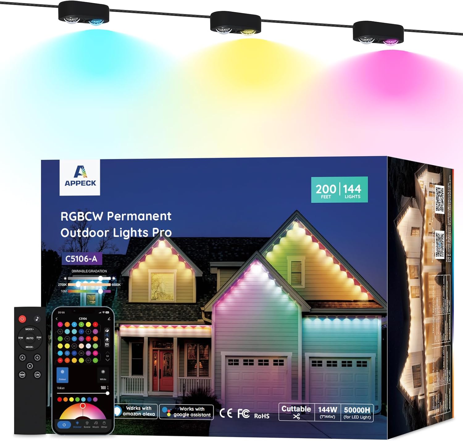 | Included Components | 16.4ft Permanent Outdoor Lights x 6, Control Box x1, Power Adapter x 1, Remote Controller x 1(without AAA batteries), 9.8ft Extension Cord x 2, Buckle x 80, Extra 3M Adhesive x 4, User Manual x 1, Installion Guide x 1, Wire Connector Set x 1 |