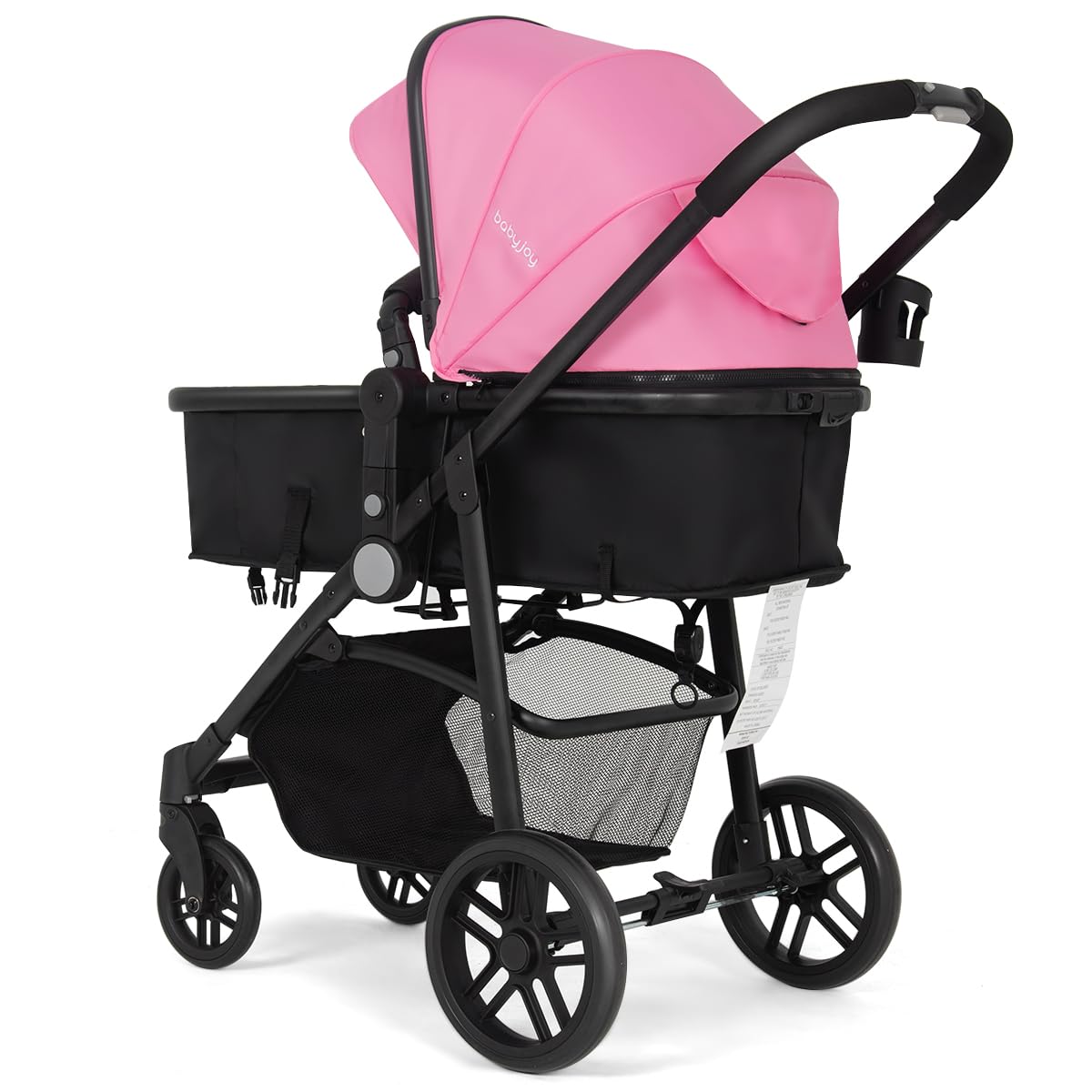 Description:Let the baby explore the world with our convertible baby stroller! This high landscape infant stroller features an adjustable canopy and a removable foot muff that shields your little one from the bright sunshine or cold wind. The freely adjustable backrest can meet different comfort needs. A key feature is the reversible seat, which allows your baby to face you for one-on-one interaction or face forward to take in the surroundings. Safety is also a priority with the secure 5-point harness, designed to keep your child secure during your outings. The front universal/directional switchable wheels provide ease of steering on different terrains. And the rear wheels with one-step foot brake allow for immediate stopping and reliable handling. Moreover, the one-hand folding design makes it easy to carry the stroller anywhere. Features:Adjustable backrest and canopy keep the baby cozy and protectedHigh landscape design provides a wider view to explore the world Reversible seat adapt to the baby's growing needs5-point harness and bumper bar ensures high securityFoot muff keeps the baby warm for those cold days Easy steering with universal/directional switchable front wheelsRear wheels with one-step foot brake for quick stoppingOne-hand folding feature for effortless storage and carrying Storage is ample with a spacious bottom basket Comes with removable bumper bar for easily take your baby outSpecifications:Color: Black/Grey/Coffee/PinkMaterial: Metal, Oxford Cloth, PPOverall Dimension: 37"x 15"x 43"/97 cm x 38.5 cm x 110 cm (L x W x H)Folded Dimension: 16"x22"x 43"/40 cm x 57 cm x 110 cm (L x W x H)Sleeping Basket Dimension: 31"x 15"x 8"/80 cm x 38 cm x 20 cm (L x W x H)Weight Capacity: 33 lbs/15 kgNet Weight: 21 lbs/9.5 kgRecommended Age: 0-36 Months Package Includes:1 x Baby Stroller1 x Instruction
