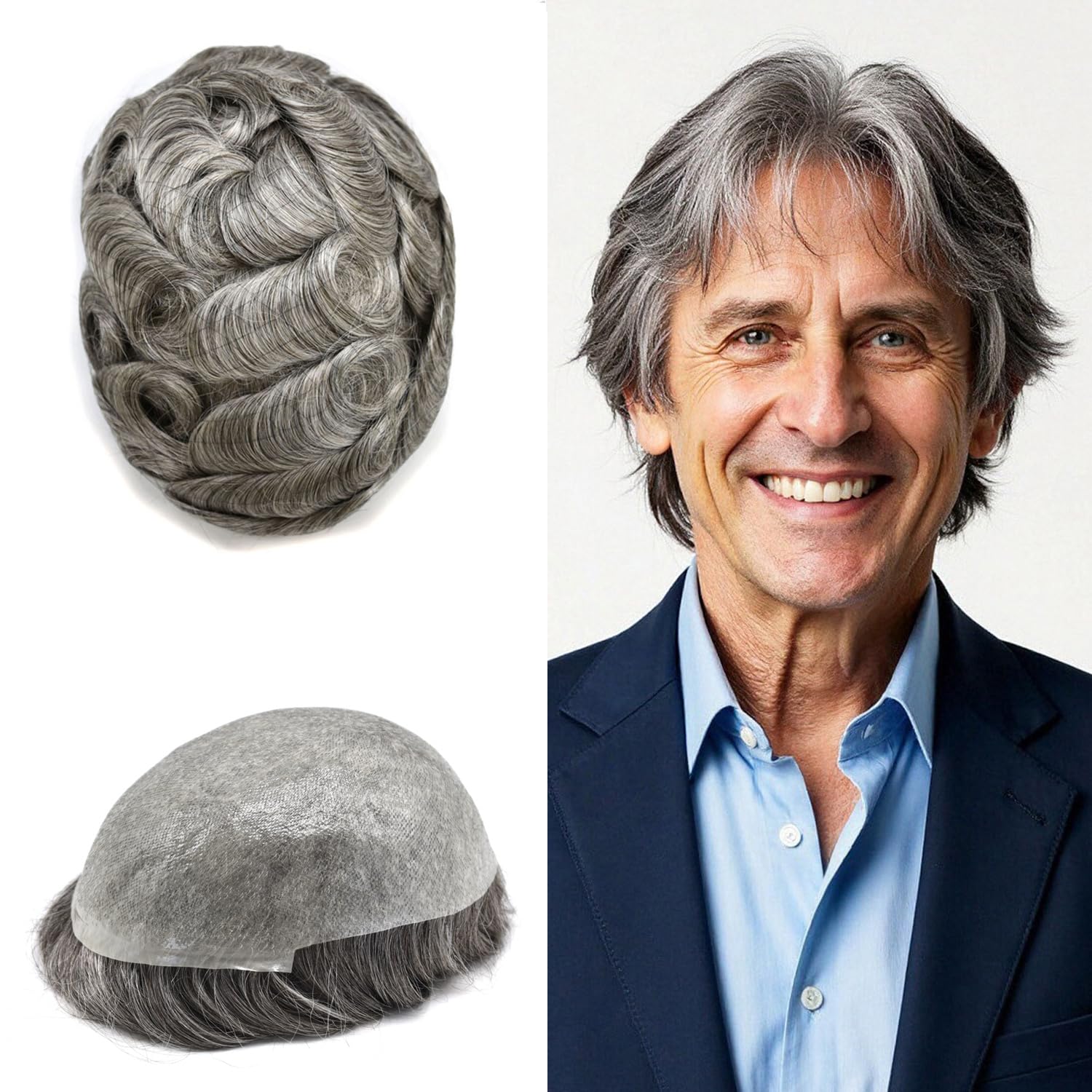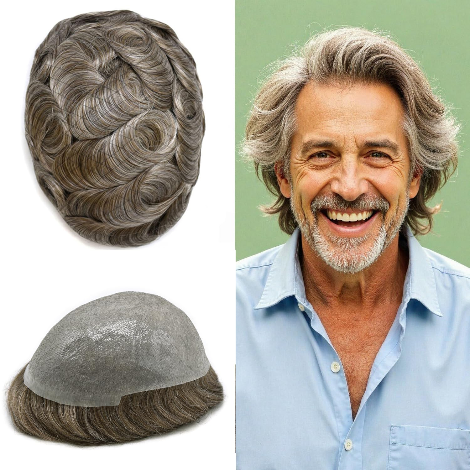 Base Design:Full Poly base 0.06mm.V-LOOP all around,Knotless. Natural Hairline.Model Number: Ultra thin skinHair Type/ Material: 100%Human HairGrey Hair Type: Synthetic GreyHair Length: 6"Hair Wave: 32mm-Slight WaveHair Density: 80% light density,90% light density,100% light to medium density,110% light to medium density ,120% Medium Light to Medium density Hair Style: Free StyleMade Method: Hand TiedStock: YesCan Be Customized: Yes