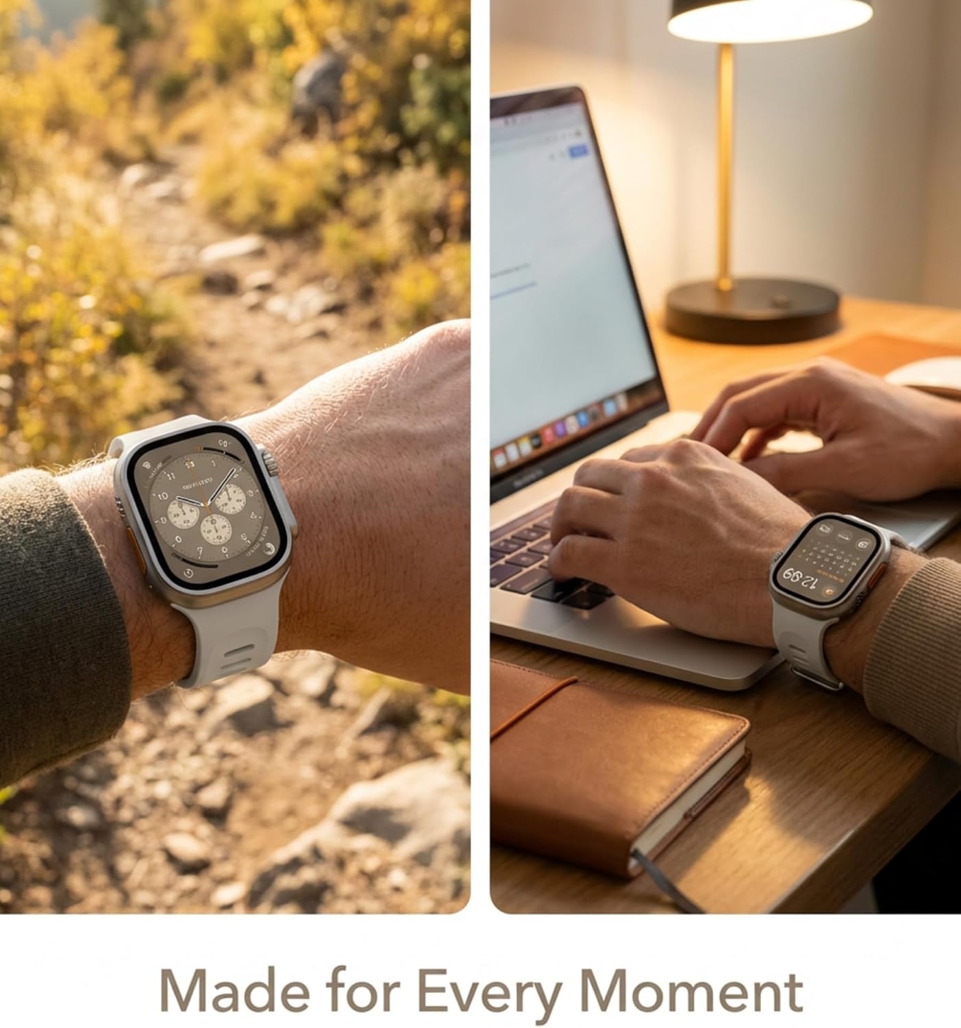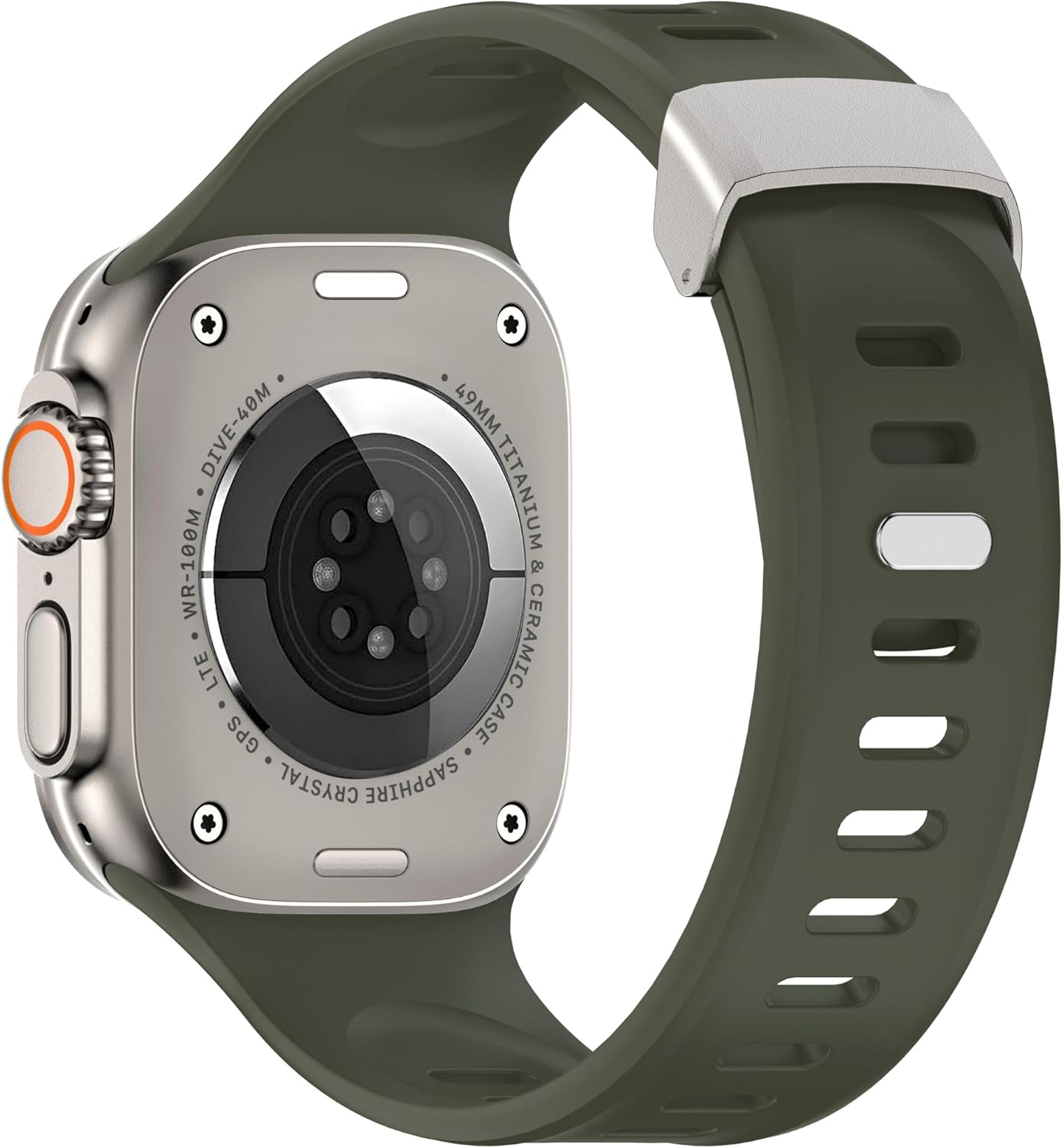 Product Features:* Compatible with Apple Watch Ultra 3/2/1 (49mm), Series 11/10 (46mm), Series 9/8/7 (45mm), Series 6/5/4 (44mm), and SE3/SE2/SE (44mm) models.* Crafted from high-quality, breathable silicone that is sweat-resistant and durable, perfect for sports, outdoor activities, and everyday use.* Adjustable fit (6.69" to 8.66" wrist size), designed with a buckle for a secure and customized fit for a wide range of wrist sizes.* Simple, sleek design with stainless steel hardware provides a modern, stylish look suitable for both casual and formal occasions.* 26mm wide strap ensures a bold, stylish appearance while offering comfort and a secure fit during any activity.