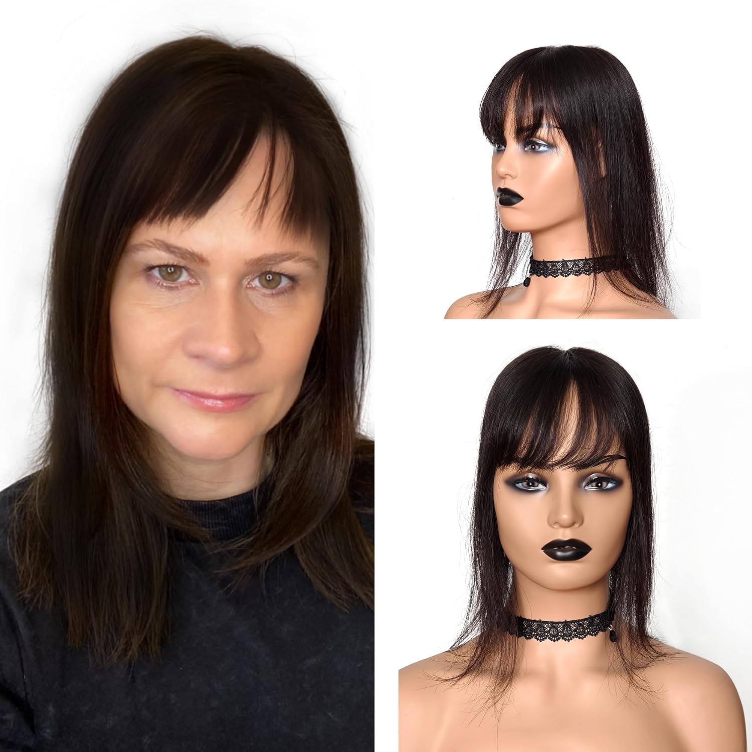 100% hand tied human hair topper with bangs, soft silk base for woman with hair loss problem.