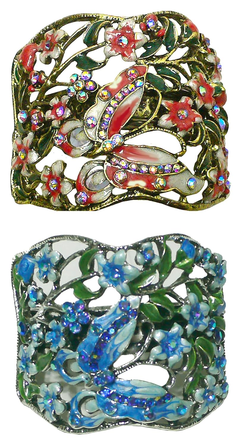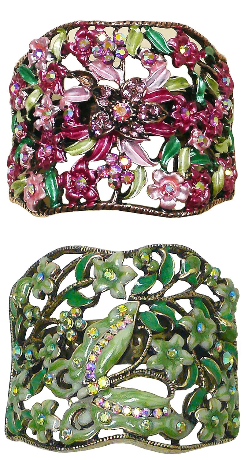 Set of 5 hair holder barrettes, design of flowers butterfly, artistic hand painting, sparkly crystals. Hair holder barrette in half moon shape measuring 2.5" x 2" provides ample cavity to hold medium to thick hair for high or low ponytail. For thin hair, wearing a fabric wrapped elastic band underneath will help.