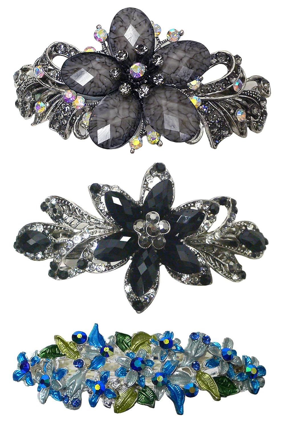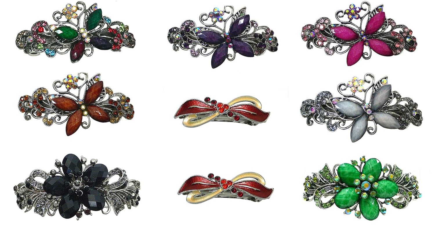 Set of 3 Butterfly and floweer barrettes, exquisite designs with sparkly crystals and colorful beads. Butterfly ornament measures 3.75" x 1.63". Flower barrettes approx 4" x 2". French clasp measures 2.25" at opening. Add glamour to your hairdo.