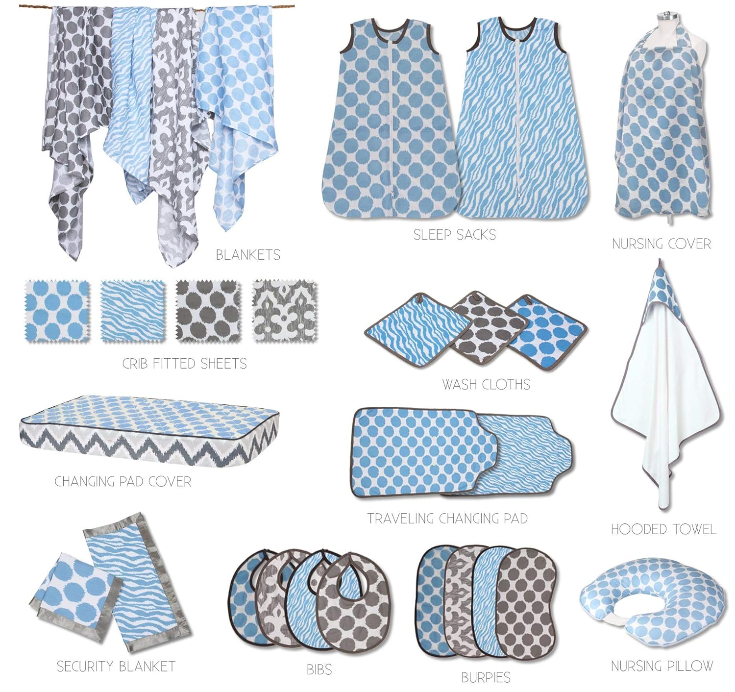 Bacati Ikat super soft Blue/Grey 4 Crib set with 2 Muslin Blankets. Includes Crib fitted sheet, Dust ruffle, and 2 muslin Blankets. Crib sheet, Size: 52 x 27.5 x 7"and crib skirt Size: 52 x 27” with 13” drop (Fits Us Standard Cribs) are made of soft 100% cotton percale fabrics. Blankets Size: 42 x 42”are made of soft muslin fabric. The Muslin blankets are lightweight, Open Weave, Prewashed soft cotton swaddling blanket Breathable; helps reduce the risk of overheating, ideal for warmer climates. Blankets has multiple uses; as a burp cloth, tummy time blanket, nursing and stroller cover, changing pad cover and much more. It is machine washable and gets softer with every wash. It coordinates with the rest of Bacati Ikat Bedding Collection. See the entire rest of Bacati Ikat Collection for endless Mix N match possibilities. Cotton is a green fabric as it is renewable resource & biodegradable. Cotton is breathable making it more comfortable in extreme climates. Cotton is inherently soft delicate on skin of babies, durable & user friendly. Cottons gentle quality makes it appropriate for Babies with very sensitive skin or skin allergies.