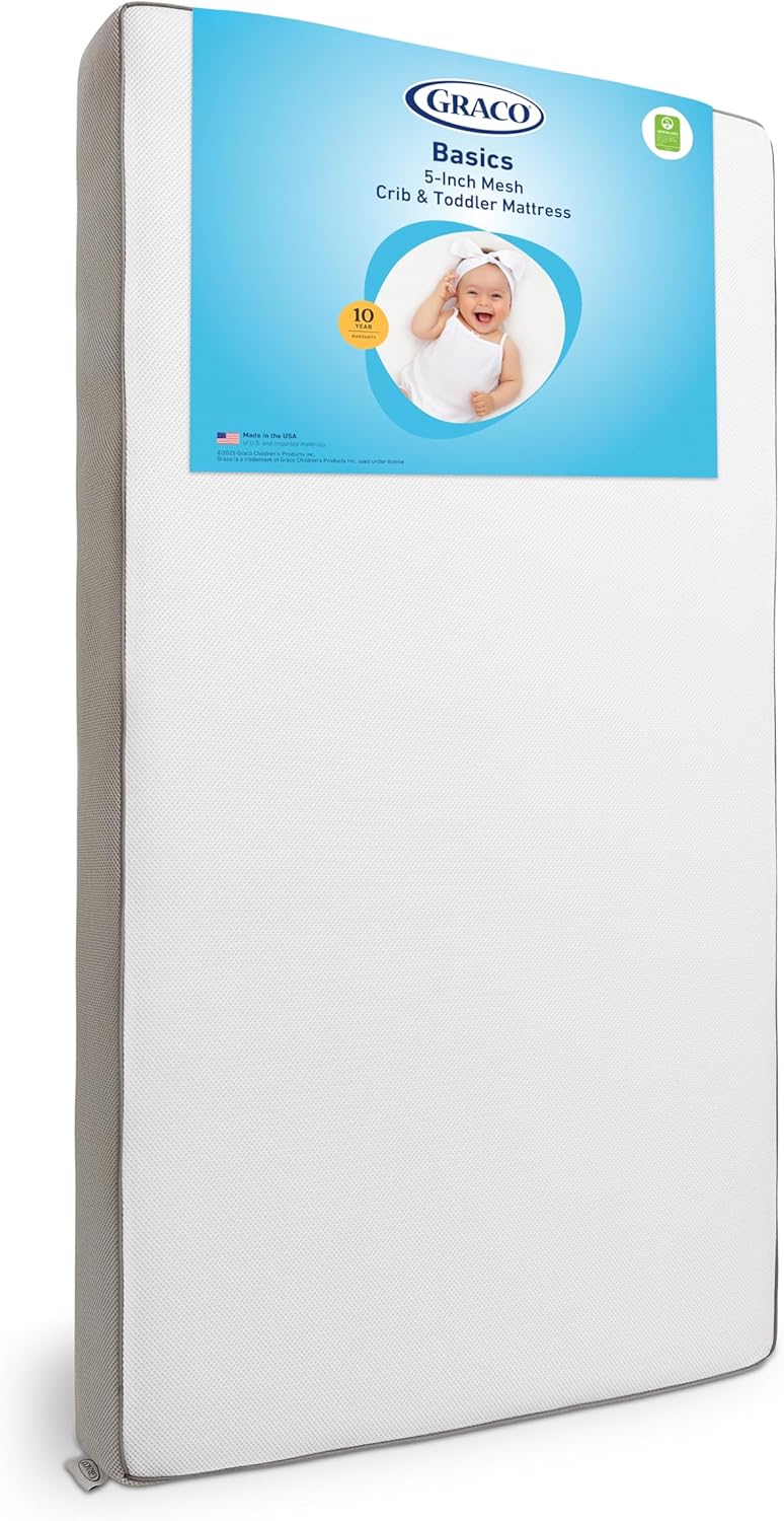 The grow-with-me Graco Essentials 6-Inch Dual-Sided Crib & Toddler Mattress is thoughtfully designed to grow with your child, as its dual-sided design features a firmer side for infants' safer sleep, and a softer side that offers more comfort for your toddler. Its ultra-soft, water-resistant outer cover is gentle to the touch and is easy to unzip for easy machine washing. GREENGUARD Gold Certified, this baby mattress has been tested for over 10,000 chemicals and VOCs to contribute to cleaner indoor air in your nursery — keeping your family top of mind. Baby Safety Alliance Verified, this Graco crib mattress has been third-party tested at an independent, CPSC-accredited laboratory to meet or exceed the highest federal and state safety standards applicable to its product category. Proudly made in the USA (with U.S. and imported materials), this dual-sided baby crib mattress features a high-density poly-fiber core (made with recycled content) and is free from fiberglass and chemical flame retardants. Designed to fit any standard full-size crib or toddler bed, the Graco 6-Inch Dual-Sided Baby Crib & Toddler Bed Mattress is backed by a 10-year limited manufacturer’s warranty.