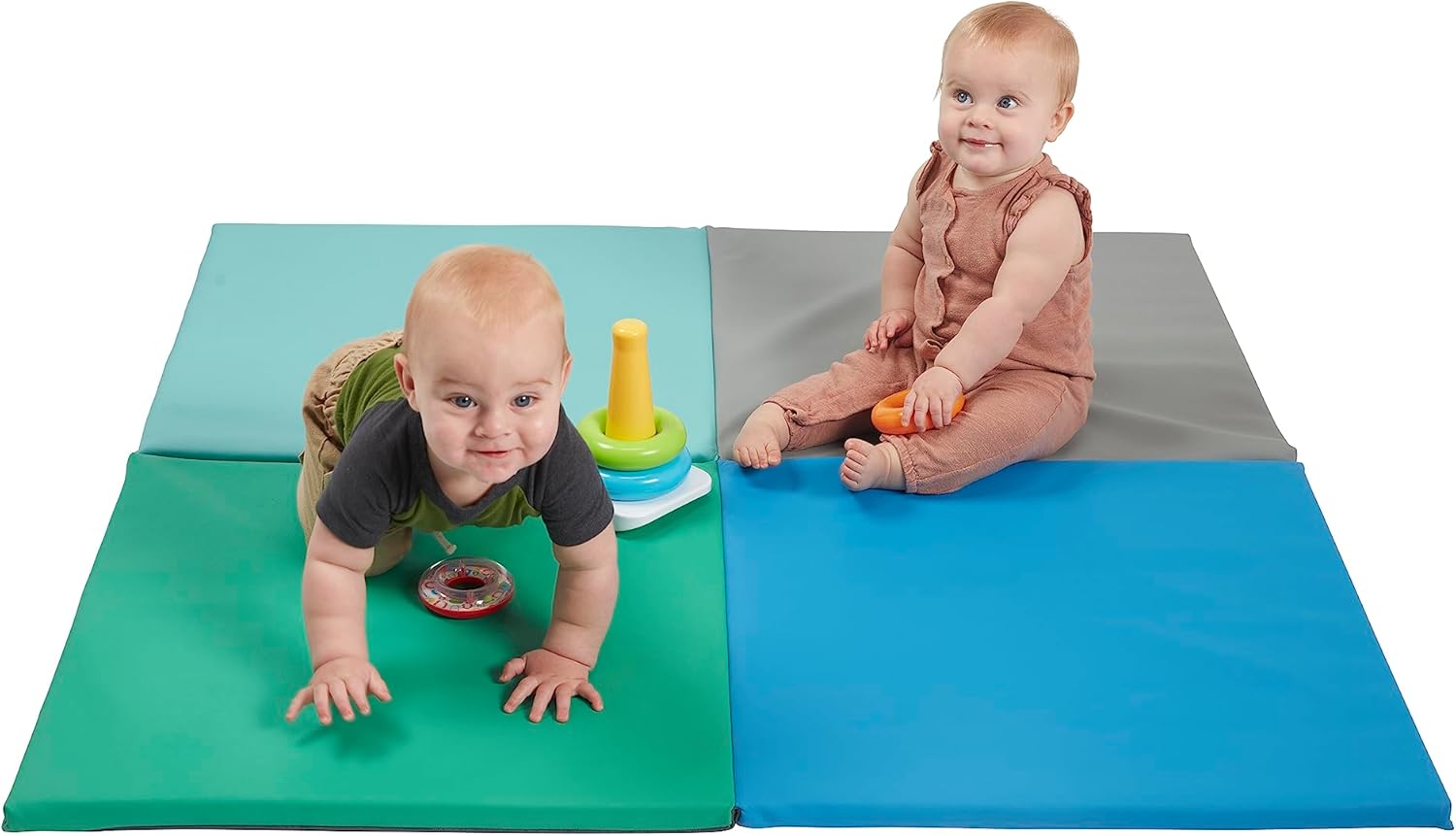 From tummy time to first steps and beyond, the SoftZone Quad Fold-N-Go Activity Mat offers a safe space for your little one to play and grow. Designed for everyday use in daycare, preschools, early childhood learning environments and perfect for home, this play mat provides a comfortable space for babies during tummy time and evolves into an interactive play zone for toddlers. Daily tummy time helps babies build strong neck, back and shoulder muscles. Climbing and crawling are important milestones that support sensory-motor development, fine motor, and cognitive skills. Stimulate early color identification and interaction with this mat's vibrant and visually engaging pattern. The large, padded mat can also be used in the middle or corner of a room to create a cozy reading nook for story time, circle time or quiet reading. Double the fun by pairing this mat with ECR4Kids Bi-Directional Mirror, 360° climbers or Toddler Soft Blocks; sold separately. The dense foam core is covered in vegan leather and features a non-slip base that helps keep mat in place during use. This toddler play mat can be used on any floor surface for kids to play and explore.
