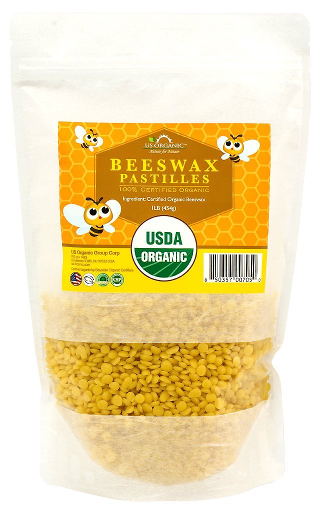 US Organicâs USDA Certified Organic Beeswax White Pastilles is great for both in Cosmetics and Medicinal use and perfect for DIY projects like Soaps, Diaper Rash Cream, Natural Vapor Rub, Sore Nose Soothing Balm, Lip balm, Cream, Lotion, Deodorant, Eye shadow, Blush, Eye liner, Mustache wax, Hair pomades, candles, Shoe polish, Furniture polish and more. Rich in Vitamin A and emollient, anti-inflammatory properties which promotes cell regeneration and improves skin hydration (Excellent for diaper dermatitis, Psoriasis and Eczema) Has mild sweet aroma and filtered to be free of debris & the color is naturally removed, resulting in the white color Great for DIY Projects : Skin Care Products (i.e. Deodorant, Lotion bars, Lip balms, Bar Soaps), Baby Products (Diaper rash cream), Scented Candles, Natural Neosporin Alternative, Cold & Flu Relief (Vapor Rub), Reusable Food Wraps, Grease Cookie Sheets, Furniture Polish, and so much more. Filtered to be free of debris / Easy to use â no large blocks of bees wax to cut Highest premium quality cosmetic grade organic beeswax. Packaged at GMP & USDA certified, FDA-registered facility in the U.S. Sourced from India, Argentina, China, Turkey 4Â size available (4oz, 8oz, 16oz, 20kg Bulk)