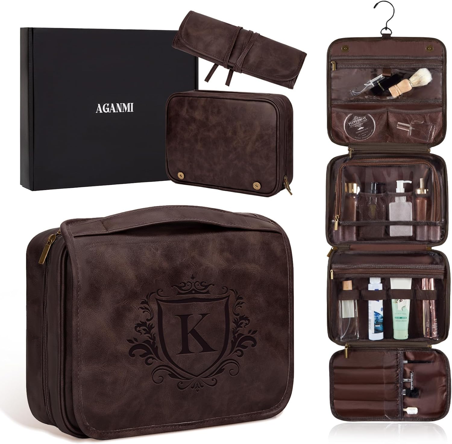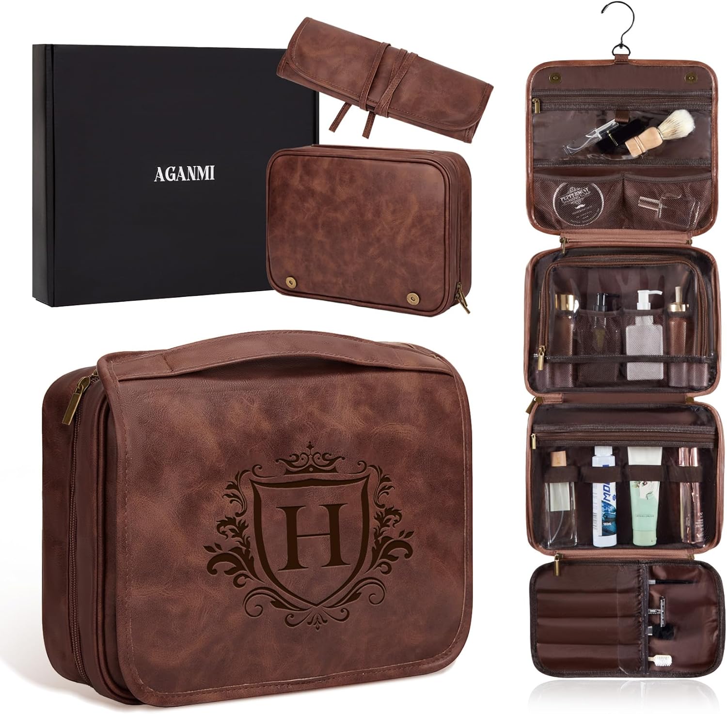 Aganmi Personalized Hanging Toiletry Bag Travel Gifts for Men Him, 3-in-1 Large Laser-Engraved Initial Waterproof PU Leather Shaving Bag Valentines Birthday Gift for Men Dad Husband Son Boyfriend