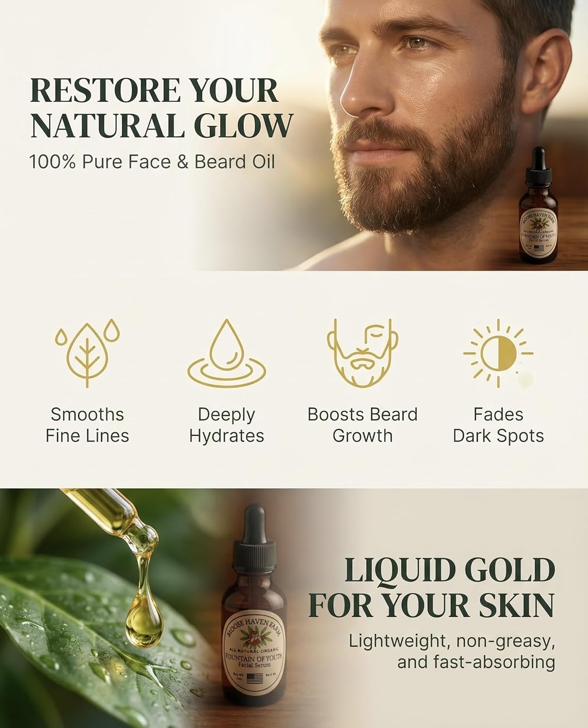Gentle & Nourishing CareMoose Haven Farm Fountain of Youth Facial Serum is made with 100% pure, natural oils, including frankincense, lavender, castor, and jojoba, enriched with vitamin E. This lightweight formula delivers deep hydration and nourishment, helping skin feel soft, smooth, and refreshed while supporting a healthy, balanced appearance. Perfect for daily use, it absorbs quickly without leaving a greasy residue, making it ideal for both face and beard.Clean & Non-Toxic FormulaThis facial serum contains no synthetic fillers, parabens, or harsh chemicals, making it safe for sensitive skin. This gentle blend provides essential nutrients to maintain skin wellness, and can be used alone, under moisturizer, or as part of a nightly skincare routine. Regular use helps skin feel hydrated, soothed, and naturally radiant.Multi-Purpose HydrationThis versatile serum works on both face and facial hair, offering light moisture, softness, and smoothness for all skin types. This nourishing formula supports an even complexion, reduces dryness, and enhances overall skin comfort. Lightweight and easy to apply, it can be incorporated into any morning or evening routine for consistent, healthy-looking results.Enjoy the benefits of Moose Haven Farm's Fountain of Youth Facial Serum, keeping your skin nourished, hydrated, and naturally refreshed every day.Give your skin the care it deserves with Moose Haven Farm Fountain of Youth Facial Serum—our lightweight, all-natural serum keeps your face and beard soft, smooth, and radiant every day.