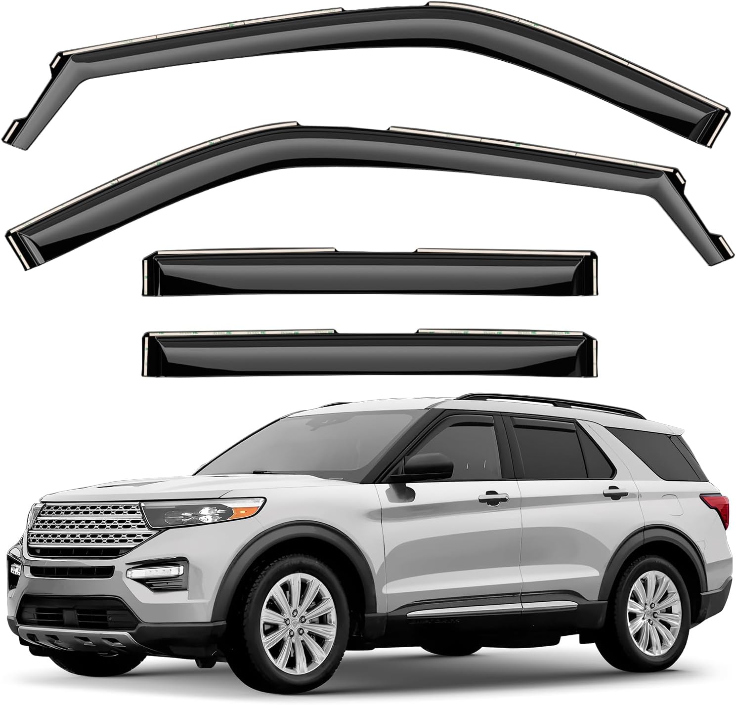The Original GrandWheel window visors are manufactured with the polycarbonate. Other use acrylic material that cannot be same flexible and durable like polycarbonate. The GrandWheel window visors are engineered by using cutting-edge technology to reduce noise, deflect rain whilst and keep cabin cooled. The 4-piece set comes with easy to install 3M tape and installation manual. Specifications: - Condition: 100% Brand New; - Fitment: for Explorer 2011-2019; - Package includes: 4 pcs window visor deflectors (2 front/2 rear), prep pad, installation manual; - Color: Smoked black tinted; - Material: High quality polycarbonate. Features: - Fresh air even while raining; - Reduces sun glare; - Easy installation; No-drilling required; - In-channel installation; - Custom fit.
