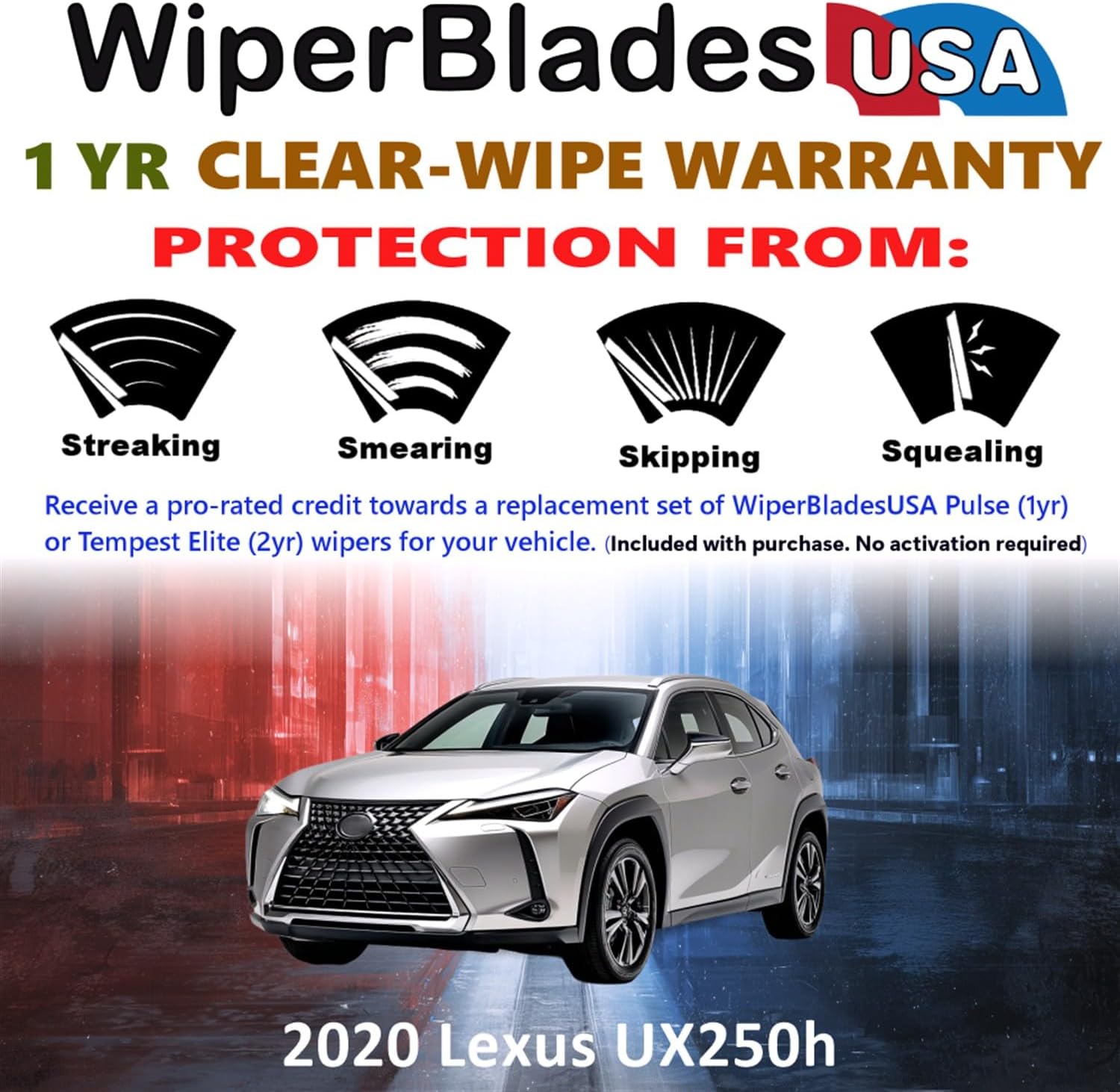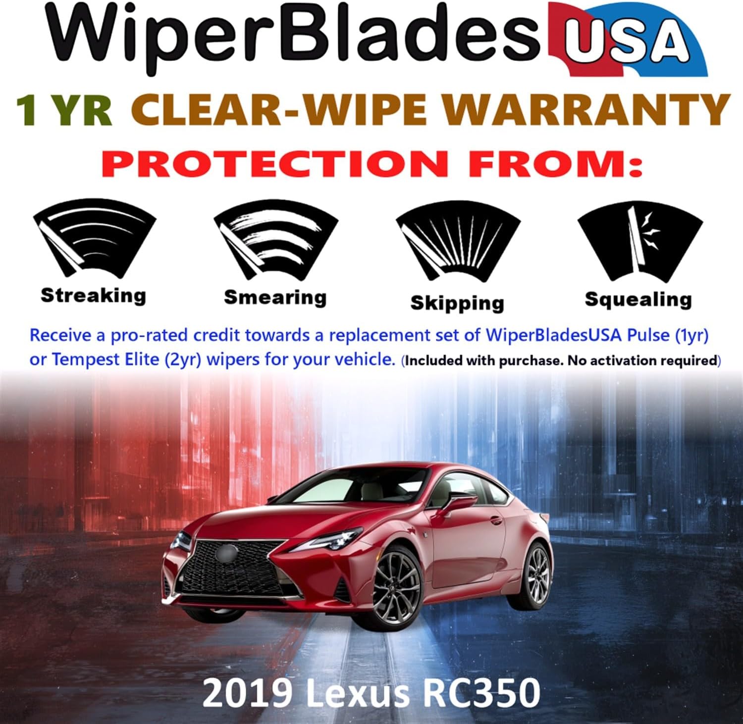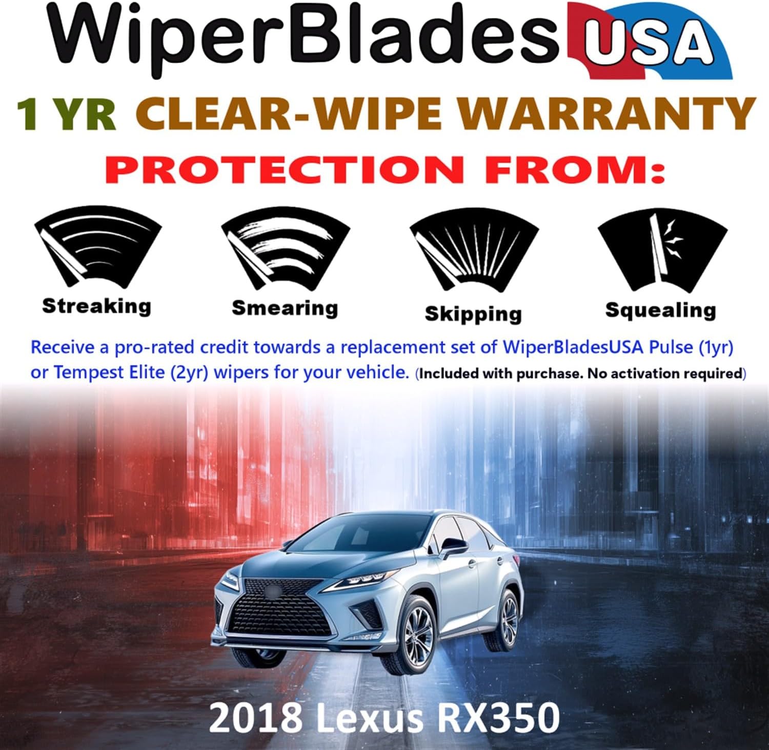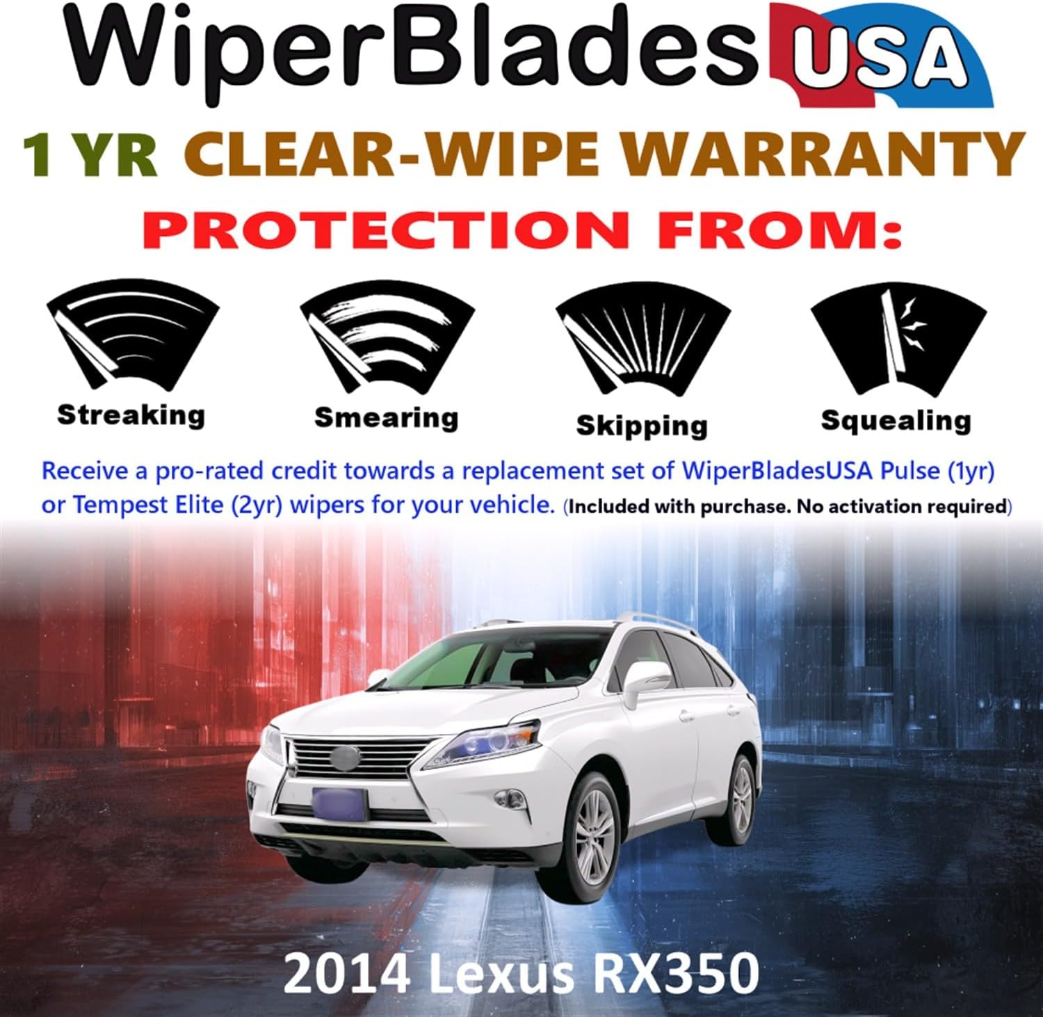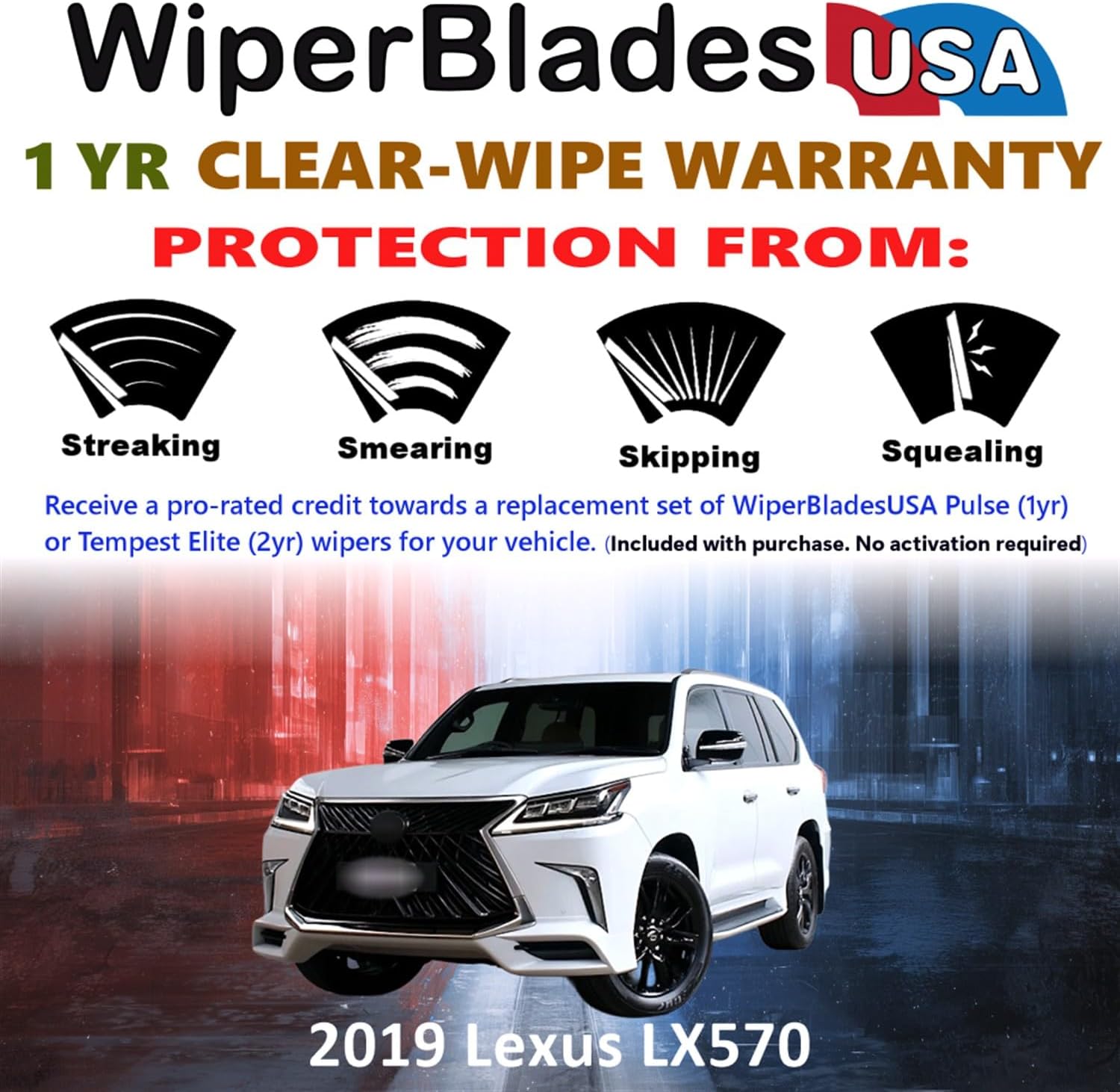 Pulse Beam wiper blades wipers set +Trico ExactFit Rear wiper compatible with Lexus TX350 2024WiperBladesUSA Beam Wiper Blades - Durable Flexible Beam Blade These WiperBladesUSA® beam wiper blades contour to the curvature of your windshield to provide even wiping pressure along the full length of the blade. These wiper blades have a 1 year Wiper Wear Warranty included. Meaning if they stop keeping you safe you get a credit towards a fresh pair. (See Details) When WiperBladesUSA says "We Got You" we want to make sure you keep good working wipers on your car. Every day. All the time. These beam wiper blades are designed to be compatible with Lexus TX350 2024 Virtually streak-free visibility Great wipers to have in rain, sleet and snow1 year "Clear-Wipe Warranty"Smooth, chatter-free wipe is a result of the specially blended teflon rubber bladeEnhanced flexibility and grip from the durable, rubber-encased substructureSignificant noise reduction and wind lift through a built-in aerodynamic spoiler to keep the wiper on the windshield at freeway speedsAll weather tough wiper blades with a synthetic rubber squeegee that will withstand even the most extreme weather conditionsPrevents ice and snow build-up through the elimination of exposed metal components. Easy Installation: Included in the bundle are directions (w/video) to simple and easy to use step-by-step installation on to your vehicle