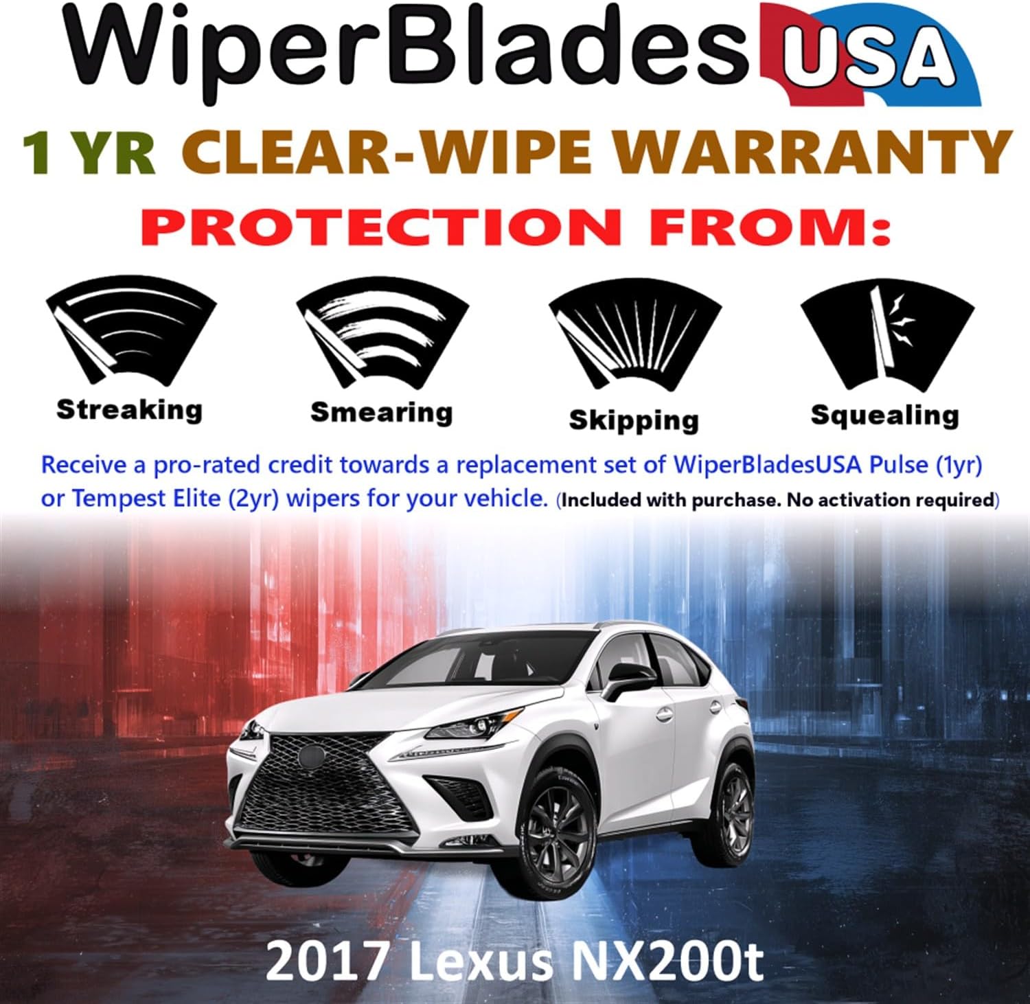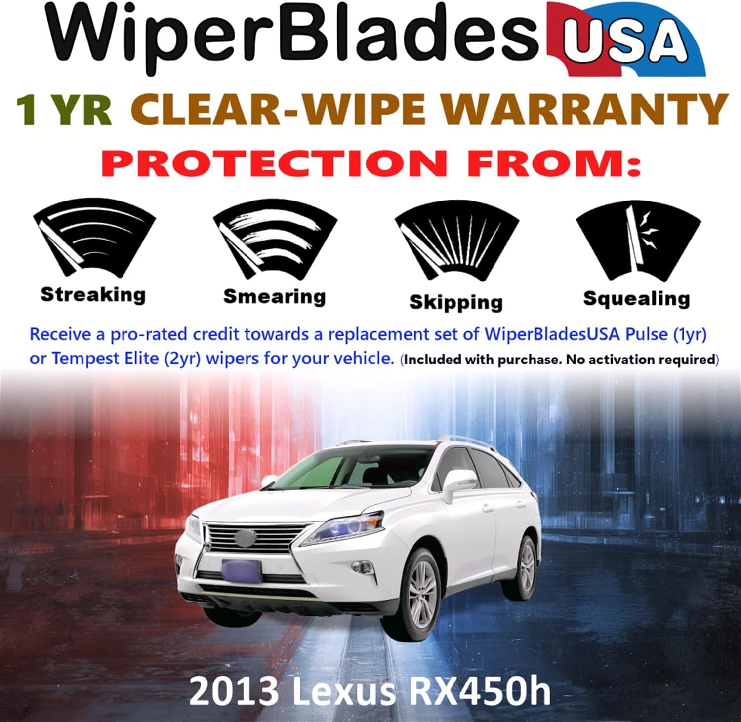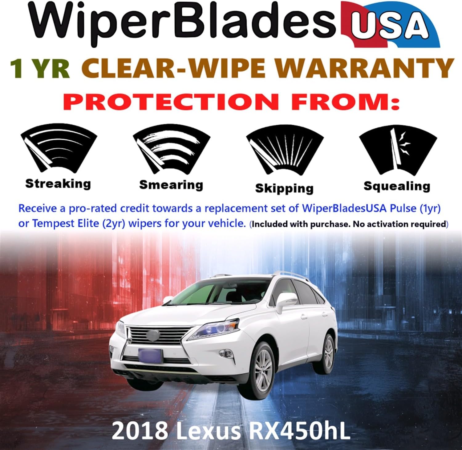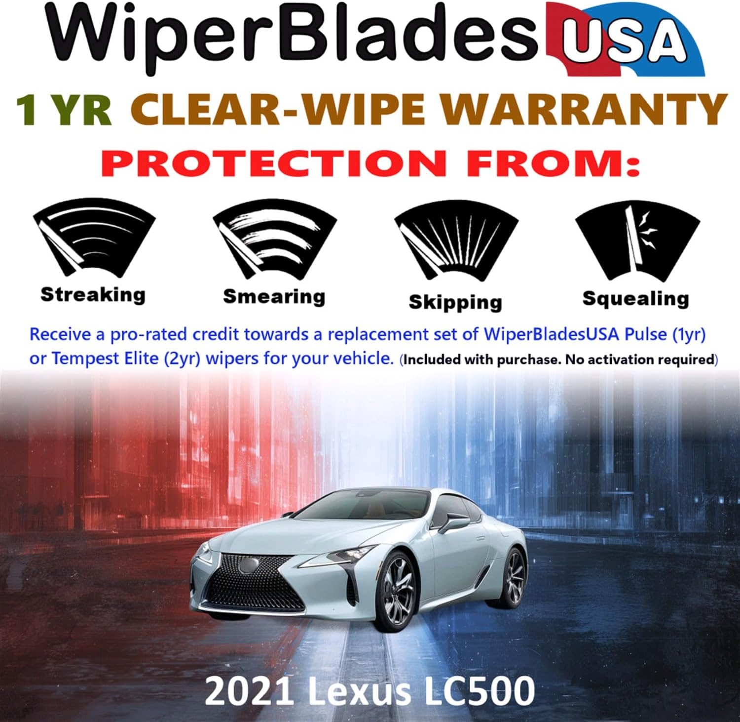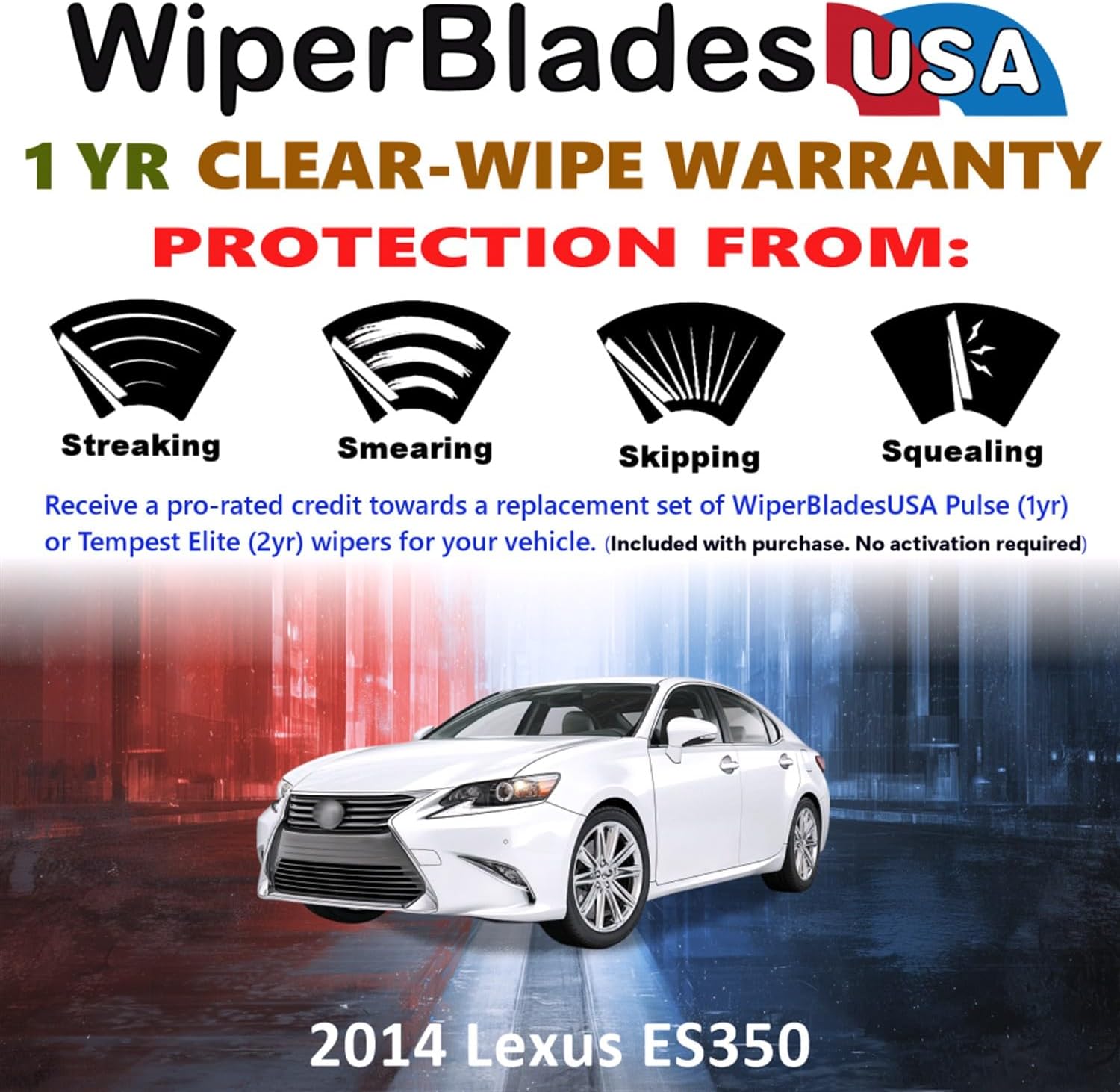 Pulse Beam wiper blades wipers set +Trico ExactFit Rear wiper compatible with Lexus TX350 2024WiperBladesUSA Beam Wiper Blades - Durable Flexible Beam Blade These WiperBladesUSA® beam wiper blades contour to the curvature of your windshield to provide even wiping pressure along the full length of the blade. These wiper blades have a 1 year Wiper Wear Warranty included. Meaning if they stop keeping you safe you get a credit towards a fresh pair. (See Details) When WiperBladesUSA says "We Got You" we want to make sure you keep good working wipers on your car. Every day. All the time. These beam wiper blades are designed to be compatible with Lexus TX350 2024 Virtually streak-free visibility Great wipers to have in rain, sleet and snow1 year "Clear-Wipe Warranty"Smooth, chatter-free wipe is a result of the specially blended teflon rubber bladeEnhanced flexibility and grip from the durable, rubber-encased substructureSignificant noise reduction and wind lift through a built-in aerodynamic spoiler to keep the wiper on the windshield at freeway speedsAll weather tough wiper blades with a synthetic rubber squeegee that will withstand even the most extreme weather conditionsPrevents ice and snow build-up through the elimination of exposed metal components. Easy Installation: Included in the bundle are directions (w/video) to simple and easy to use step-by-step installation on to your vehicle