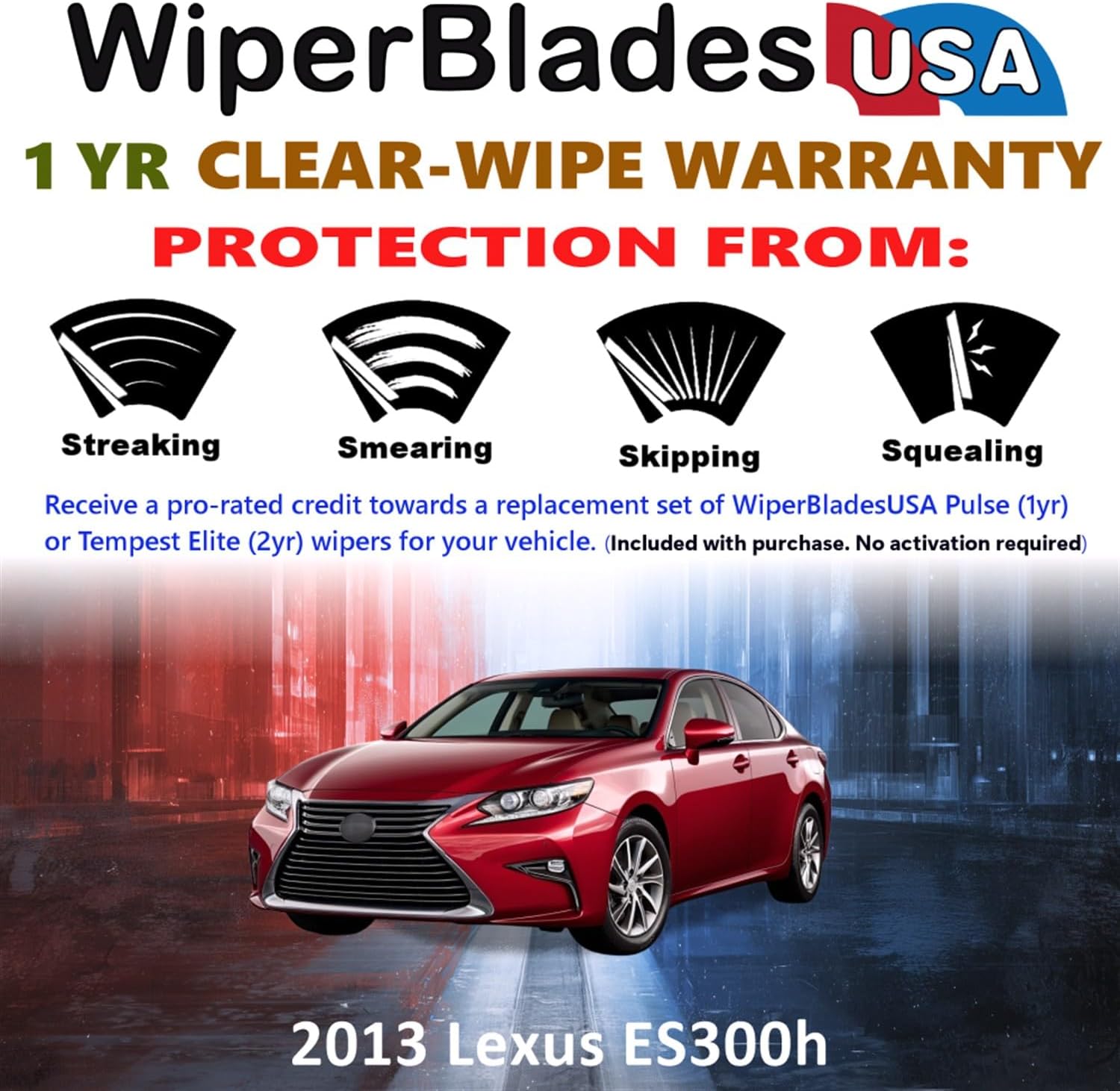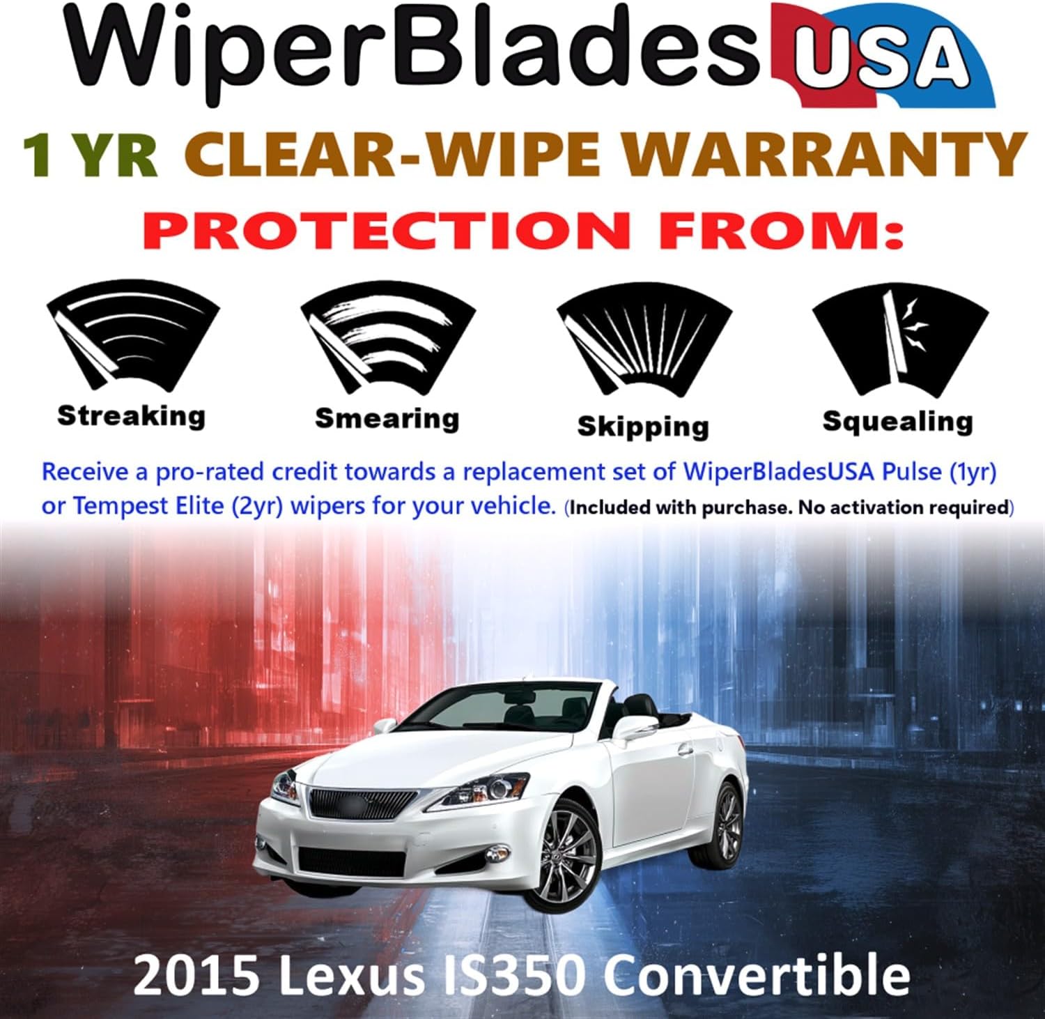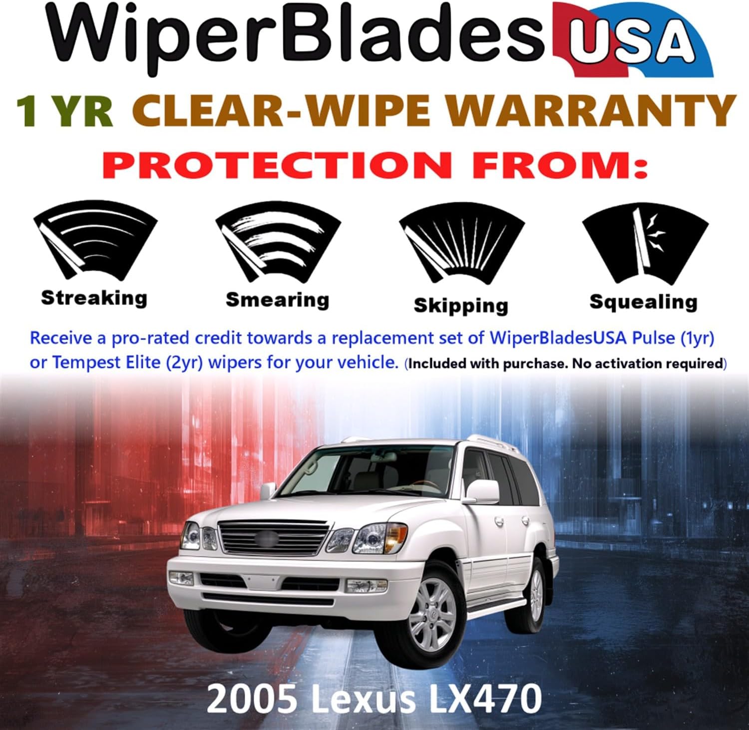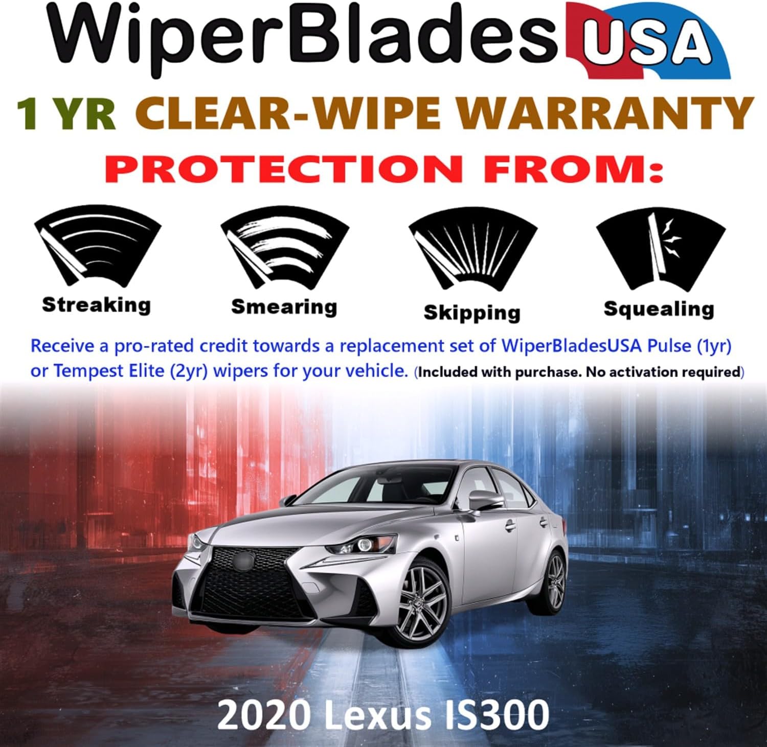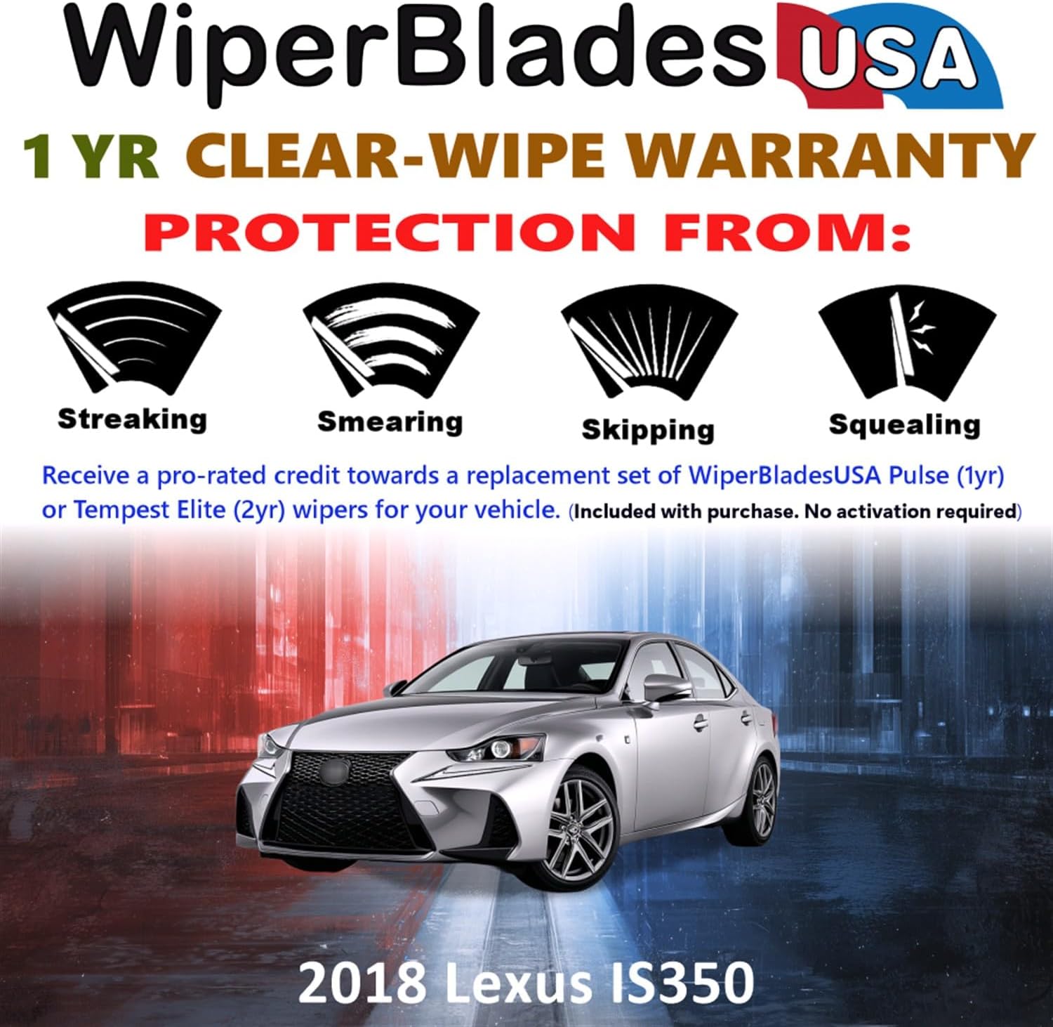 Pulse Beam wiper blades wipers set +Trico ExactFit Rear wiper compatible with Lexus TX350 2024WiperBladesUSA Beam Wiper Blades - Durable Flexible Beam Blade These WiperBladesUSA® beam wiper blades contour to the curvature of your windshield to provide even wiping pressure along the full length of the blade. These wiper blades have a 1 year Wiper Wear Warranty included. Meaning if they stop keeping you safe you get a credit towards a fresh pair. (See Details) When WiperBladesUSA says "We Got You" we want to make sure you keep good working wipers on your car. Every day. All the time. These beam wiper blades are designed to be compatible with Lexus TX350 2024 Virtually streak-free visibility Great wipers to have in rain, sleet and snow1 year "Clear-Wipe Warranty"Smooth, chatter-free wipe is a result of the specially blended teflon rubber bladeEnhanced flexibility and grip from the durable, rubber-encased substructureSignificant noise reduction and wind lift through a built-in aerodynamic spoiler to keep the wiper on the windshield at freeway speedsAll weather tough wiper blades with a synthetic rubber squeegee that will withstand even the most extreme weather conditionsPrevents ice and snow build-up through the elimination of exposed metal components. Easy Installation: Included in the bundle are directions (w/video) to simple and easy to use step-by-step installation on to your vehicle