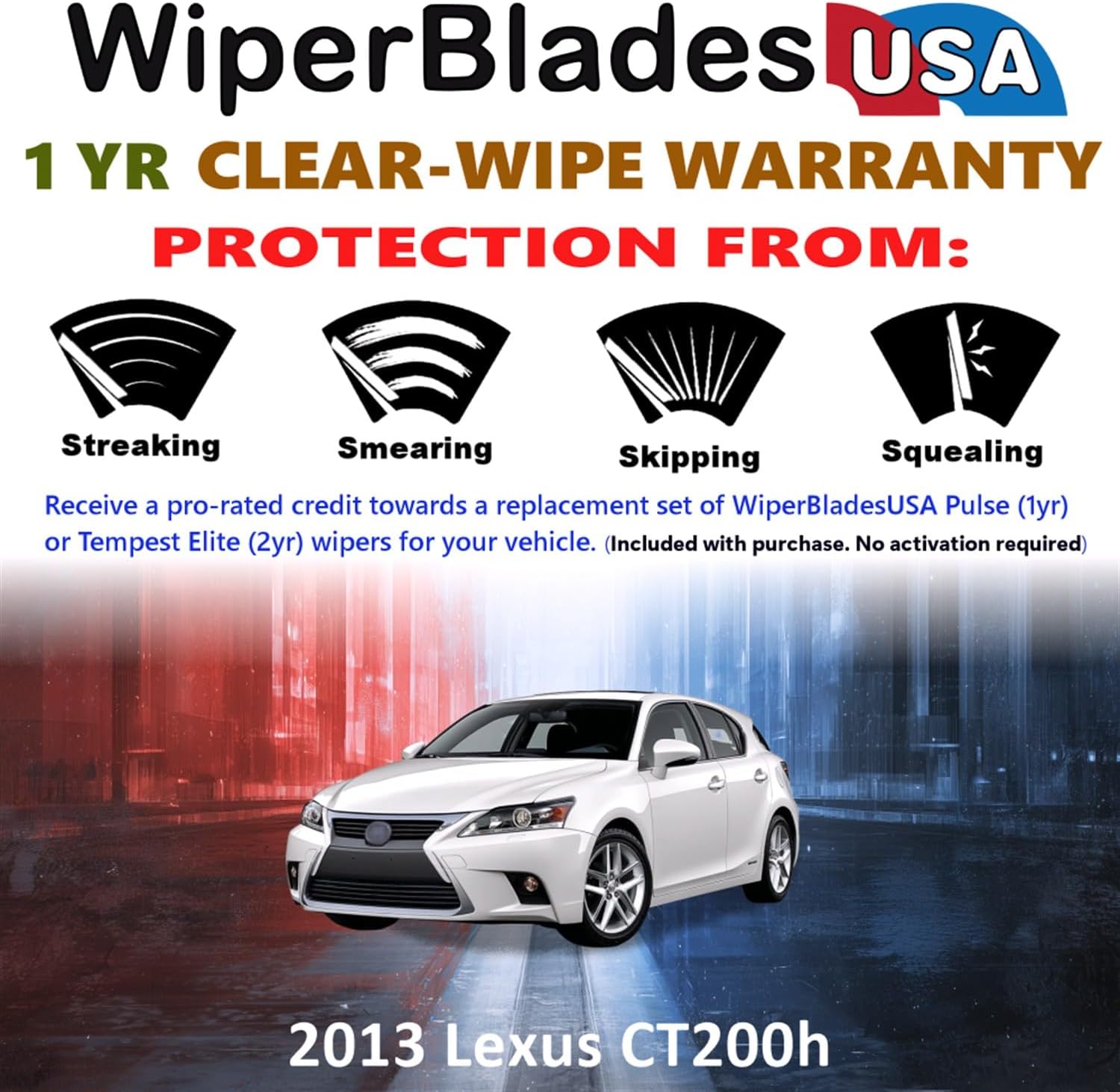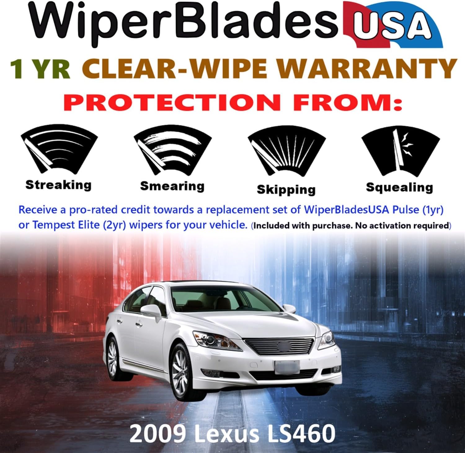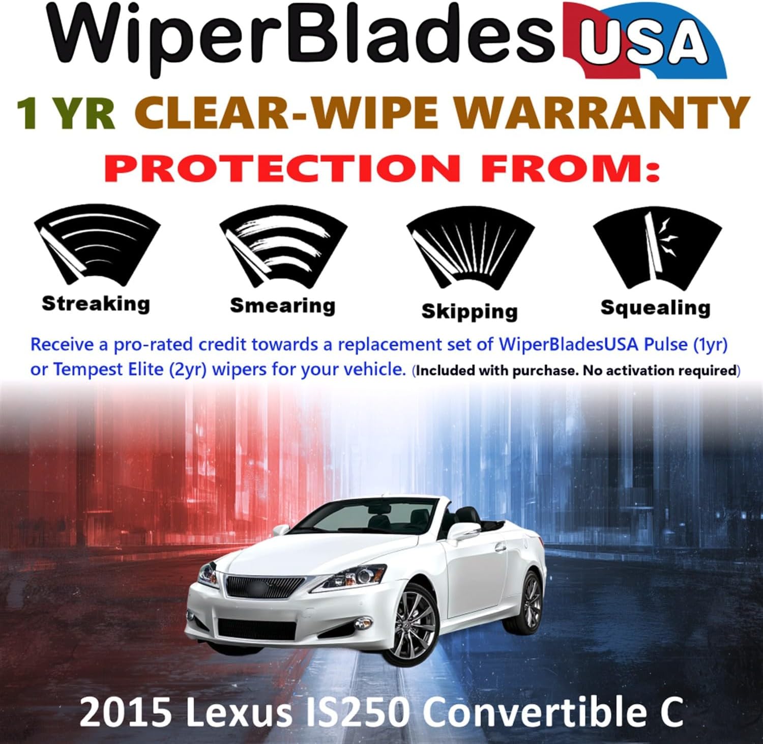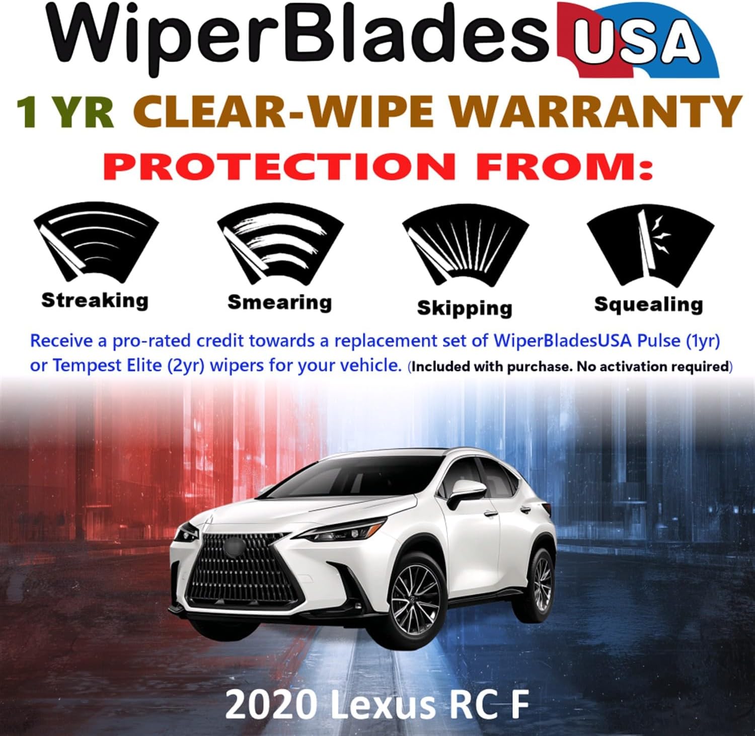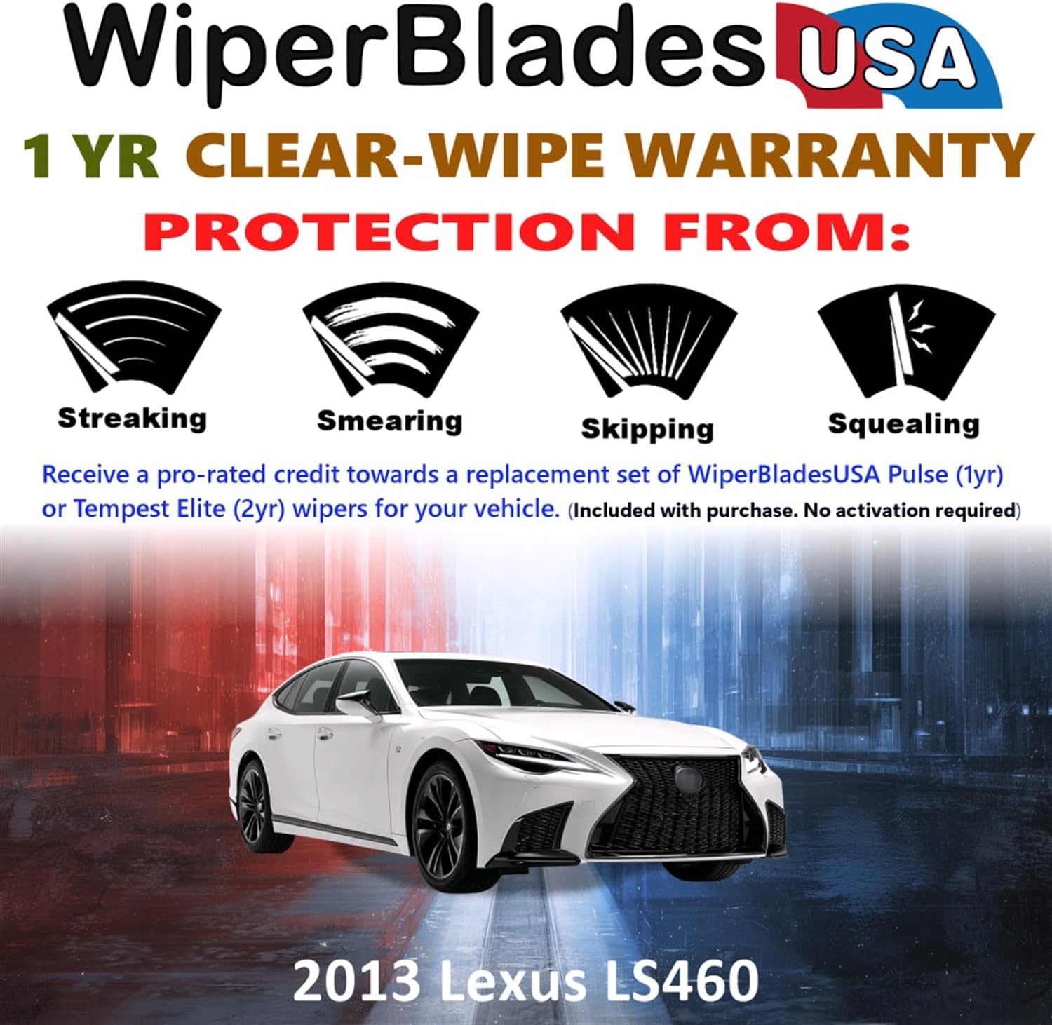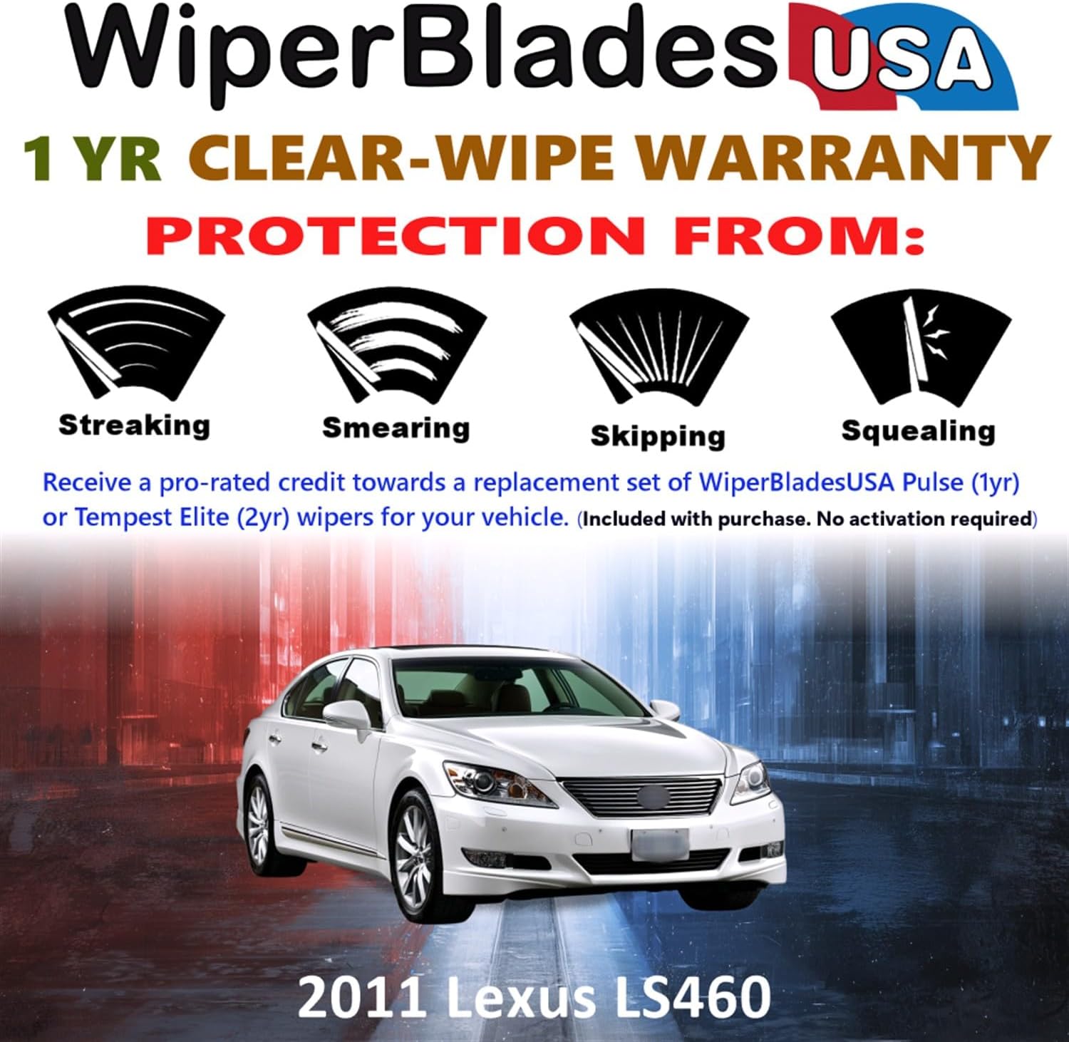 Pulse Beam wiper blades wipers set +Trico ExactFit Rear wiper compatible with Lexus TX350 2024WiperBladesUSA Beam Wiper Blades - Durable Flexible Beam Blade These WiperBladesUSA® beam wiper blades contour to the curvature of your windshield to provide even wiping pressure along the full length of the blade. These wiper blades have a 1 year Wiper Wear Warranty included. Meaning if they stop keeping you safe you get a credit towards a fresh pair. (See Details) When WiperBladesUSA says "We Got You" we want to make sure you keep good working wipers on your car. Every day. All the time. These beam wiper blades are designed to be compatible with Lexus TX350 2024 Virtually streak-free visibility Great wipers to have in rain, sleet and snow1 year "Clear-Wipe Warranty"Smooth, chatter-free wipe is a result of the specially blended teflon rubber bladeEnhanced flexibility and grip from the durable, rubber-encased substructureSignificant noise reduction and wind lift through a built-in aerodynamic spoiler to keep the wiper on the windshield at freeway speedsAll weather tough wiper blades with a synthetic rubber squeegee that will withstand even the most extreme weather conditionsPrevents ice and snow build-up through the elimination of exposed metal components. Easy Installation: Included in the bundle are directions (w/video) to simple and easy to use step-by-step installation on to your vehicle