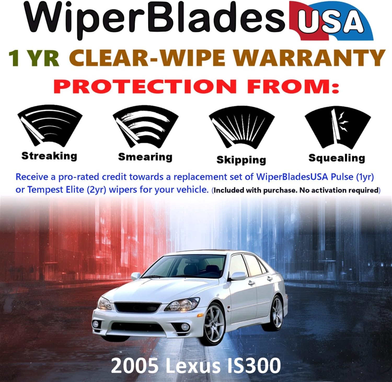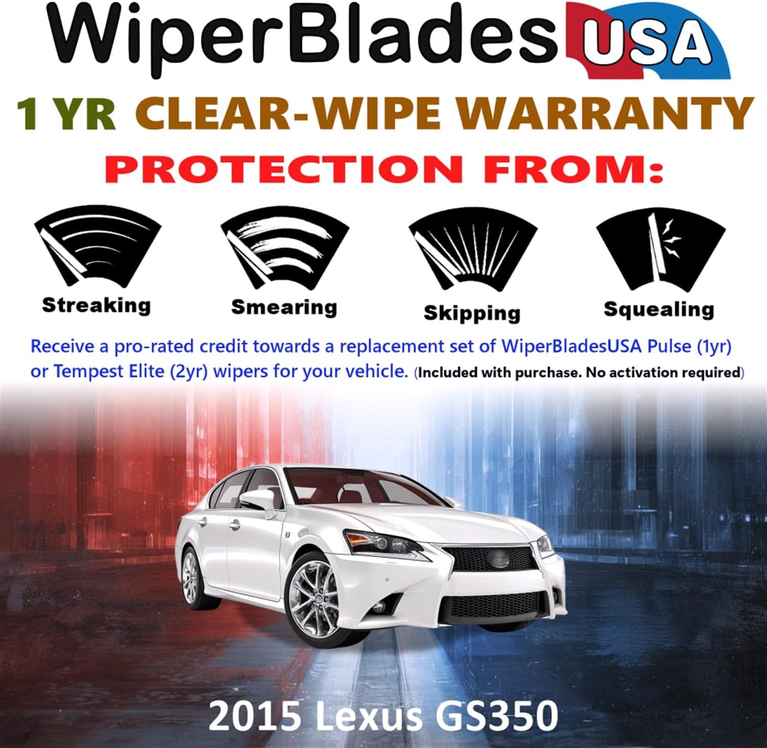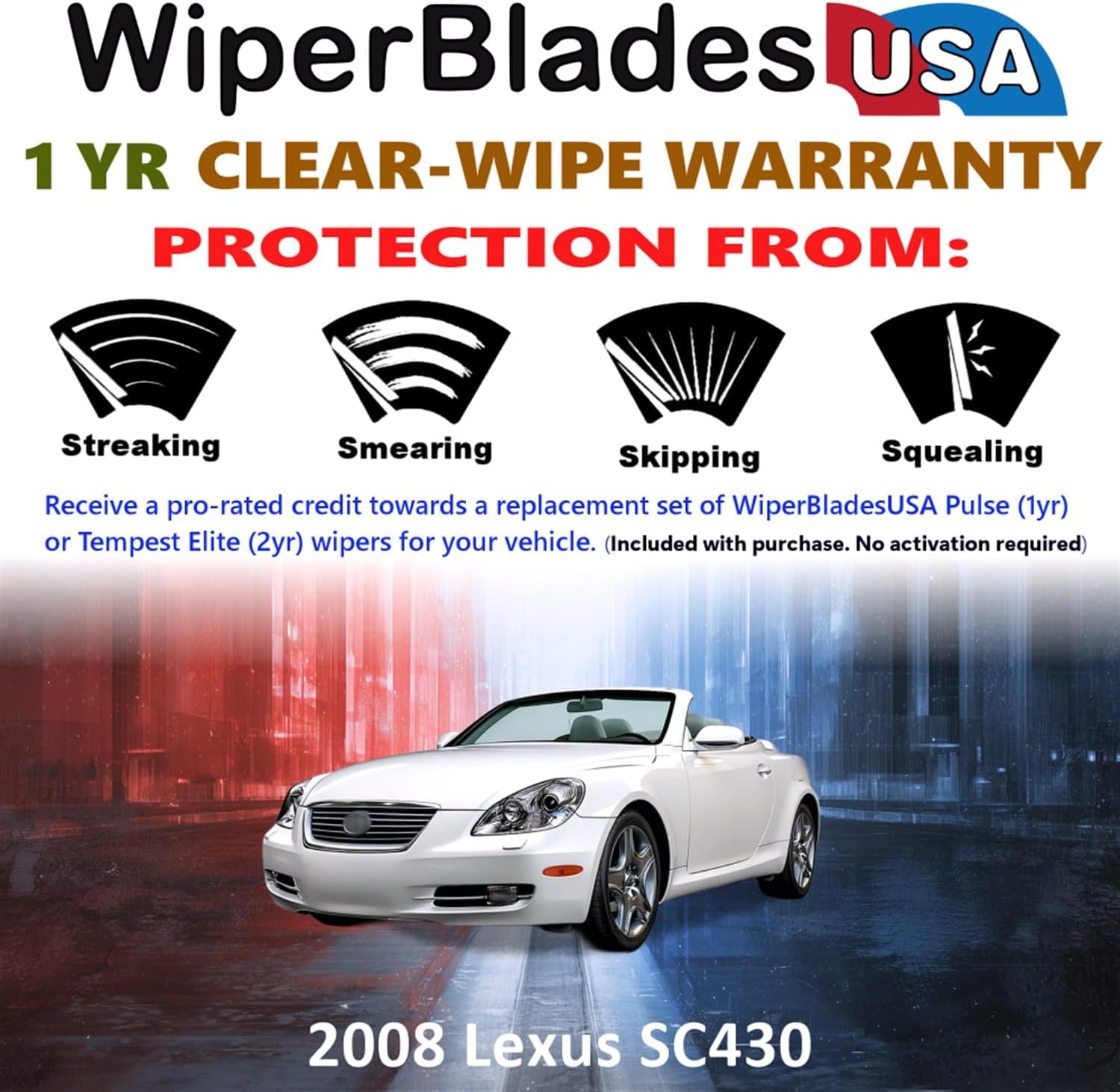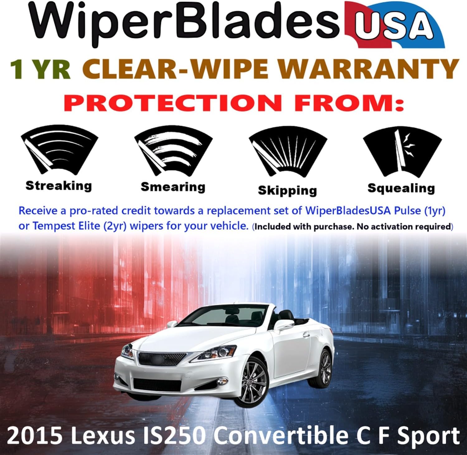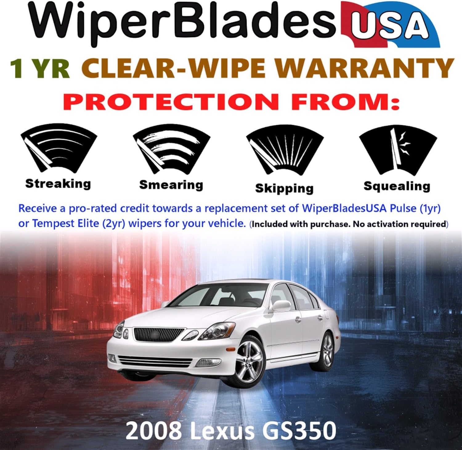 Pulse Beam wiper blades wipers set +Trico ExactFit Rear wiper compatible with Lexus TX350 2024WiperBladesUSA Beam Wiper Blades - Durable Flexible Beam Blade These WiperBladesUSA® beam wiper blades contour to the curvature of your windshield to provide even wiping pressure along the full length of the blade. These wiper blades have a 1 year Wiper Wear Warranty included. Meaning if they stop keeping you safe you get a credit towards a fresh pair. (See Details) When WiperBladesUSA says "We Got You" we want to make sure you keep good working wipers on your car. Every day. All the time. These beam wiper blades are designed to be compatible with Lexus TX350 2024 Virtually streak-free visibility Great wipers to have in rain, sleet and snow1 year "Clear-Wipe Warranty"Smooth, chatter-free wipe is a result of the specially blended teflon rubber bladeEnhanced flexibility and grip from the durable, rubber-encased substructureSignificant noise reduction and wind lift through a built-in aerodynamic spoiler to keep the wiper on the windshield at freeway speedsAll weather tough wiper blades with a synthetic rubber squeegee that will withstand even the most extreme weather conditionsPrevents ice and snow build-up through the elimination of exposed metal components. Easy Installation: Included in the bundle are directions (w/video) to simple and easy to use step-by-step installation on to your vehicle
