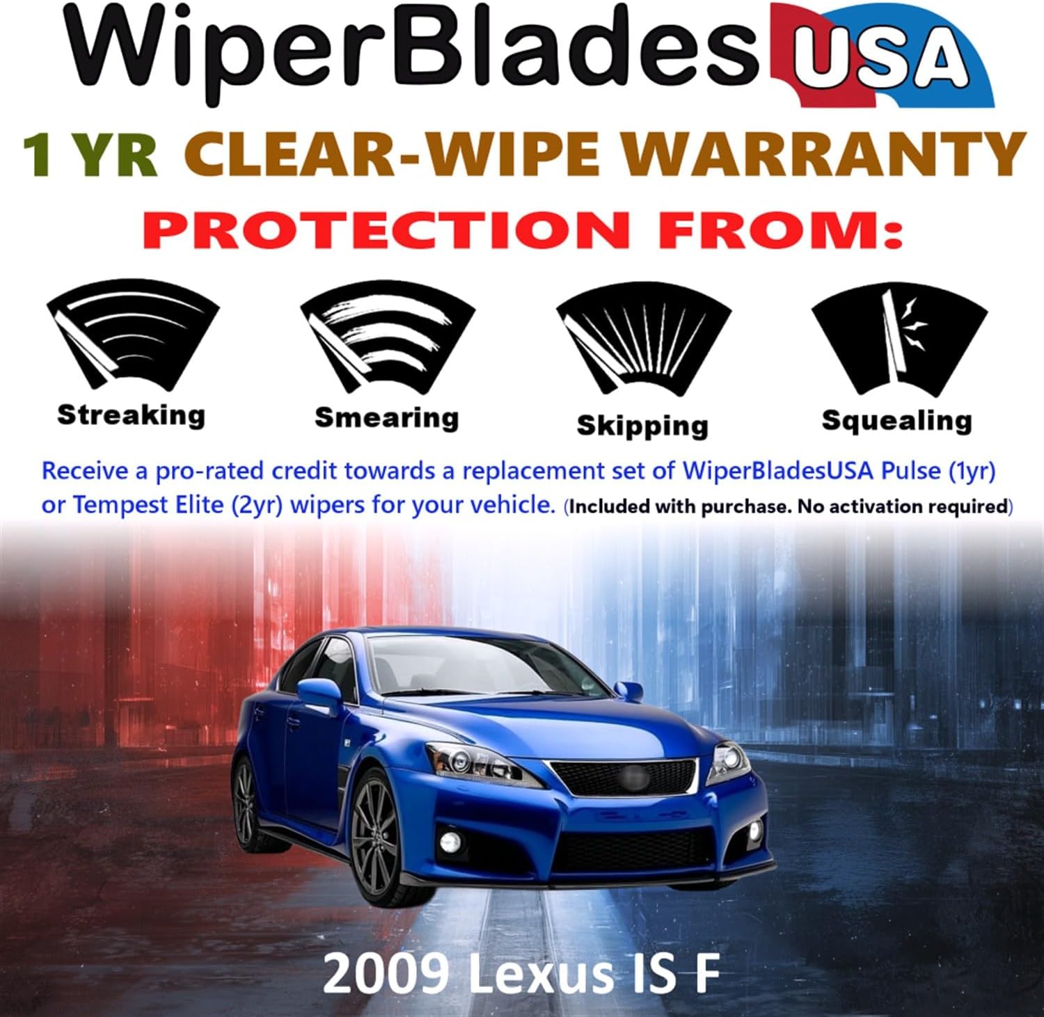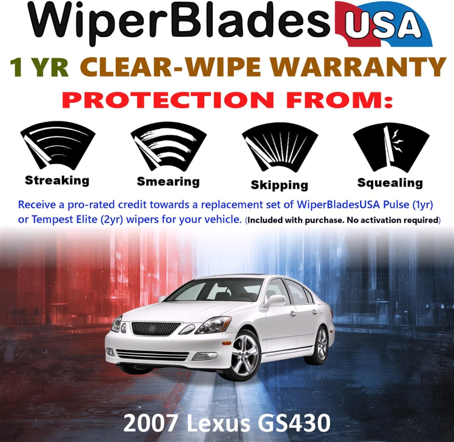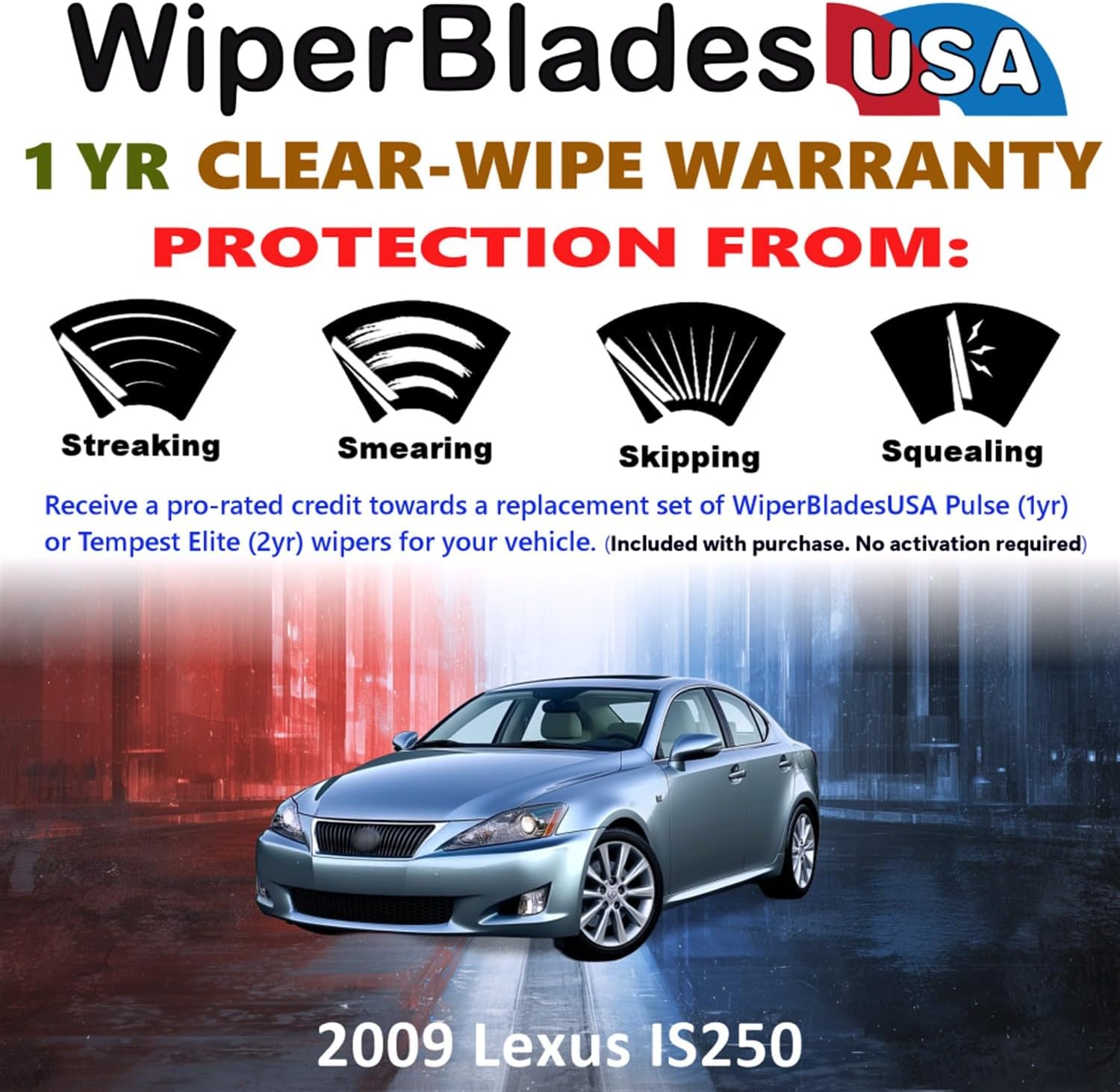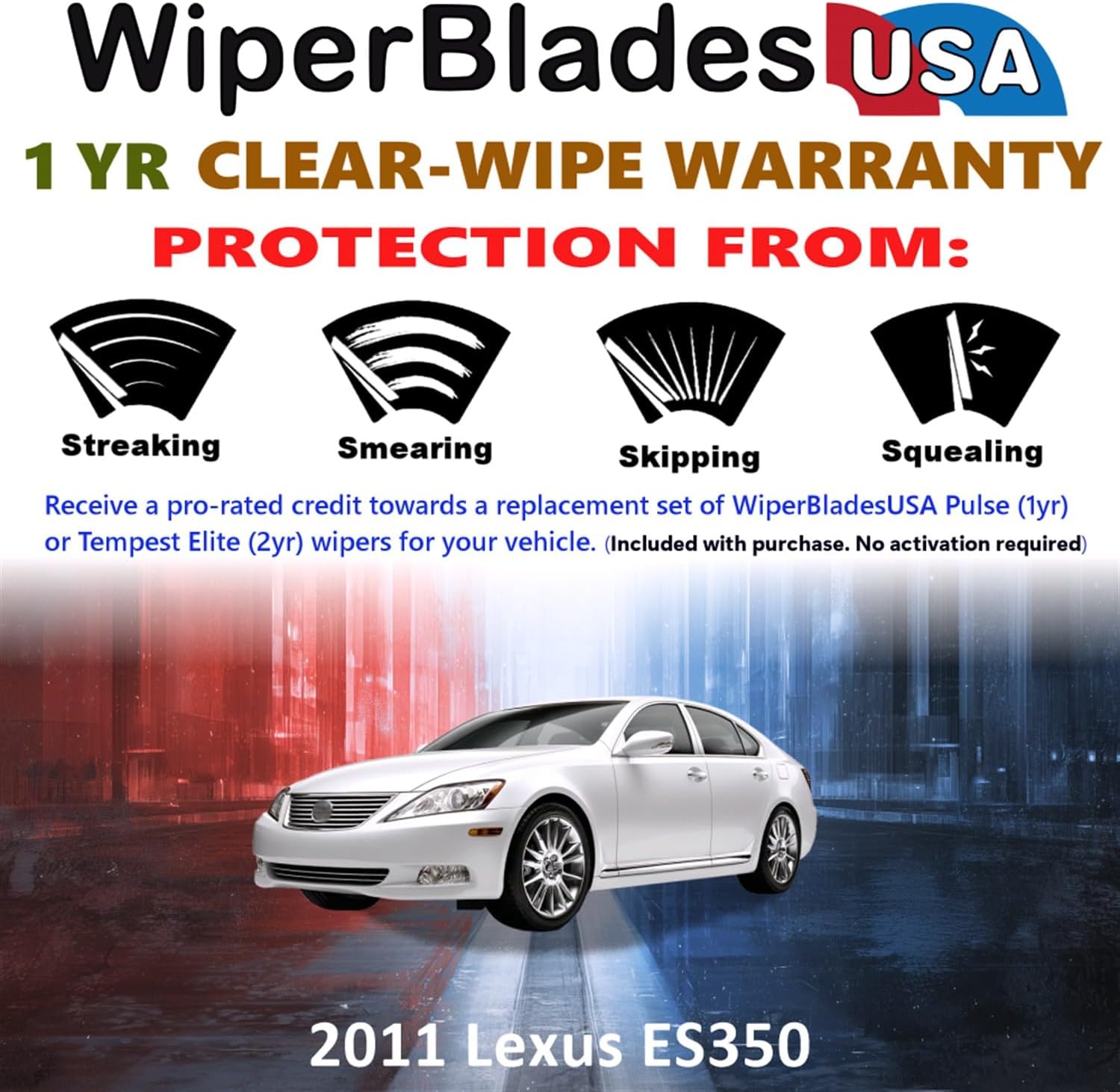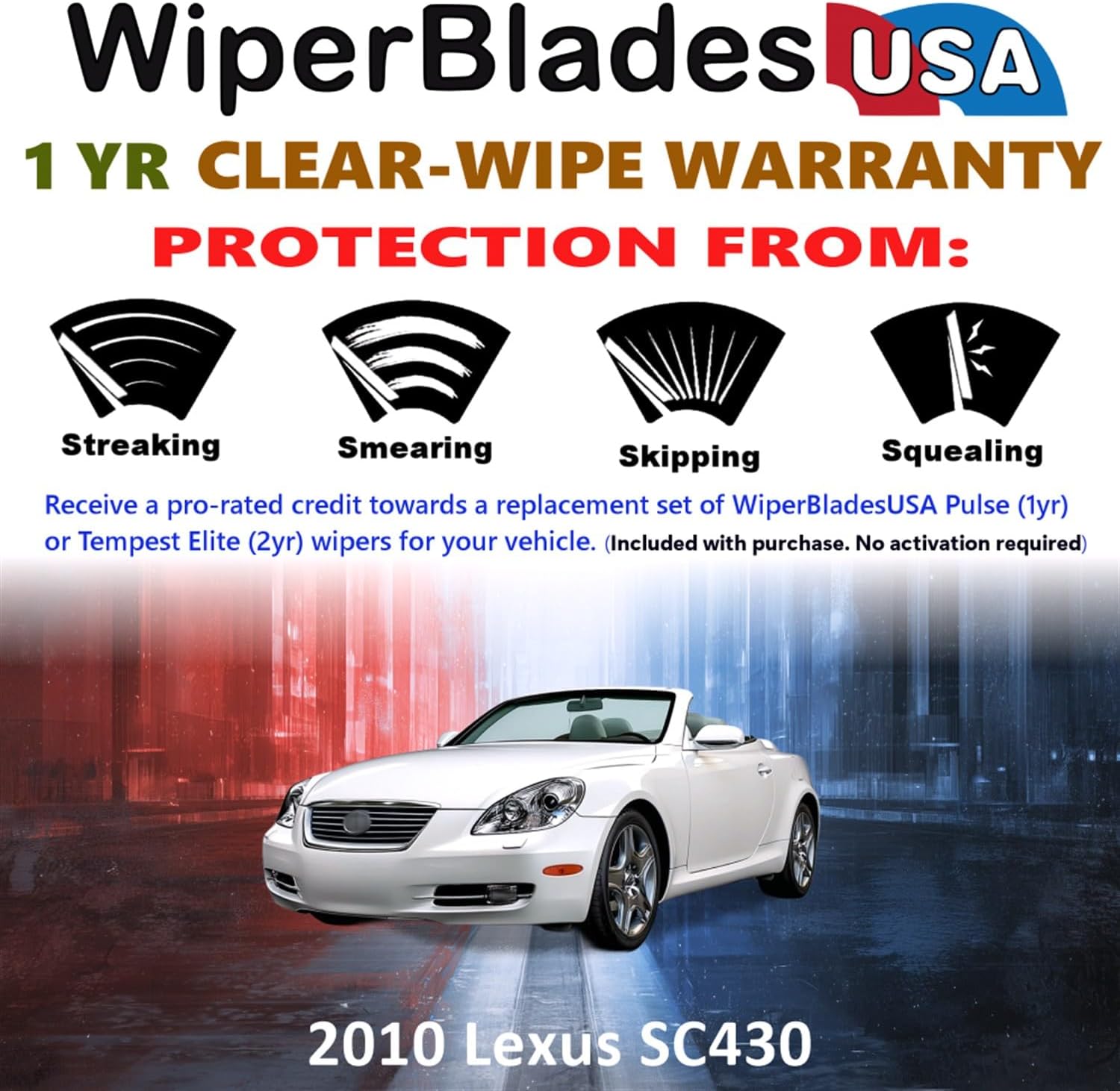 Pulse Beam wiper blades wipers set +Trico ExactFit Rear wiper compatible with Lexus TX350 2024WiperBladesUSA Beam Wiper Blades - Durable Flexible Beam Blade These WiperBladesUSA® beam wiper blades contour to the curvature of your windshield to provide even wiping pressure along the full length of the blade. These wiper blades have a 1 year Wiper Wear Warranty included. Meaning if they stop keeping you safe you get a credit towards a fresh pair. (See Details) When WiperBladesUSA says "We Got You" we want to make sure you keep good working wipers on your car. Every day. All the time. These beam wiper blades are designed to be compatible with Lexus TX350 2024 Virtually streak-free visibility Great wipers to have in rain, sleet and snow1 year "Clear-Wipe Warranty"Smooth, chatter-free wipe is a result of the specially blended teflon rubber bladeEnhanced flexibility and grip from the durable, rubber-encased substructureSignificant noise reduction and wind lift through a built-in aerodynamic spoiler to keep the wiper on the windshield at freeway speedsAll weather tough wiper blades with a synthetic rubber squeegee that will withstand even the most extreme weather conditionsPrevents ice and snow build-up through the elimination of exposed metal components. Easy Installation: Included in the bundle are directions (w/video) to simple and easy to use step-by-step installation on to your vehicle