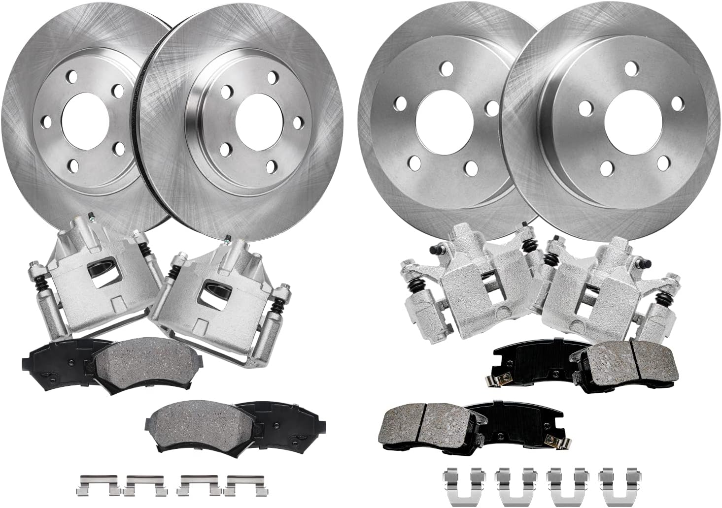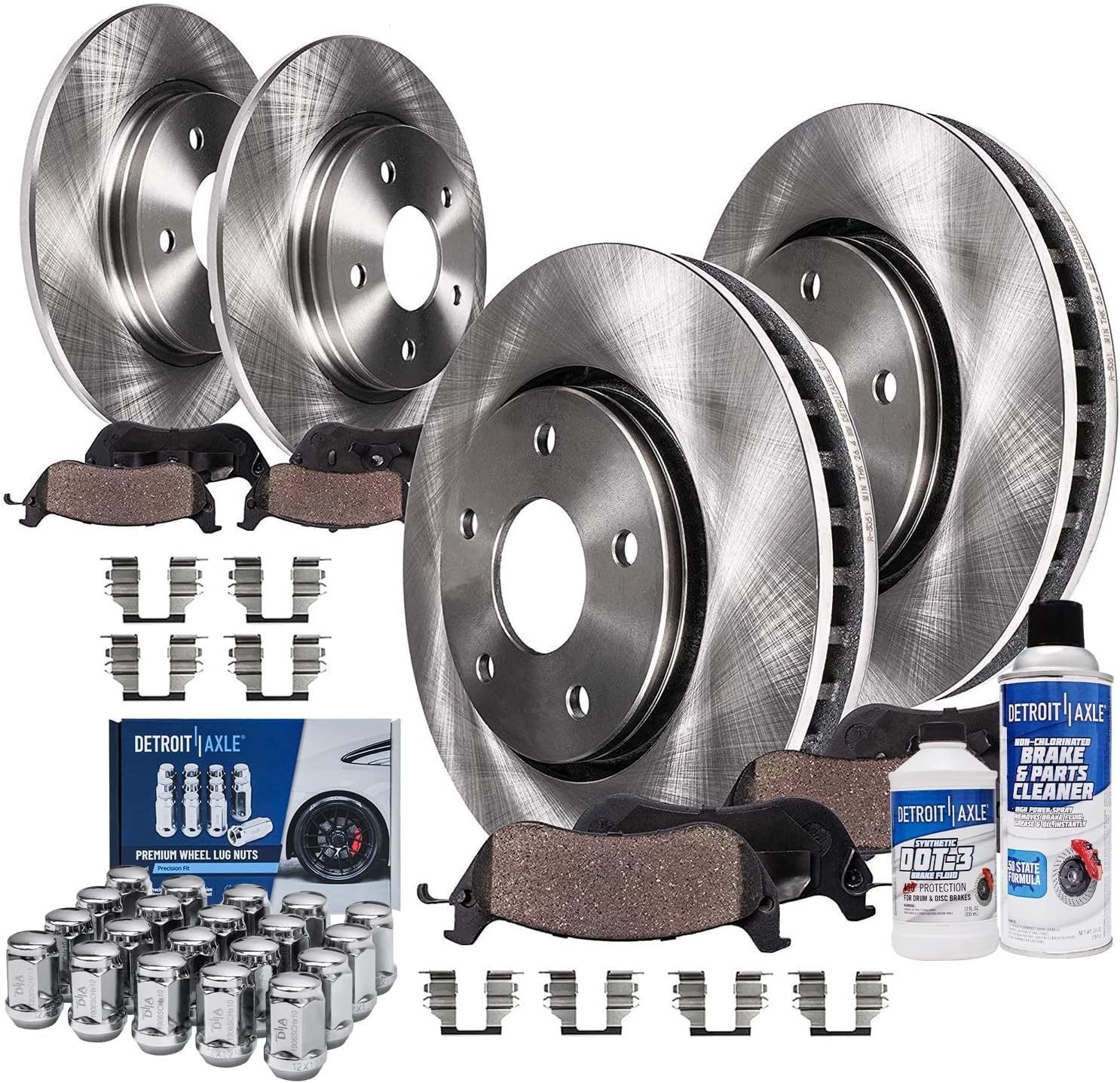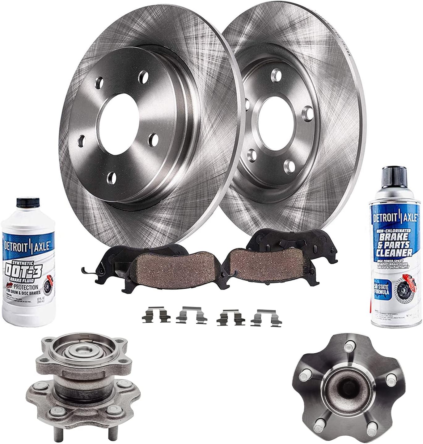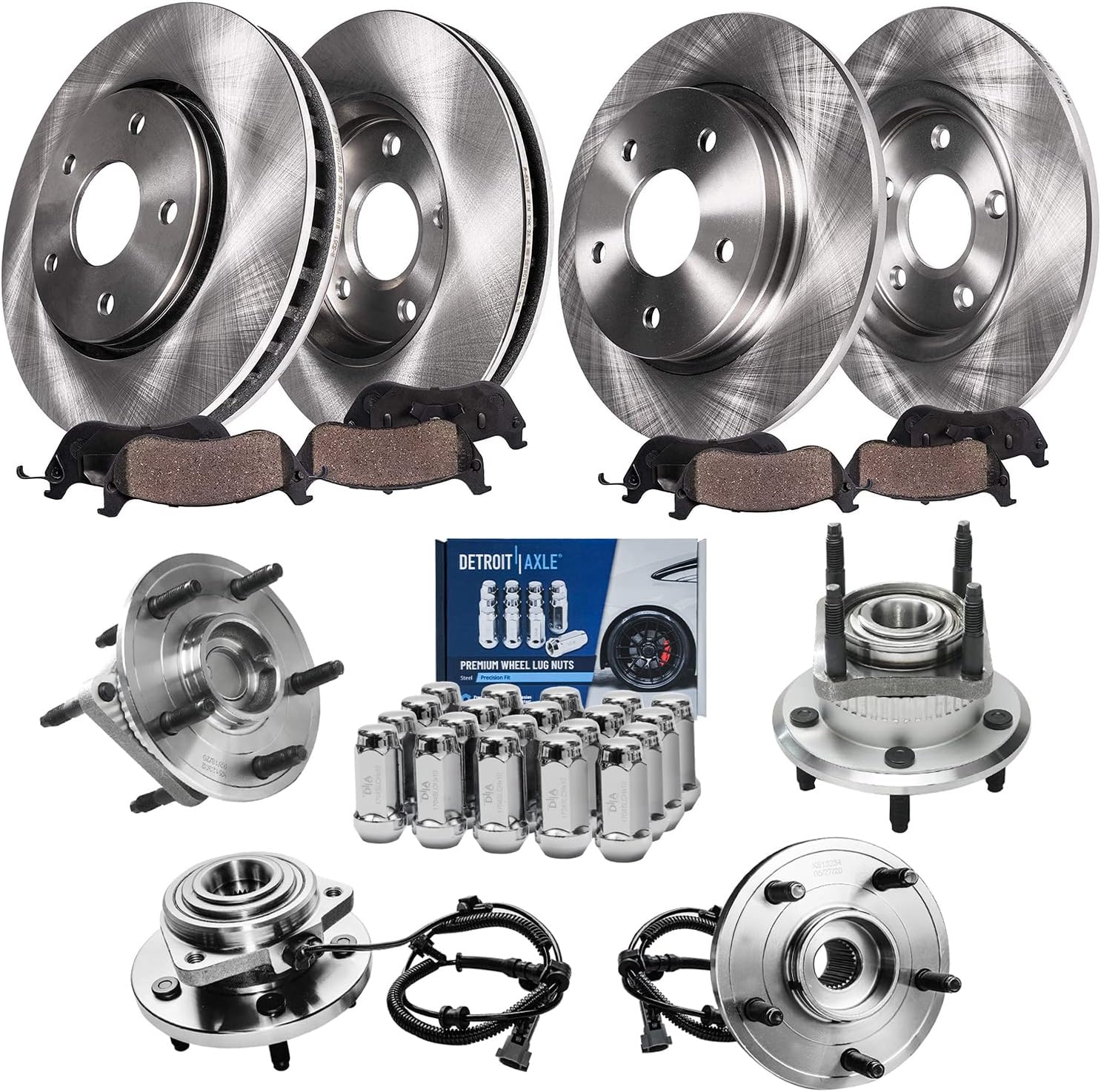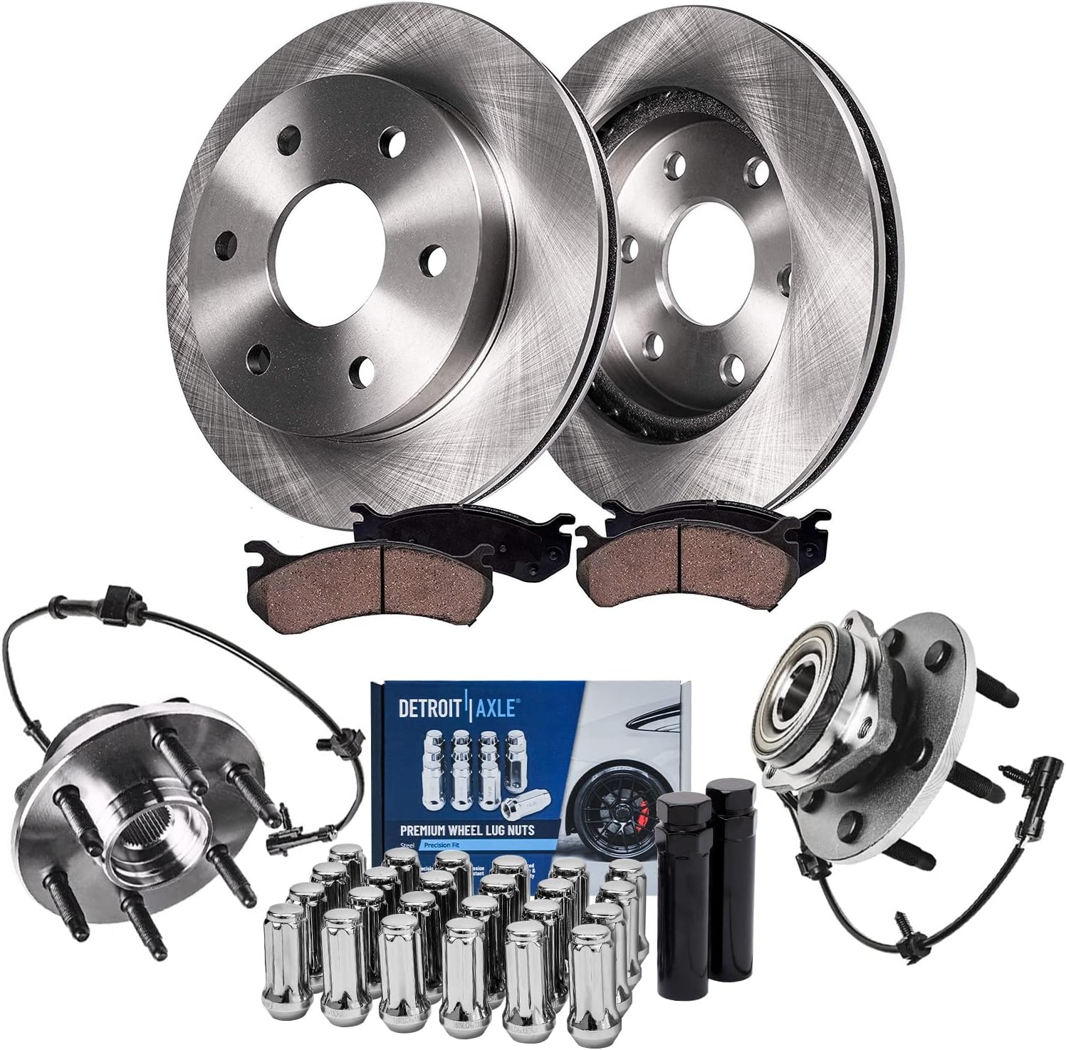 Kit Includes: 2x Front Wheel Bearing & Hub Assembly - 513121 2x Both Front Disc Brake Rotors - R-55034 2x Front Ceramic Brake Pads - P-699 1x 10oz Brake Cleaner & 1x 12oz Brake FluidFitment: Replacement for 2000-2004 Buick Lesabre (Fits Models Originally Equipped w/16" wheels from the factory (Please check the sticker on the driver's side door to verify before purchasing)) Replacement for 2005 Buick Lesabre (To Vin #5U129025) Replacement for 1997-2004 Buick Park Avenue Replacement for 1997-1999 Buick Riviera Replacement for 1997-1999 Cadillac Deville (4-Wheel Disc; Brake Code JL9; without Heavy Duty Brakes) Replacement for 2000-2004 Cadillac Deville (5 Stud; Brake Code JL9; w/Standard Brakes; without Heavy Duty Brakes) Replacement for 2005 Cadillac Deville (5 Stud; Brake Code JL9; without Heavy Duty Brakes; To Vin # 1G6KD54X25U129028) Replacement for 1997-2002 Cadillac Eldorado Replacement for 1997 Cadillac Seville Replacement for 2000-2004 Chevrolet Impala (4-Wheel ABS) Replacement for 2005 Chevrolet Impala (To VIN #59143075; 4-Wheel ABS) Replacement for 2000-2004 Chevrolet Monte Carlo Replacement for 2005 Chevrolet Monte Carlo (To Vin #59143075) Replacement for 1997-1999 Oldsmobile Aurora Replacement for 2001-2003 Oldsmobile Aurora Replacement for 1998-1999 Oldsmobile Intrigue (11.92 Inch (303mm) Front Rotor; Fits Models with JA9 Heavy Brakes ONLY [WILL NOT FIT MODELS WITH STANDARD JB9 BRAKES]) Replacement for 2000-2004 Pontiac Bonneville (SLE) Replacement for 2000-2003 Pontiac Bonneville (SSEi) Replacement for 2005 Pontiac Bonneville (To Vin #5U129027; Excluding GXP)