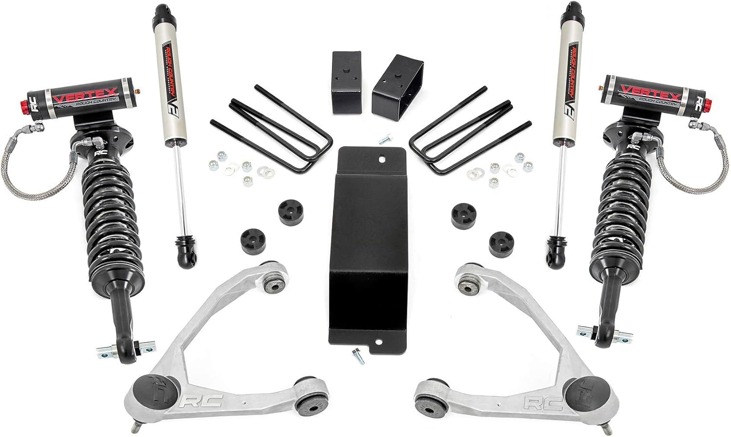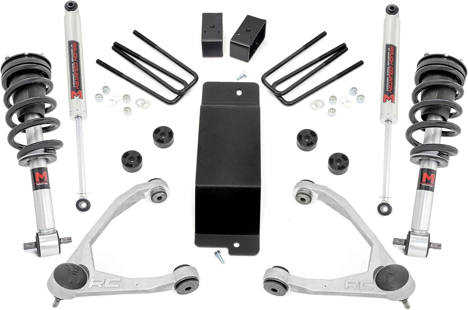 Conquer Trails with Confidence - Lift, Level, and Lead the Pack: Take your off-road capability to the next level with this all-inclusive Rough Country Lift Kit, engineered for superior performance and rugged durability. Whether you're eyeing a set of oversized tires or just want the extra clearance to navigate rocks and ruts, this kit delivers unbeatable value and versatility. Gain the height you need to dominate uneven terrain and clear large obstacles without sacrificing ride quality. Plus, when you're ready to revert to stock height, the fully reversible design makes it easy to return to factory specs.Optimized Axle Geometry for Driveline Longevity: With included differential drops, this kit helps maintain proper axle angles, reducing wear and tear on vital components while enhancing overall driveline performance. High-Articulation Forged Control Arms - Get superior flexibility and simplified installation with POM ball joints already pre-installed. These heavy-duty arms boast a low-friction ball race and oversized joint design for maximum wheel articulation and a maintenance-free experience. For added style, the control arms are also available in a striking red finish-perfect for those looking to add a bold accent to their suspension setup. The fabricated steel rear blocks included in this kit provide unmatched strength and a longer service life-built to stand up to harsh conditions and off-road abuse.This kit fits models equipped with cast steel or cast aluminum factory control arms, but does not fit models with stamped steel control arms. Installation requires cutting and grinding, and includes a new lift block that replaces the factory block. This kit is not compatible with 2014–2016 Denali models equipped with Magnetic Ride Control, or models with the eAssist (ECO Hybrid) package due to additional drivetrain components and sensor placement. If your vehicle has a mass damper on the front differential, it must be removed to allow adequate clearance when lowering the differential. When retaining factory wheels, we recommend using tires no wider than 11.5 inches. For aggressive sidewall tires or to retain factory wheels, a 0.25" wheel spacer may be required for additional clearance.