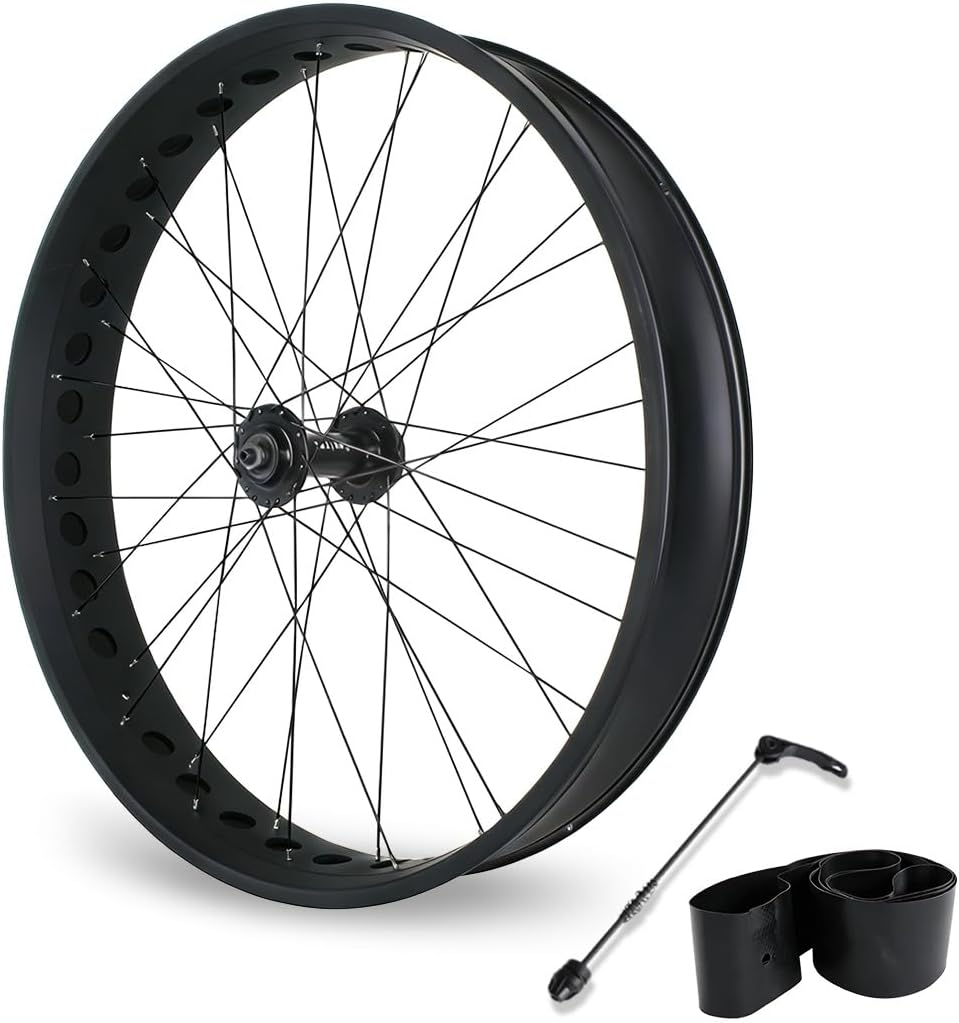 26 Inch Fat Bike Rims 4.0/4.9'' Tire Snow Bike Rear Wheel Aluminum Alloy Beach Bike Wheelset Disc Brake Hubs 135mm/190mm for 7-12 Speed Fat BikeProduct: Fat Bike WheelsetColor: Anodized blackSize: 26 inchRim: Aluminum alloy double layer rimRim Inner:100mmValve:A/V Schrader valveAxle: QR AxleHub:6 bolt disc brake hubSpoke: 36H Spoke , 14G High Carbon Steel ,with extended copper headHub Bearings: front 2 sealed bearings, rear 2 sealed bearingsHub spacing:Front 135mm, Rear 190mmTire Compatibility: 26*4.0/4.9 inch Wide TireRear Hub Compatible freewheel: for 7/8/9/10/11/12s cassette(7-speed needs a Spacer)Application: 26'' Snow Bikes/Fat Bike/Beach Bike/ebikeWheel Weight: Front Wheel About 1.6kg/Rear Wheel About 1.8kgPackage Content:1*Front Wheel or 1*Rear Wheel or 1*Pair of WheelsAccessories: Quick Release Levers and Nylon Tire PadsPlease note:--Please check the details in our list carefully according to the actual condition of your bike to make sure you buy the fit Bike Wheel Set.--Due to size specifications for manual measurement, so please allow for slight error, lighting in photography may cause color differences from real life. --If you have any questions, please contact us, we will solve it for you within 24 hours.