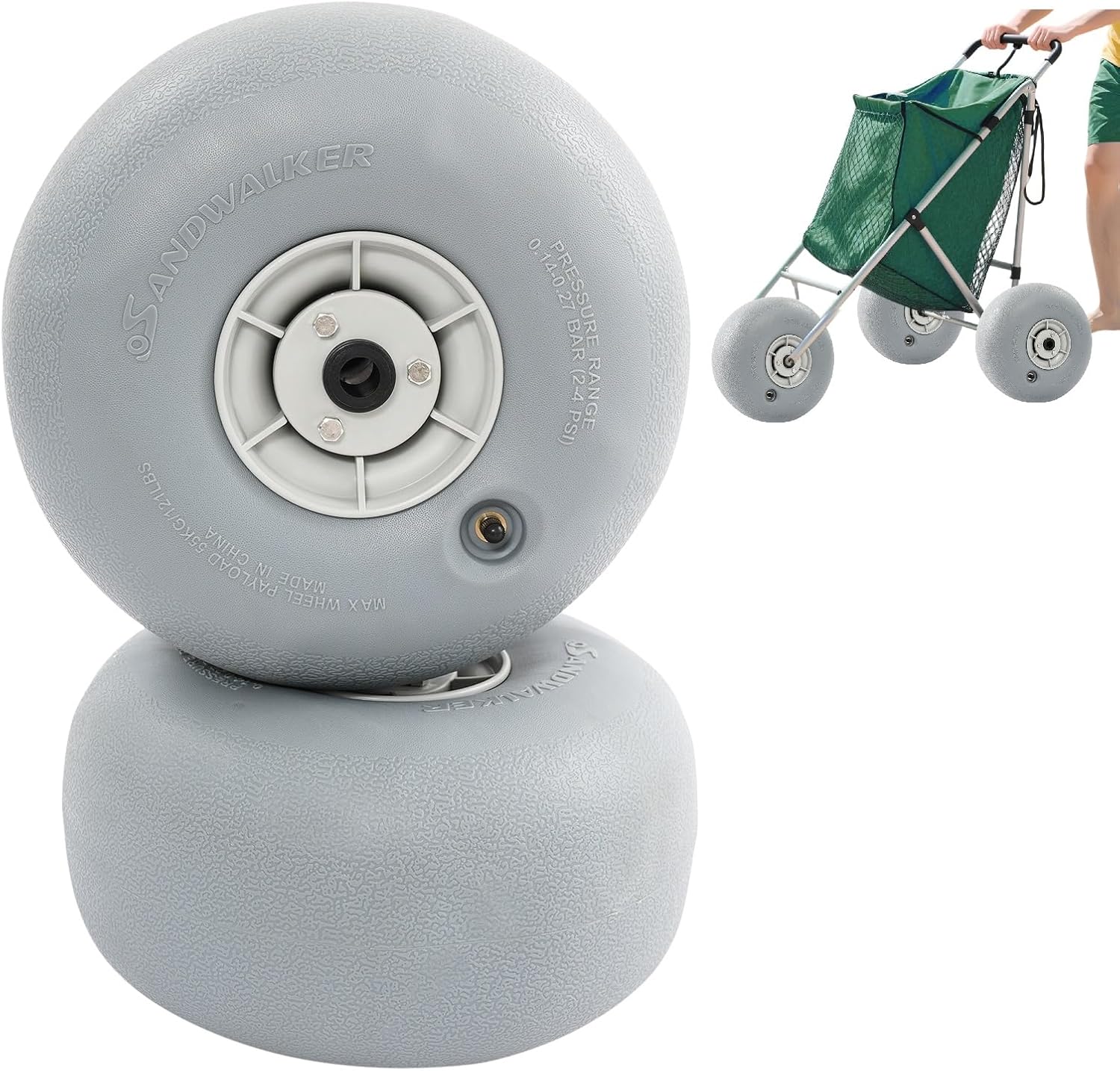 DescriptionThis inflatable beach wheel is designed specifically for outdoor activities and beach travel and is made of premium PU with excellent durability and wear resistance. With these wheels, your sand cart will move easily and transport smoothly. Whether used for beach carts, fishing carts, or other outdoor carts, this inflatable beach wheel is your ideal choice, making your outdoor activities more convenient and enjoyable.ApplicationThis beach cart balloon wheels are suitable for beaches, gravel fields, mud fields, etc. The beach wagon wheels can be installed on garden carts, beach carts, and kayak carts. The kayak cart wheels are versatile, making the beach cart tires an ideal companion for beach trips, camping, fishing, and gardening.SpecificationMaterial: PU, Brass, Stainless SteelColor: GreyStyle: ModernInstallation Required: YesNumber of Pieces: 2Pressure Range: 0.14-0.2Bar(2-3PSI)Working Temperature Range: -15~75 ℃/5~167℉Each Wheel Size(D*H): 22.86*12.7cm/9*5inMounting Part Diameter: 16mm/0.63inEach Wheel Max. Load Capacity: 45kg/99.21lbsPackage Size: 28*18*18cm/11.02*7.09*7.09inGross Weight: 1.9kg/4.19lbsNet Weight: 1.8kg/3.97lbsPackage Included2* Balloon Beach Sand Tires1* English Manual1* Tape MeasureNotes1. Please note that this package only includes wheels, without beach carts.2. Please note that this product is a low-pressure wheel, do not inflate it excessively, and do not use an air pump for inflation.3. Please measure your cart's axle before purchase, then select the proper size you need.4. Please allow the slight color difference caused by the shooting light and 1-3cm error due to manual measurement, and make sure you do not mind before ordering.