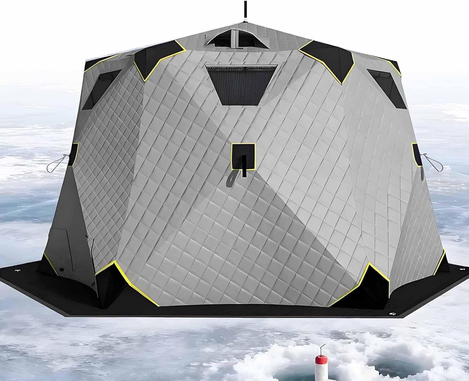 Designed for Outdoor Fishing – This tent is engineered for warmth, durability, and practicality, making it suitable for multiple seasons and scenarios.*SpecificationsTop Width: Approx. 120 cmInterior Height: Approx. 180 cmInner Diagonal Length: Approx. 330 cmInner Side Length: Approx. 165 cmSnow Skirt Width: Approx. 20 cmConfiguration: 2 doors, 5 windows, fits 6–8 peopleWeight: Approx. 22 kgIncluded Accessories: Ice fishing mat, 6 ice anchors, 6 wind ropes, portable carry bag (approx. 130CM×32CM)*Structure1. Quick Setup – Automatically unfolds, no assembly required.2. Stable Design – D-shaped door with triangular reinforcement and thickened support poles for wind resistance.3. Easy to Pack – Compact when folded for convenient transport.*Warmth & Adaptability1. Thickened Material – 4-layer construction with hollow cotton for insulation, windproofing, and snow resistance.2. Ventilation Options – Windows feature breathable mesh and can be adjusted for airflow or warmth, suitable for all seasons.*Durability & Build1. Reinforced Frame – Quick-setup design with sturdy poles for stability in wind.2. Strengthened Corners – Reinforced Oxford fabric at top and bottom for wear resistance.3. Extended Snow Skirt – Enhances warmth and wind protection during fishing.*Versatile UseIce fishing tent for winter ice fishing, family camping, and outdoor fishing, designed to withstand harsh weather including snow and wind.*Notes1. Slight variations of 1–3 cm may occur due to manual measurement.2. Product color may differ slightly from images due to lighting and display settings.