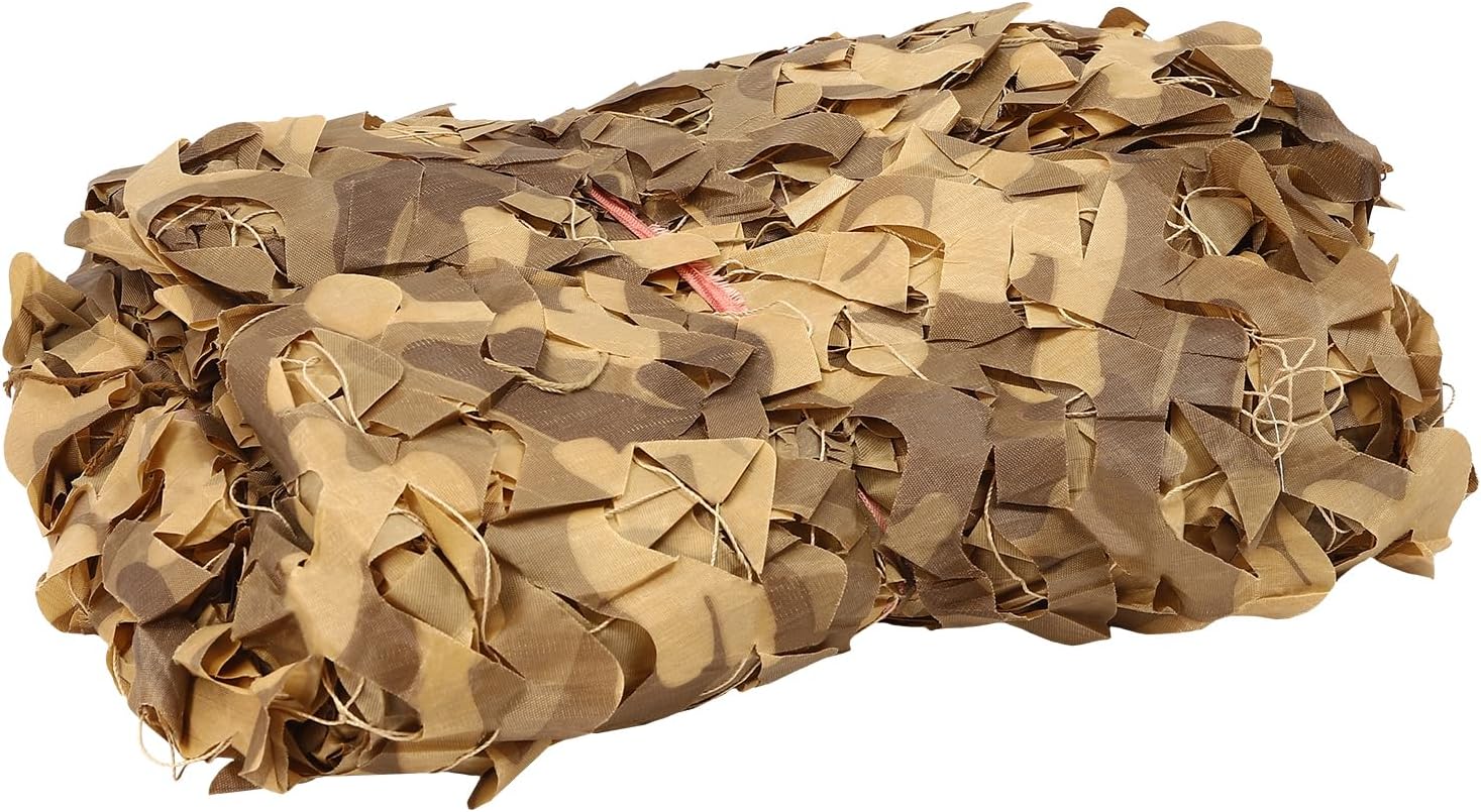 SpecificationMaterial: Durable polyester fabricColor: CamouflageSize: 800cmx800cm (26FT*26FT)Package included:1 x Camouflage Net (8x8m) (with string net backing)Note:Edge binding and with mesh net reinforcement throughout the netThis camouflage net comes with Nylon string net backing, increases the strength and durability of the netting.