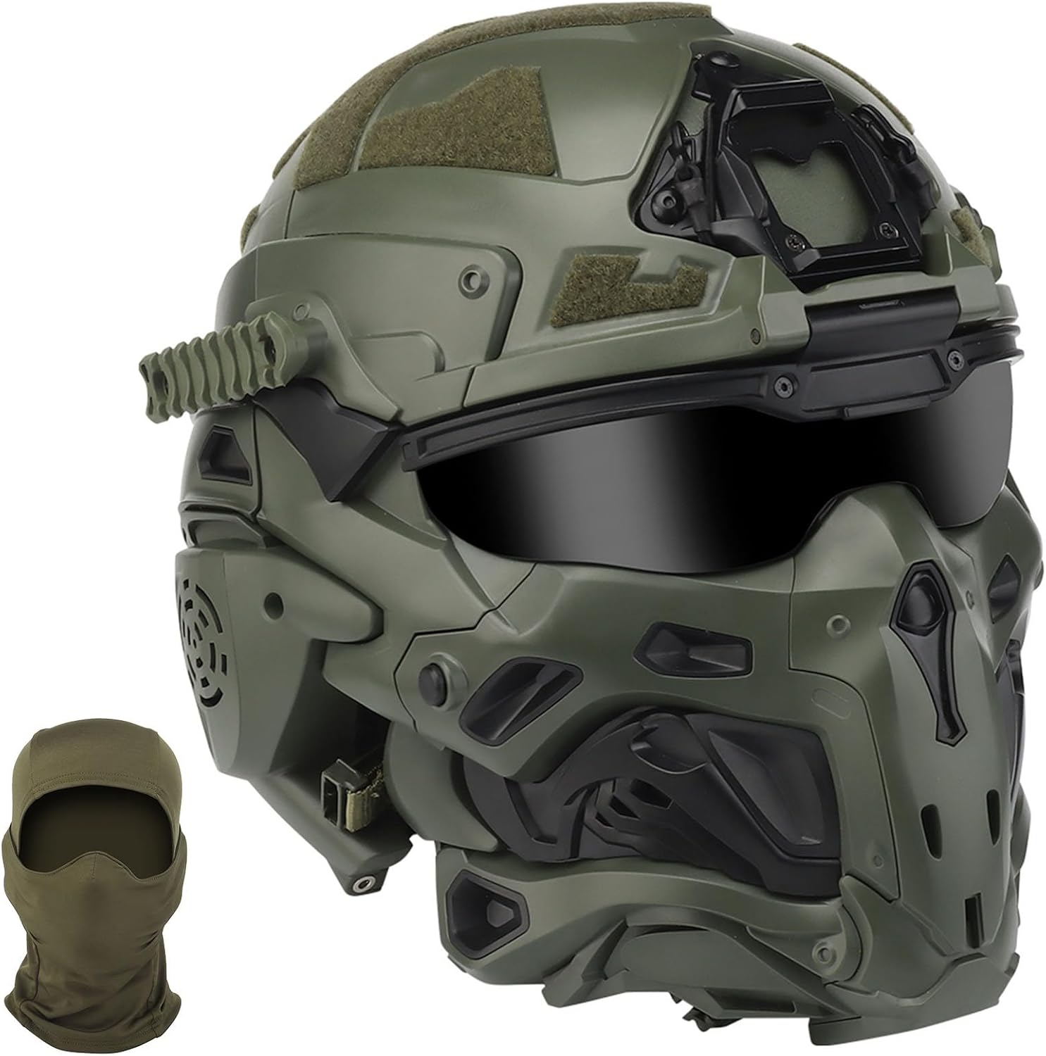 Product Name:Full-Face Protective Helmet with Flip-Up Goggles & Modular MaskMaterial:High-Impact Polymer Shell – Strong yet lightweight for enhanced protectionBreathable Padded Interior – Ensures comfort during extended wearAdjustable Strap System – Provides a secure fit for different head sizesKey Features:Impact-Resistant & Lightweight – Durable polymer shell offers protection without weighing you down.Adjustable & Secure Fit – Designed for 53-63 cm head circumference, with a cushioned interior and adjustable straps for maximum comfort.NVG Mount & Side Rails – Allows easy attachment of action cameras, tactical lights, and communication headsets for full customization.Ventilated & Breathable Design – Reduces heat buildup, keeping you cool during intense airsoft or paintball matches.Multi-Purpose Tactical Gear – Perfect for airsoft, paintball, tactical training, outdoor survival games, and cosplay.Suitable For:Airsoft & Paintball Players – Built for action-packed gameplay.Tactical Training & Simulations – Ideal for military-style exercises and drills.Cosplay & Film Production – Authentic design enhances realism for movies and role-playing.Outdoor Survival & Adventure – Reliable protection in extreme environments.Product Specifications:Size – Adjustable fit for 53-63 cm head circumferenceWeight – Approx. 1.7 kg, balancing durability and comfortAdditional Features – NVG mount, side rails for accessory attachments