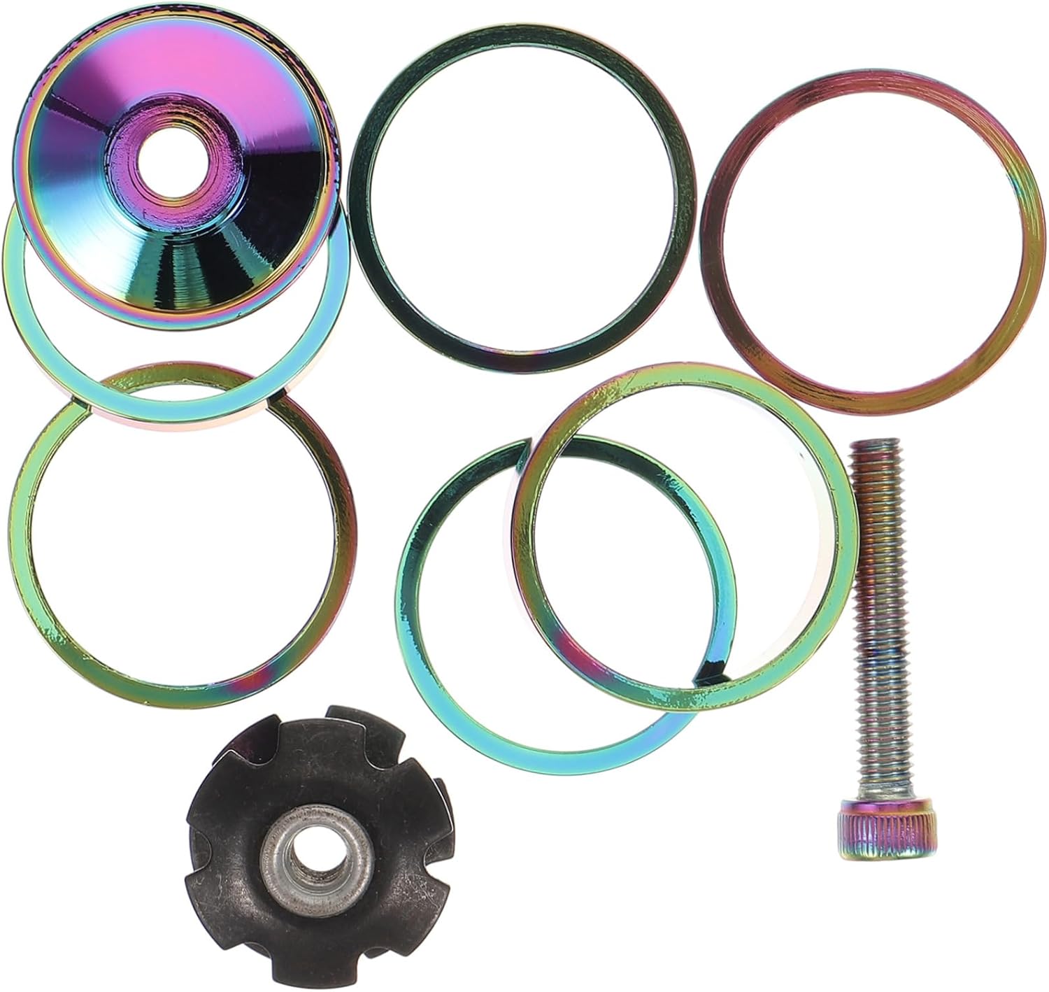 Package List 6 x Spacers 1 x Screw 1 x Hanging Core 1 x Cap Features -Size:3.40X3.40X1.00cm/1.34X1.34X0.39in professional headset spacer -Color:Assorted Color headset gasket -Material:Aluminum alloy bicycle headset gasket -Manufactured with sturdy aluminum alloy material, which can withstand for a long time bike supply. -With their sleek and modern design, these spacers can also add a touch of style to your bike, making it stand out from the crowd replaceable washer spacer. -Easy to install, not easy to deform, can adjust your grip, and it is suitable for most bikes small headset spacer. -Light weight, strength and well temperature resistance, impact resistance headset spacer. -With the fine and great workmanship, it can ensure its durability and practicality road bike stem spacer.Goods Descriptionsmall washer spacer With their sturdy construction, these spacers are a reliable and accessory for any cyclist.aluminum alloy headset spacer Our headset spacers are made from aluminum alloy material, which makes them resistant to wear and tear and ensures that they can be used for a long time without breaking or fading
