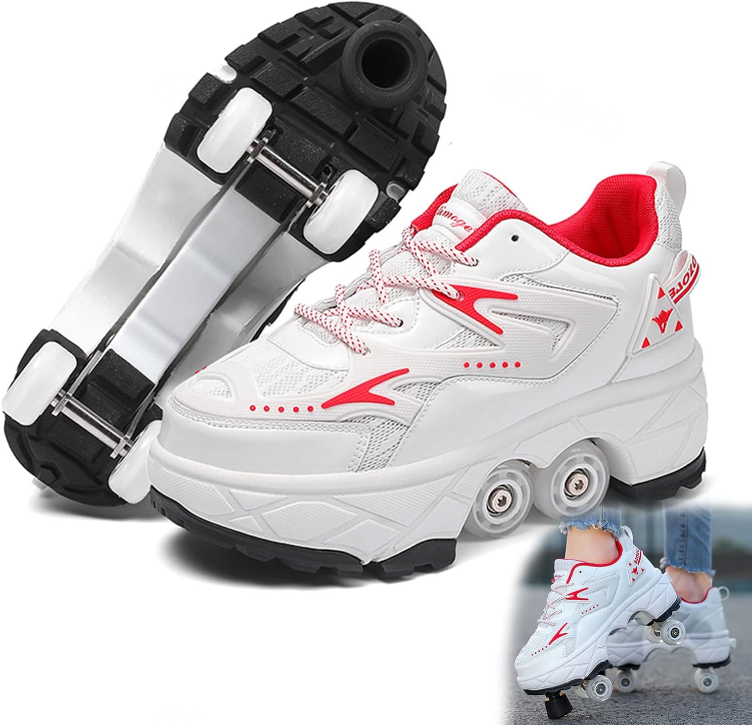 ▶Instructions for use: 1.Press the safety button behind the heel and the wheels can be automatically deployed 2.Press the safety button behind the heel to retract the wheel, and then turn the safety button to lock▶Description: Product name:roller skate shoes Wheel type: 4 wheels Closure: Paste buckle+Elastic band Heel Height: 3 centimetres Shoe Width: Medium Applicable: Children, boys, girls, teenagers Applicable scenarios: Training, athletic, sports, fun, skating,party, disco,birthday gift.▶Package: Roller skate shoes x1✔Size selection: It is recommended to choose according to your current situation. If your feet are slightly wider, it is recommended to choose a larger size. If you prefer to wear loose shoes, it is also recommended to choose a larger size.▶NOTE: 1.It is recommended that beginners not use inline wheels on lanes, slopes, greasy or stagnant ground 2.Please wear a helmet and protective gears when you are skating. 3.For safety reasons, children must be accompanied by adults when wearing these shoes.