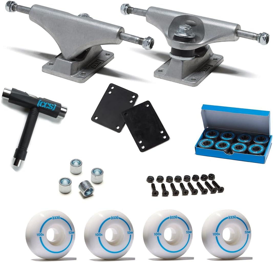 | Model Name | [CCS] Skateboard Assembly Kit | Professional Grade | Set of 2 Trucks | 100A Wheels | ABEC 7 Bearings | 1" Mounting Hardware | 1/8" Riser Pads | Bearing Spacers |