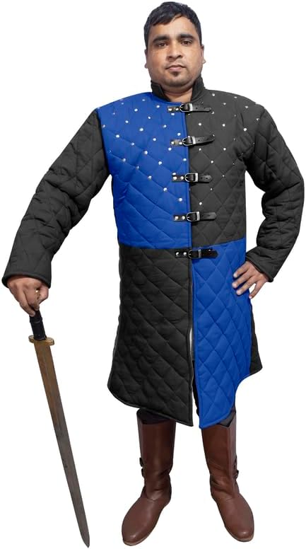 The MEDIEVALS provides a wide range custom size, colours, pattern, different cloths like woollen, cotton, Linen, Leather or all combined with different padding /cushion as par standard Proper Padded arming Gambeson/Aketon wish to wear under steel plate or chainmail Armor. When worn by itself it is comfortable to wear. The elbow pads are internal with a different ancient medieval time horn/bone/wood button, Fabric coveNavy Blue buttons This amazingly flexible and comfortable gambeson OR Aketon jacket Armor can be worn at theatre plays, as movie costumes and at various festivals as well. It can be used as a birthday or an anniversary gift for individuals interested in archery, Armor, etc. RETURN & REFUND: Smooth 30 Days return with Full refund Guaranteed,” if there are any Manufacturing Defect in Product “ ABOUT PRODUCT :- A gambeson (also known as aketon, padded jack, pourpoint, or arming doublet) is a padded defensive jacket, worn as armor separately, or combined with mail or plate armor. Gambesons were produced with a sewing technique called quilting. They were usually constructed of cotton, linen or wool; the stuffing varied, and could be for example scrap cloth Sheet or Cotton Sheet or Cotton Blend During the 14th century, illustrations usually show buttons or laces up the front. An arming doublet (also called aketon) worn under armor, particularly plate armor of fifteenth- and sixteenth-century in Europe, contains arming points for attaching plates. Fifteenth century examples may include mail goussets or heavy cloth padding sewn into the elbows and armpits to protect the wearer in locations not coveNavy Blue by plate.THANKS FOR THE MEDIEVALS !!
