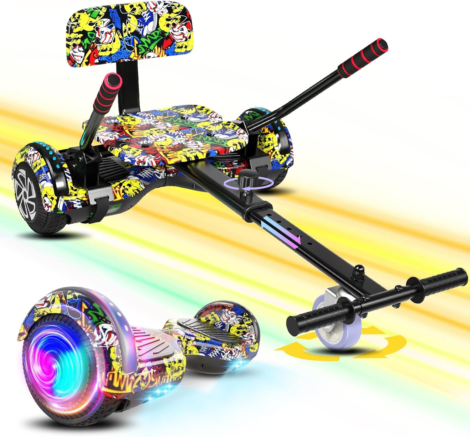 Scooter with Seat Attachment for Kids Adults, 6.5'' 8.5''Balancing Scooter with Bluetooth Speakers & Colorful LED Light with Kart