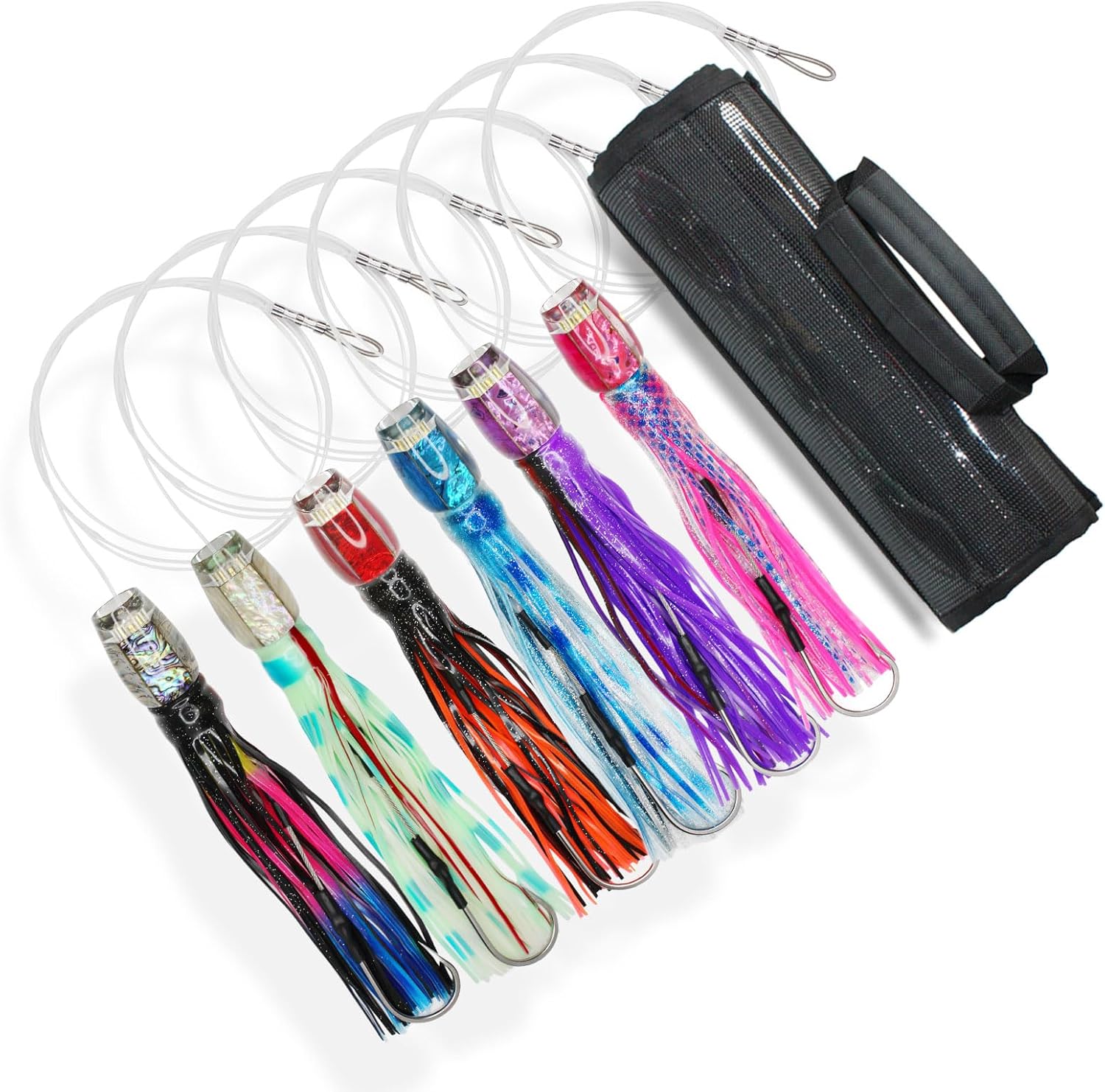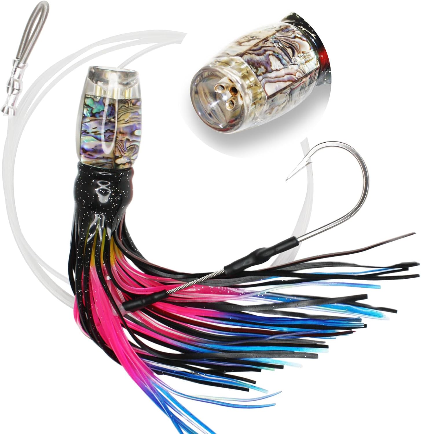 Our trolling lures are made of specialized resin that resists chipping and yellowing,sturdy and durable, designed for large fish such as marlin tuna mahi mahi wahoo sailfish dolphin.Our pre-rigged trolling lures are built to target trophy fish. Featuring a vibrant resin head with genuine abalone shell for intense flash, a durable colored rubber skirt for irresistible action, and sharp stainless-steel hooks for a solid hookset.