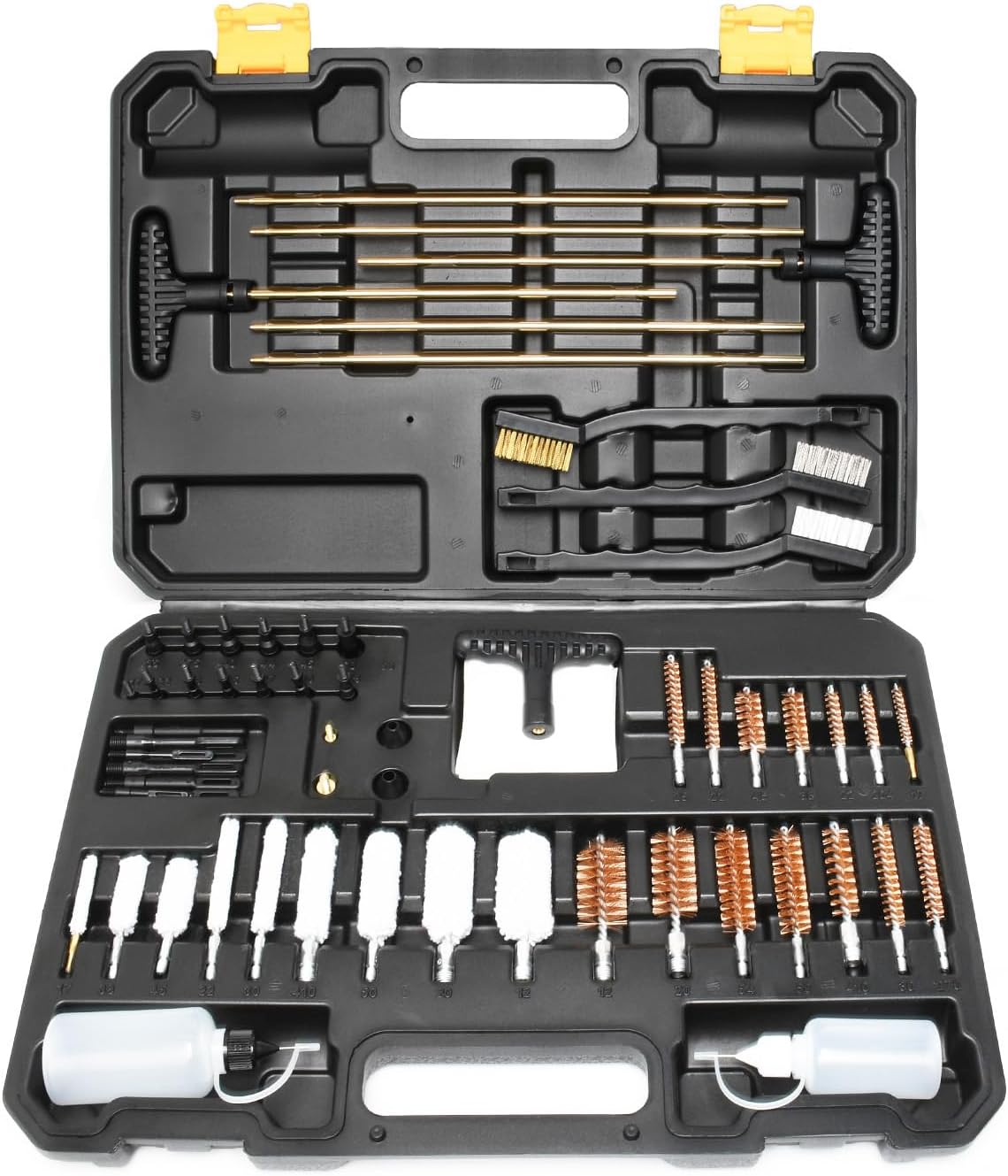 | Included Components | 6 solid brass gun rods for multiple gauges and calibers in the rifle cleaning kit, 13 spear pointed gun jags, 5 nylon brushes, 9 cotton mops, 14 bronze brushes,2 chamber brushes, 2 muzzle guards, 8 slotted patch loops, 2 accessory adapters, 100 cleaning patches, 2 wire ropes, 1 plastic handle, and 2 oil bottles (empty) |
