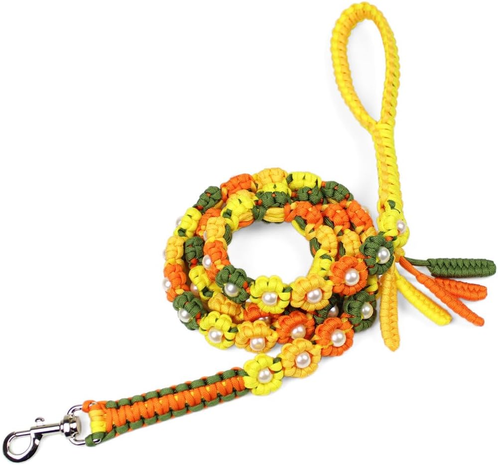 Add a splash of vibrant style to your daily dog walks with this stunning handcrafted macrame leash. Featuring an eye-catching array of turquoise, purple, pink, and orange flower designs intricately woven throughout the length, this unique leash combines beauty with functionality. Each delicate flower is adorned with a pearl-like bead at its center, creating an elegant shimmer as you and your furry friend stroll together. The durable macrame construction provides a secure grip while the sturdy metal clasp ensures your pet's safety. This decorative leash isn't just a practical accessory - it's a fashion statement that will make both you and your dog stand out at the park, on walks, or during special occasions. The multicolored design complements any coat color and adds a cheerful, artistic touch to your pet accessories collection. The intricate knotwork demonstrates superior craftsmanship, making each leash a unique piece that combines style with reliable performance for your daily walking routine.
