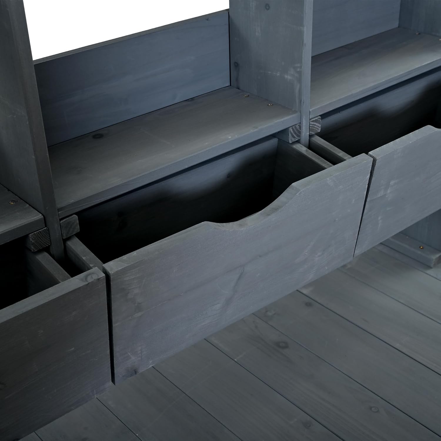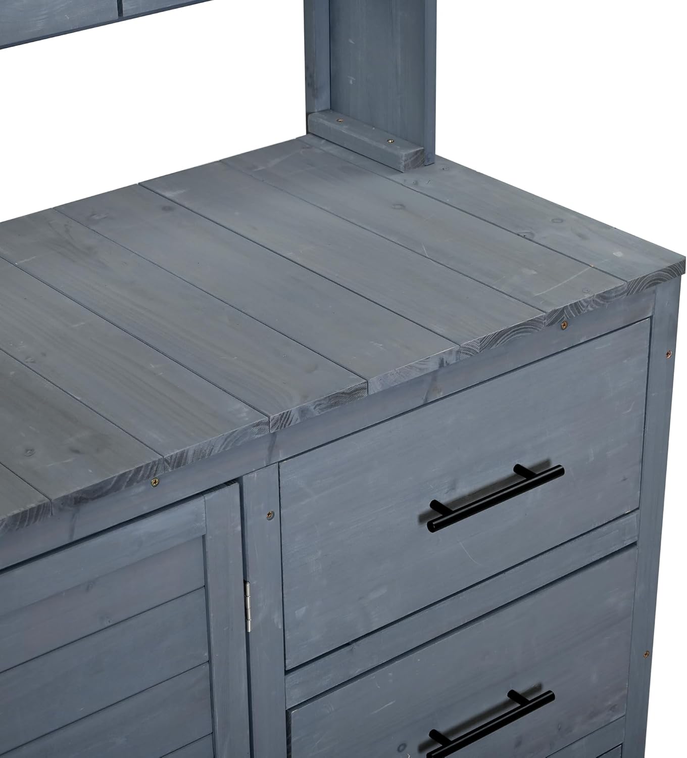 Create a functional outdoor workspace with this farmhouse style potting bench featuring a spacious countertop, upper storage hutch, drawers, and cabinet storage. Built with a durable solid wood frame, it provides ample space for organizing gardening tools, plants, and supplies. Designed for versatility, it works as a garden potting bench, outdoor kitchen island, or BBQ prep table, perfect for patios, gardens, and backyard workstations