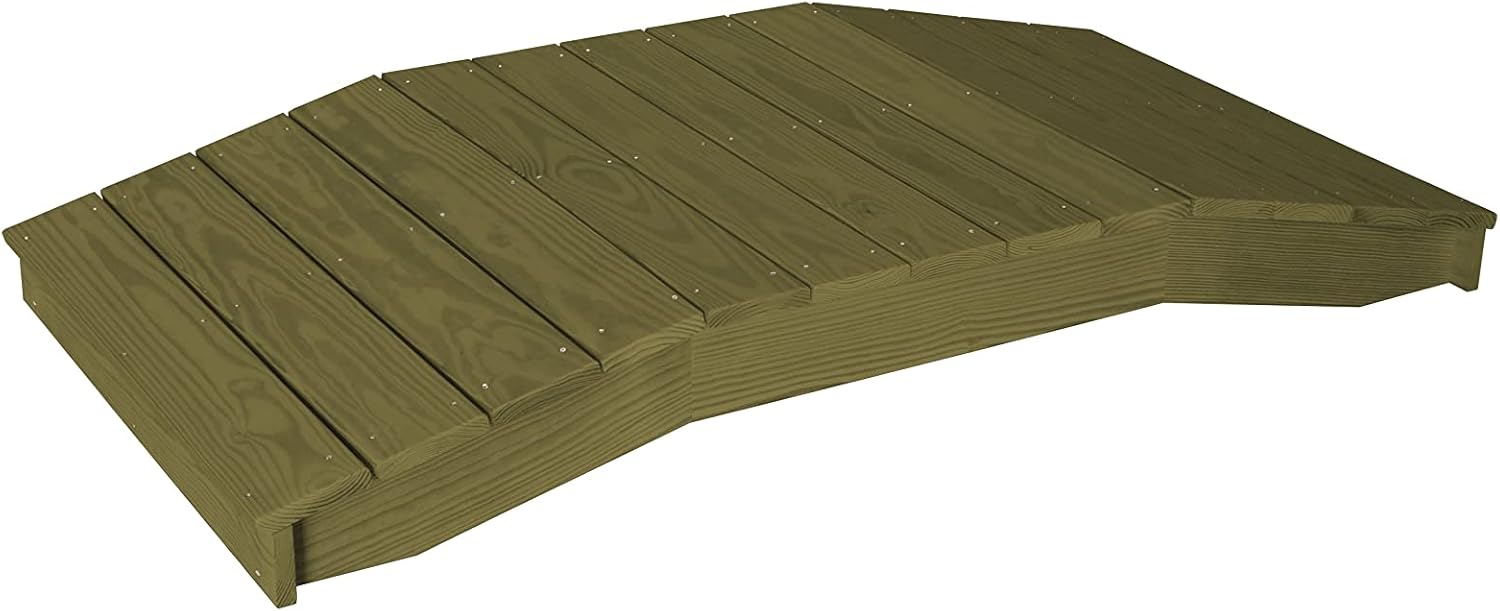 Hand-built in the USA by Amish craftsmen, this wood plank bridge is made of pressure-treated yellow pine. Overall, it measures 36" wide by 96" long and is 9" tall at its highest point. On the underside of the bridge, the central arch is 79" long with 8.5" base at each end. On the top side of the bridge, the flat center section is 32" long with 32" angled sections at each end. The pine plank boards are finished with Natural-Kote eco-friendly, low-VOC soy-based gray stain.