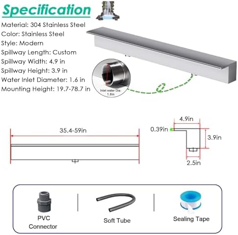 Transform your outdoor or indoor space with our premium Waterfall Spillway, designed to elevate your water feature experience. Crafted from high-quality 304 stainless steel, this modern spillway is built to last, resisting rust and corrosion, making it ideal for both indoor and outdoor environments. Measuring 4.9 inches in width and 3.9 inches in height, it fits seamlessly into various applications such as formal falls, privacy walls, patio fountains, and indoor waterfalls. Gone are the days of worrying about poor quality or intermittent water flow. Our Waterfall Spillway features integral welding and a wide open outlet that ensures a consistent and smooth water flow, creating a stunning visual effect reminiscent of a natural waterfall. The bottom connection design simplifies installation, allowing you to customize the height between 19.7 to 78.7 inches to perfectly fit your setup. Whether you’re enhancing your swimming pool, rockery, or wall-mounted feature, this solid metal waterfall not only adds elegance but also provides a soothing auditory experience with the gentle sound of cascading water. Please note that the water pump is not included; you will need to provide one for installation. Enjoy the tranquility of nature in your own backyard or living space with our easy-to-assemble Waterfall Spillway. The package includes everything you need for a straightforward setup: 1 Waterfall Spillway, 1 PVC Connector, 1 Soft Tube, and 1 Sealing Tape. (Please note that decorations shown in the pictures are not included.) Reimagine your space and indulge in the calming ambiance of flowing water today!