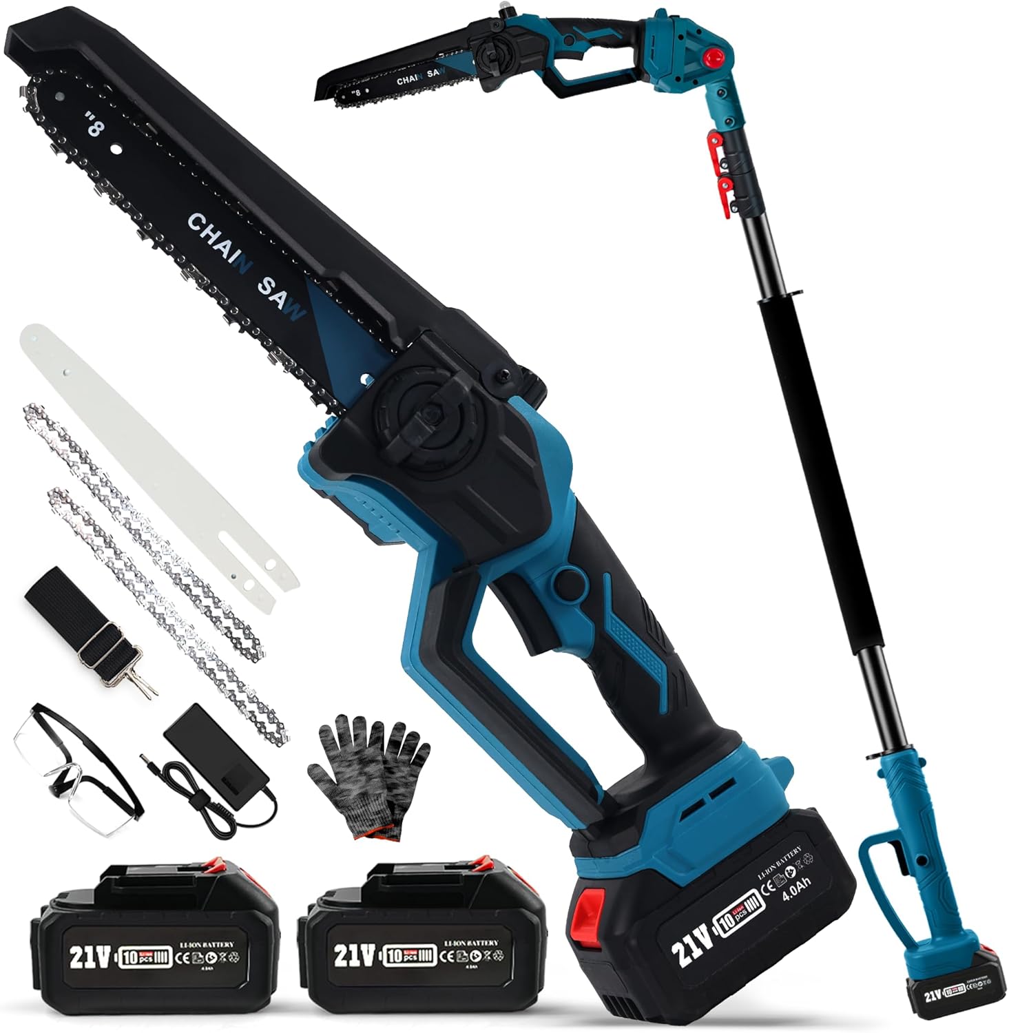 | Included Components | 1x 8 Inch Chainsaw, 1x Telescopic Pole, 2 x 4000mAh Batteries,1* Fast Charger,1x Manual Instruction, 3x Chain (One has been installed),2x Guide Plate (One has been installed), 1x Pole Shoulder Belt,1x Goggle, 1x Anti-Slip Glove |