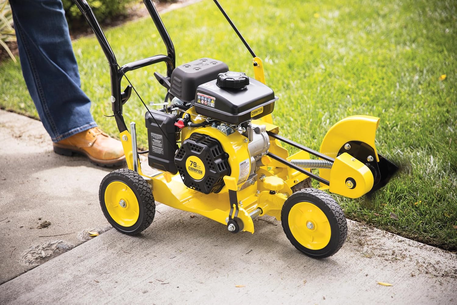The Champion Power Equipment 201465 9-Inch Lawn Edger combines power and performance perfectly, taking your property from overgrown to professionally edged in no time. The 79cc, 4-stroke OHV engine powers the 9-inch heavy-duty carbon steel blade as it tackles tough overgrowth. The depth adjustment includes 5 cutting depth settings from approximately ground level to 2.5 inches (63 mm) deep allowing you to choose the depth of edge you need. Do you need to edge along a curb? No worries. Thanks to the curb hop wheel adjustment, you can easily perfect your edging along any curb. The blade bevel angle adjustment makes this capable edger the perfect match for anyone who wants to create decorative edging along beds of mulch or flower beds. The blade bevel can be adjusted 15 degrees either to the left or the right. Champion’s compact and efficient design includes a conveniently located control lever, contoured to fit the soft grip ergonomic handle, allowing you to work at a comfortable and consistent pace. The 7-inch never flat wheels give you maximum mobility around your yard, allowing you to transport your edger across driveways and sidewalks with ease. Uncover and define your hard surfaces and give your lawn a clean, manicured look with Champion’s 9-Inch lawn edger. This unit holds 0.37 gallons of gasoline, has a 0.4-quart oil capacity and includes 10W-30 engine oil, an oil funnel, and a spark plug socket. This edger is EPA certified. Buy with confidence - Champion Support and our nationwide network of service centers will back your purchase up with a 2-year limited warranty and FREE lifetime technical support.