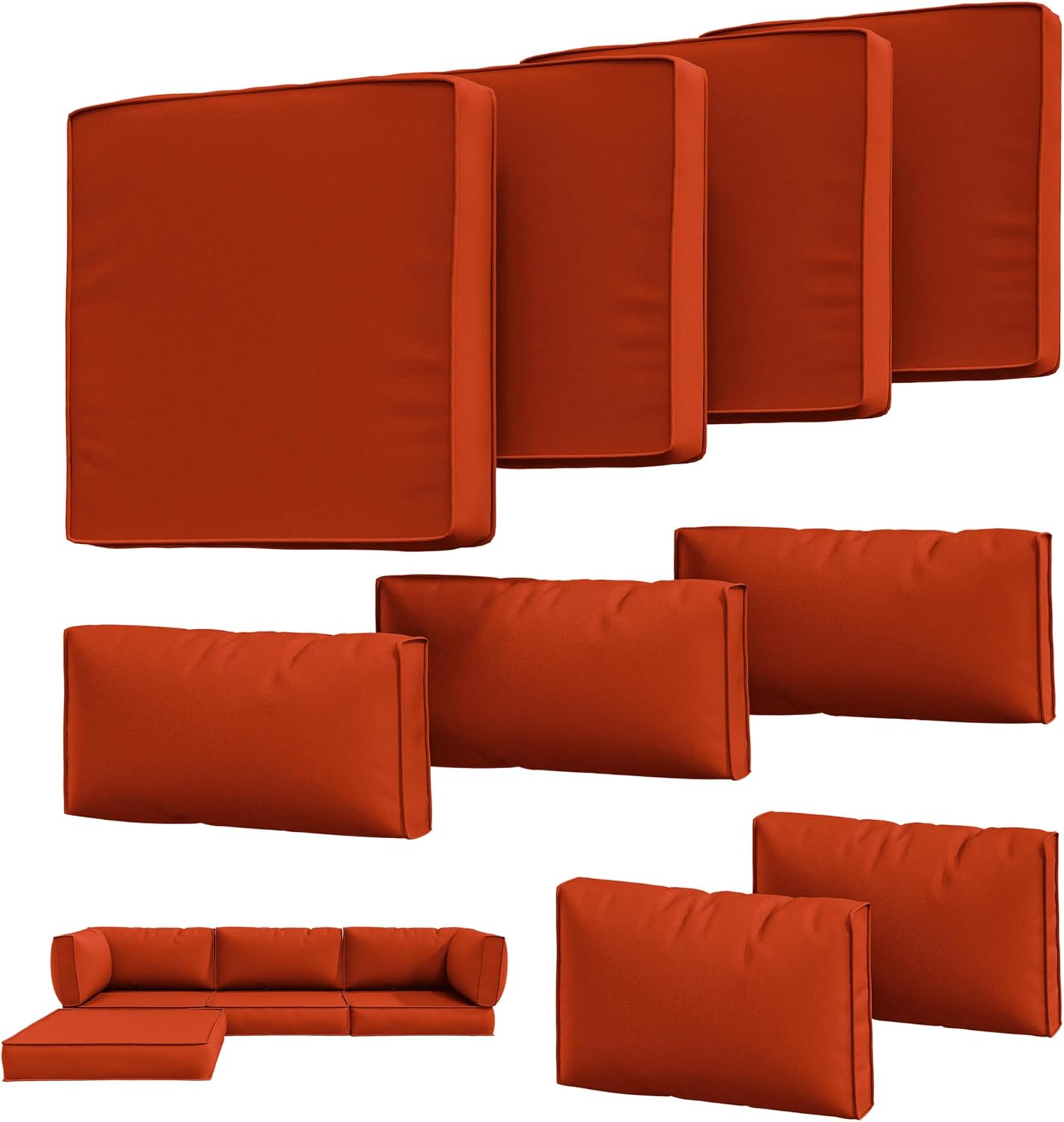 【Size】 Outdoor cushion covers include 9 sofa fabric covers, 1Pack -Seat cushion covers (29''Lx29''Wx3''H), 3Pack-Seat cushion covers (25.6''Lx25.6''Wx3''H) and 3Pack-Backrest pillow cushion covers (25.6'' Lx12.5''Wx4''H) and 2Pack-Backrest short pillow cushion cover (21.6''Lx12.5''Wx4''H)