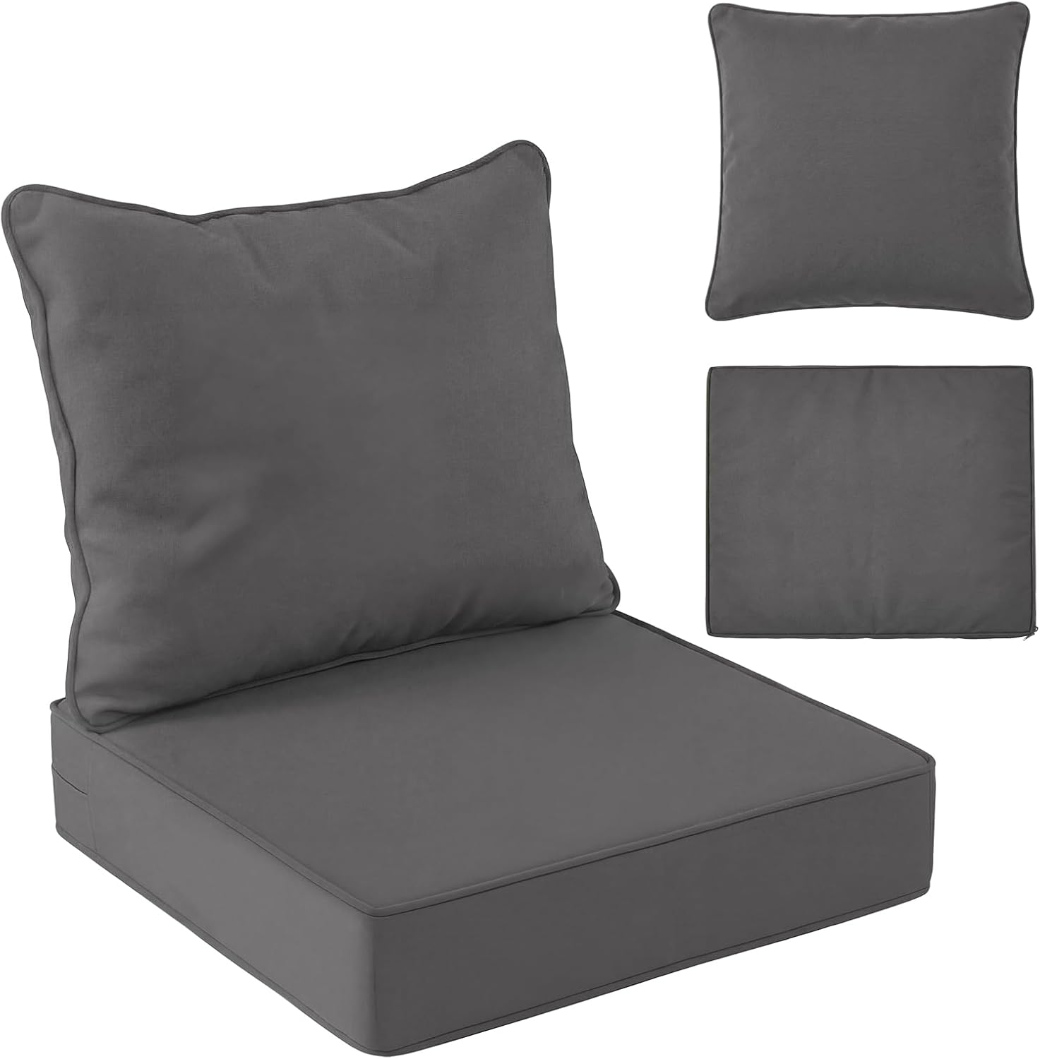 Features: Protect and refresh your outdoor seat cushions with these 24 x 24 x 4 inch outdoor cushion covers. Crafted with waterproof and UV resistant fabric, they help keep cushions dry and vibrant even in weather exposure. Smooth zipper closures make installation and cleaning effortless, and the durable material resists wear and tear. Ideal replacement patio cushion slipcovers for chairs, benches and sofas. Specifications: Material: Oxford fabric Color: gray Size: Seat cushion cover: 24 x 24 x 4 inches Back cushion cover: 24 x 20 inches Package includes: 2 x Outdoor seat cushion cover 2 x Outdoor back cushion cover Notes: Manual measurement, please allow slight errors on size. The color may exist a slight difference due to different screen displays.