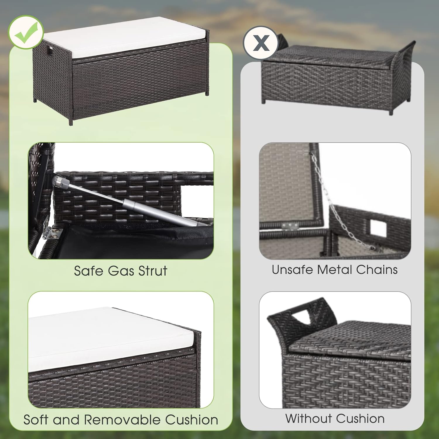 DescriptionThis 34 gallon deck box will be a perfect choice to store your outdoor accessories!With 34 gallon capacity, this outdoor storage container features large storage space to accommodate different items. And the waterproof zippered liner protects them from rain and dust for all-around protection. Vary from common boxes which feature unsafe metal chains, our storage container is equipped with safe gas struts that are labor-saving and child-friendly. And the triangular structures make them more stable. What’s more, our storage bin is designed with soft and removable cushion, providing a more comfortable sitting experience than those without cushions. In addition, this outdoor storage box is made of colorfast PE wicker and rustproof metal frame for a longer outdoor service time.Feature34 gallon inner capacity for cushions, garden tools and pool accessories, etcKeep the items dry and clean all the time thanks to its waterproof zippered linerLabor-saving gas struts for effortless lifting and soft closingUse it as a deck box, delivery box, side table and additional bench for different needsSupport up to 795 lbs strong bearing capacity for safe sittingRemovable and washable cushion cover for great convenienceHand-woven mix brown PE wicker for weather resistance and sun protectionMake the storage bin more stable with sturdy and rustproof metal frameConvenient to transport this deck box with cut-out handlesSimple to assembleSpecificationColor of PE Rattan: Mix BrownMaterial: PE Rattan, Metal, Polyester, FoamOverall Dimension: 40” x 19” x 17” (L x W x H)Inner Dimension: 38” x 17.5” x 12” (L x W x H)Net Weight: 22 lbsCapacity: 34 GallonWeight Capacity for Seating: 795 lbsWeight Capacity of Inner Space: 66 lbsPackage Includes:1 x Deck Storage Box1 x Cushion1 x Instruction