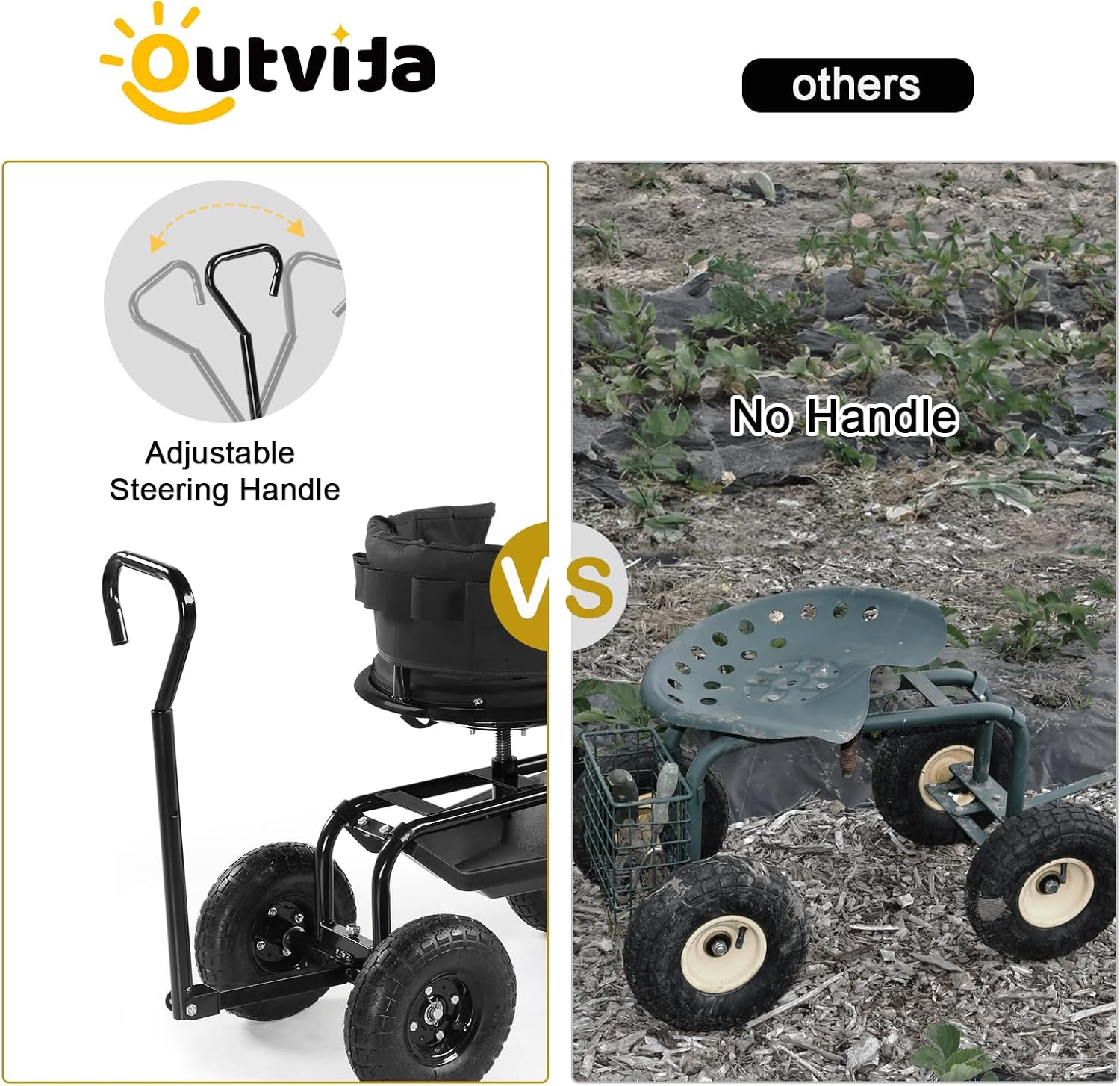 Last spring, my knees gave out after a morning of weeding flower beds. I knew I needed something better. This rolling garden seat changed everything. I sit on the cushioned seat, adjust the handle to my height, and glide across the yard. The 360° swivel lets me turn to grab my trowel from the basket behind me without standing up. When I hit a patch of gravel, the inflatable tires roll right over it. After I’m done, I park it in the garage—the steel frame wipes clean, and everything stores right on the cart. Whether you’re planting tomatoes or pruning hedges, this rolling stool with back support keeps you moving without the aches. Specifications Main Color: Black Main Material: Powder‑Coated Steel Overall Dimensions (LxWxH): 17.30" x 31.70" x 17.7–20.30" Seat Dimensions: 17.7" x 13.4" Seat Height Adjustment: 5.9 inches Handle Length: 19.3" – 32.3" Wheel Diameter: 10 inches (inflatable) Basket Dimensions: 9.3" x 4.3" x 7.9" Net Weight: 33.1 lbs Package Includes: 1 x Rolling Garden Cart, 1 x Hardware Set, 1 x Manual
